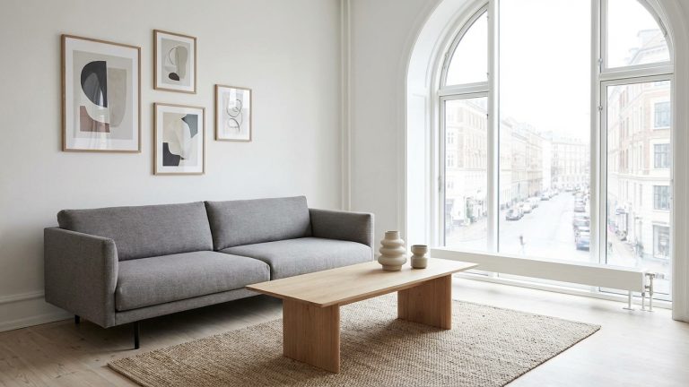 Træ er fundamentet. Lyst træ som eg, ask eller bøg bringer varme uden at dominere. Undgå mørke træsorter som valnød eller mahogni, de passer ikke til den skandinaviske æstetik.