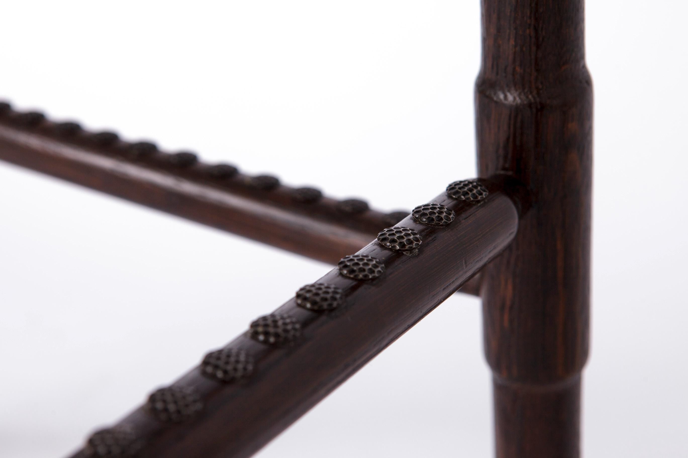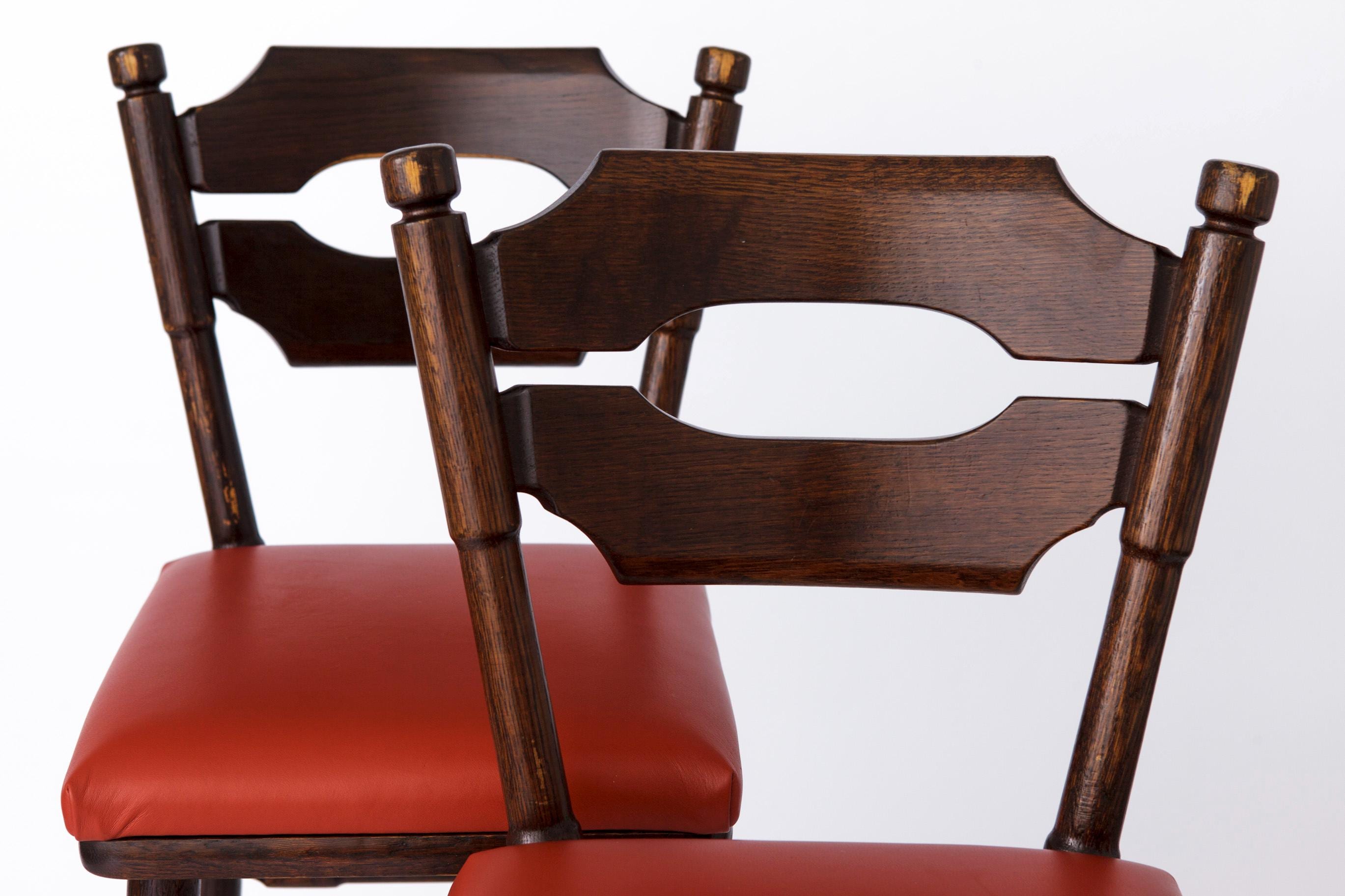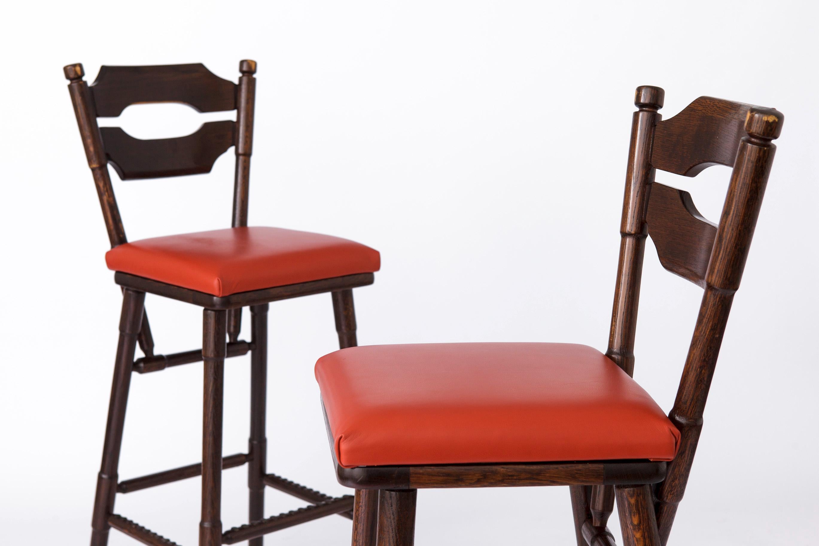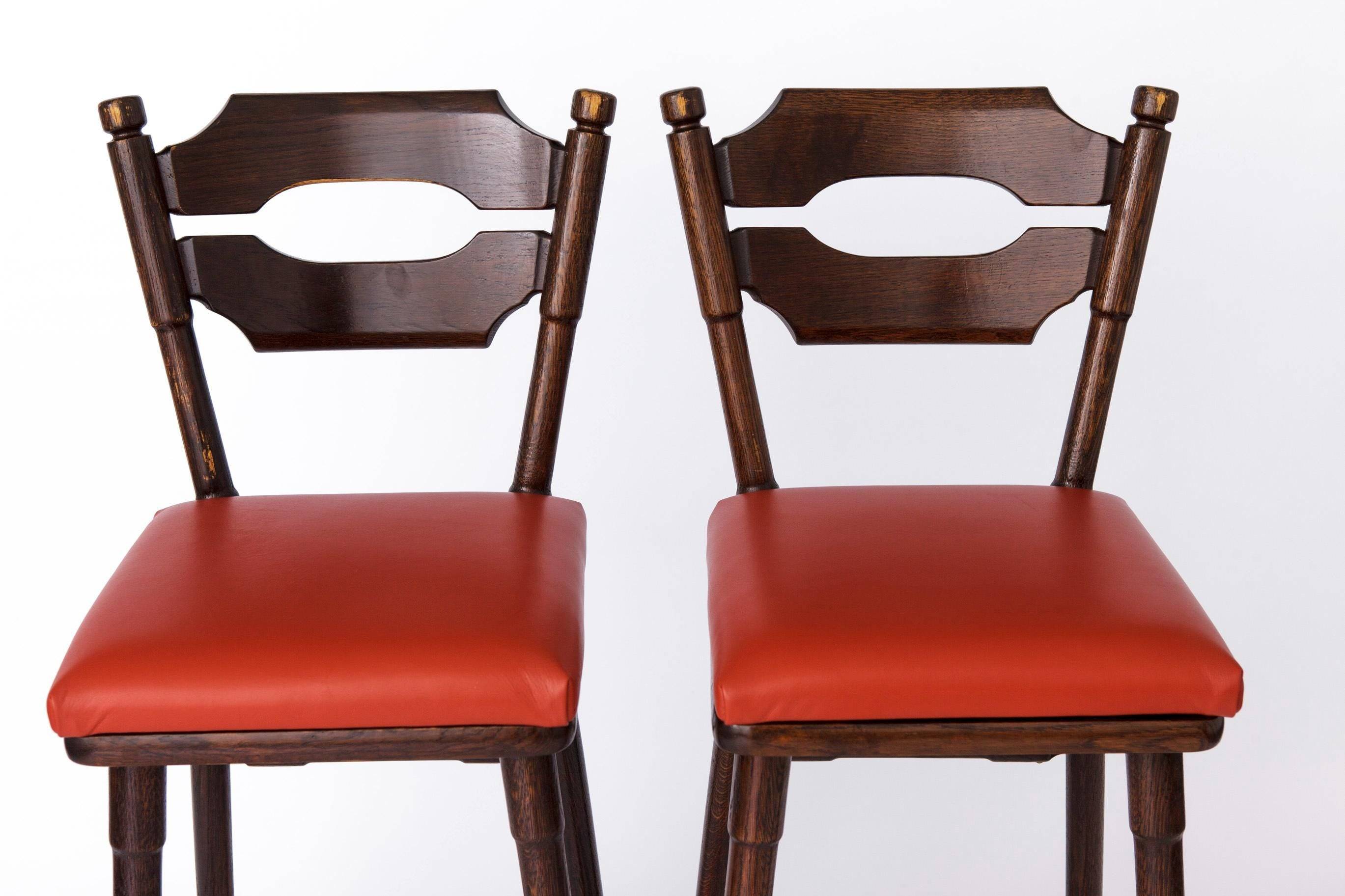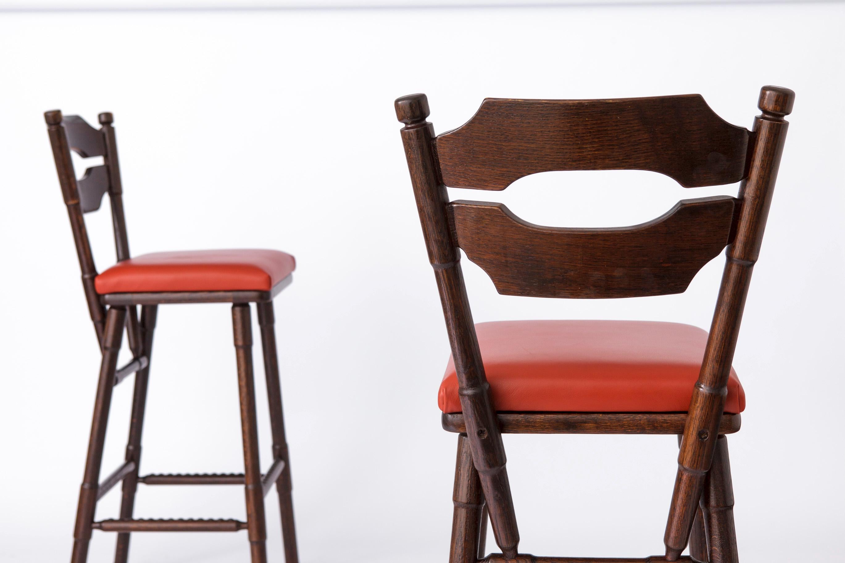 Stellet er udført i indfarvet bøg eller birk, nænsomt olieret for at fremhæve træets naturlige glød. Sæderne er nybetrukket med ægte læder i en varm rød-orange nuance, som giver et livligt og stilfuldt modspil til træets tone.