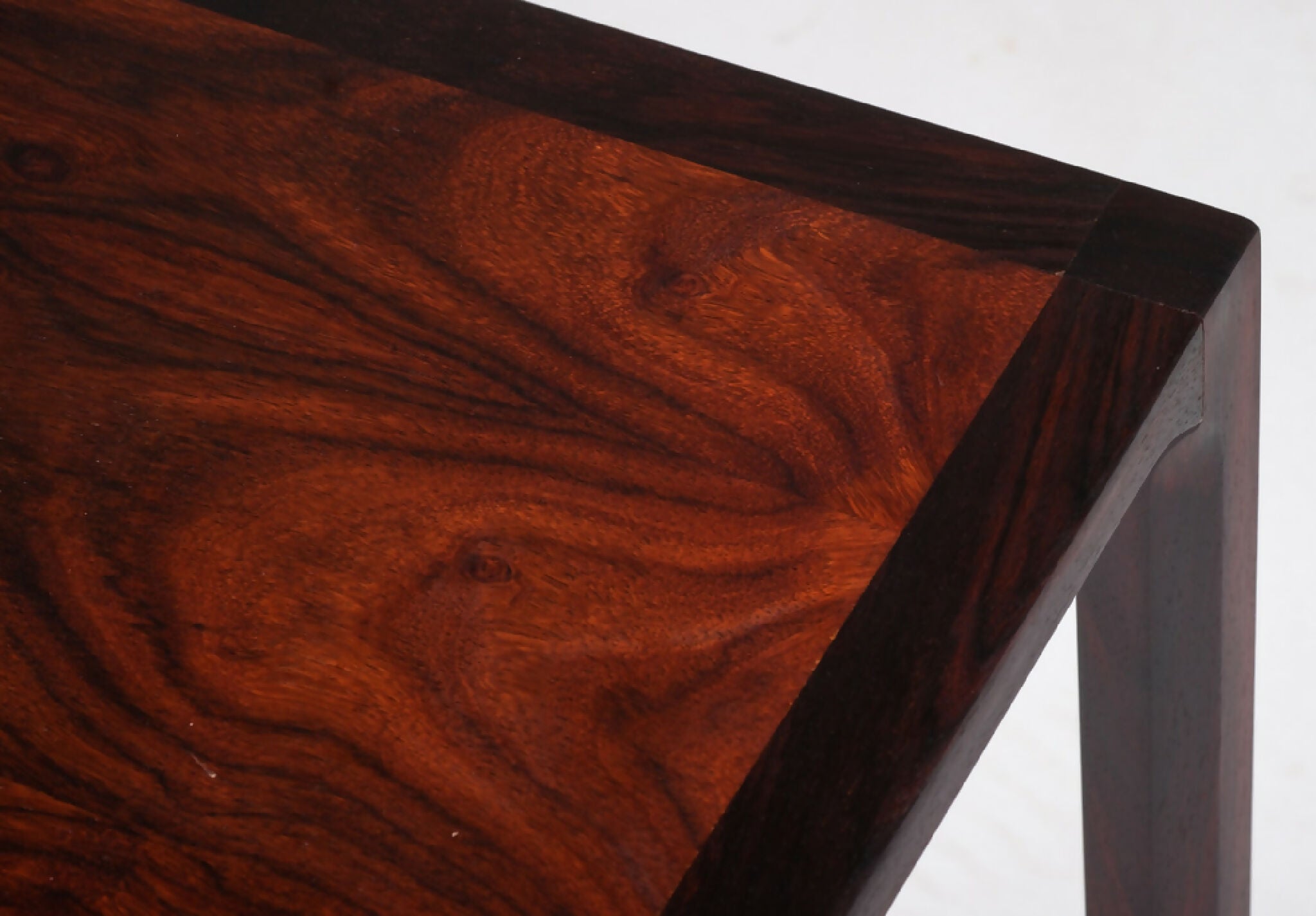 Model sidebord designet af Aksel Kjersgaard. Udført med stel i massiv palisander og bordplade i palisanderfinér med markant årestruktur. Formsproget er enkelt og velproportioneret, kendetegnende for Kjersgaards arbejde i 1960’erne, hvor materialekvalitet og præcise snedkerdetaljer er i fokus.