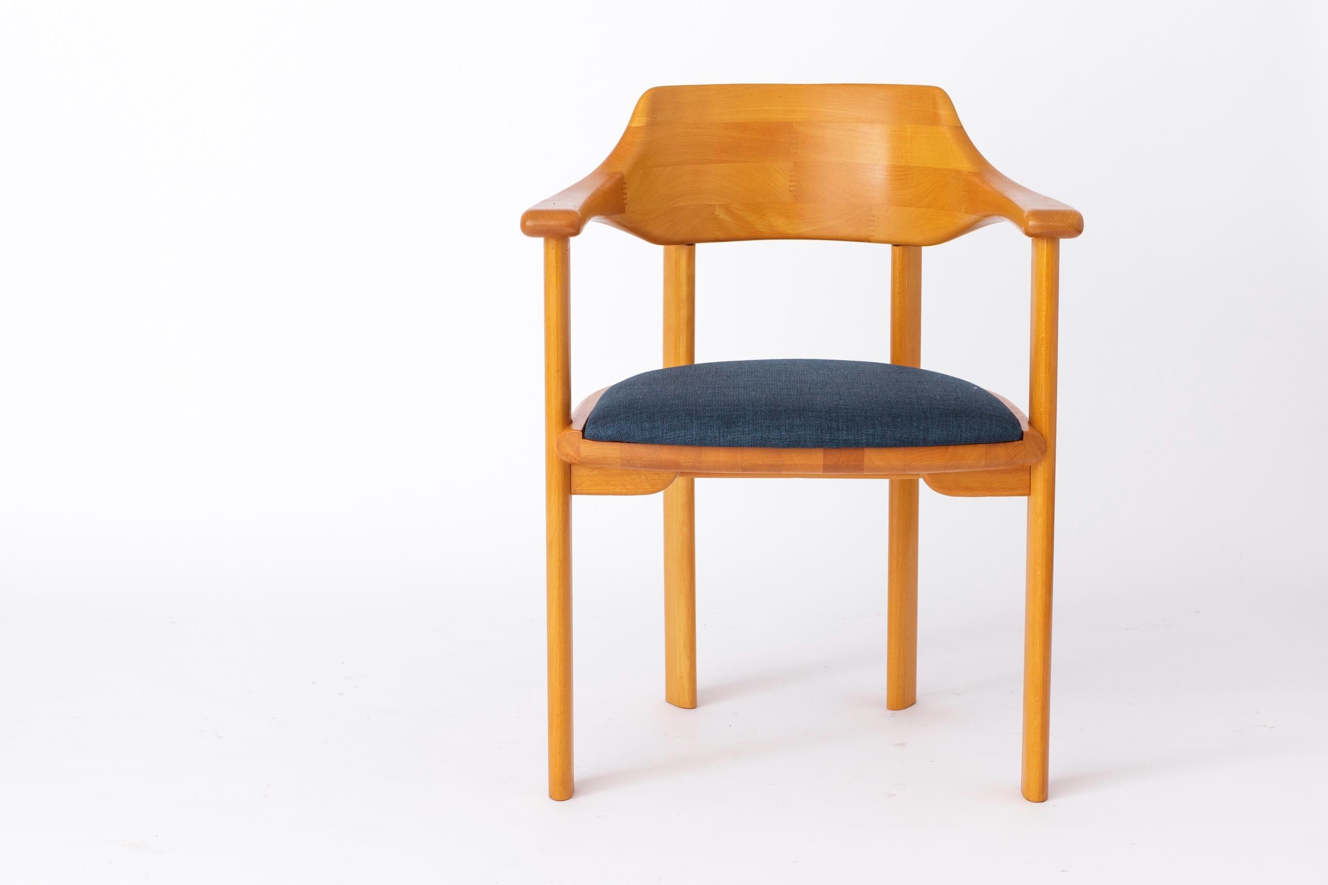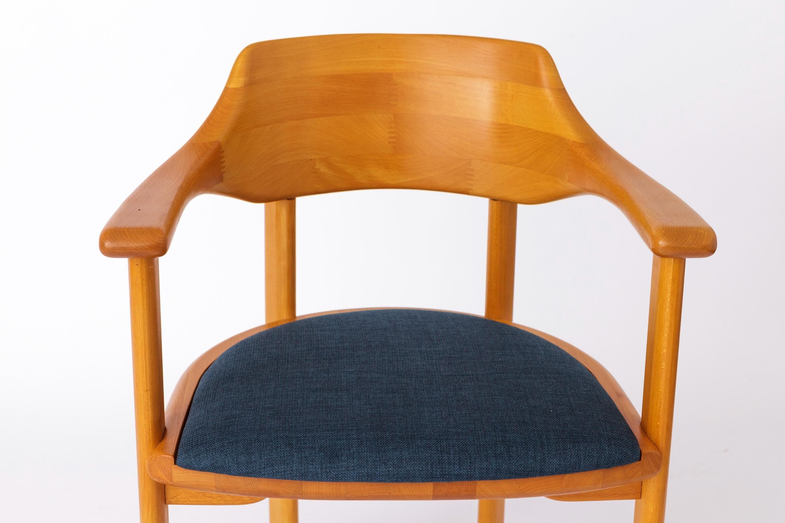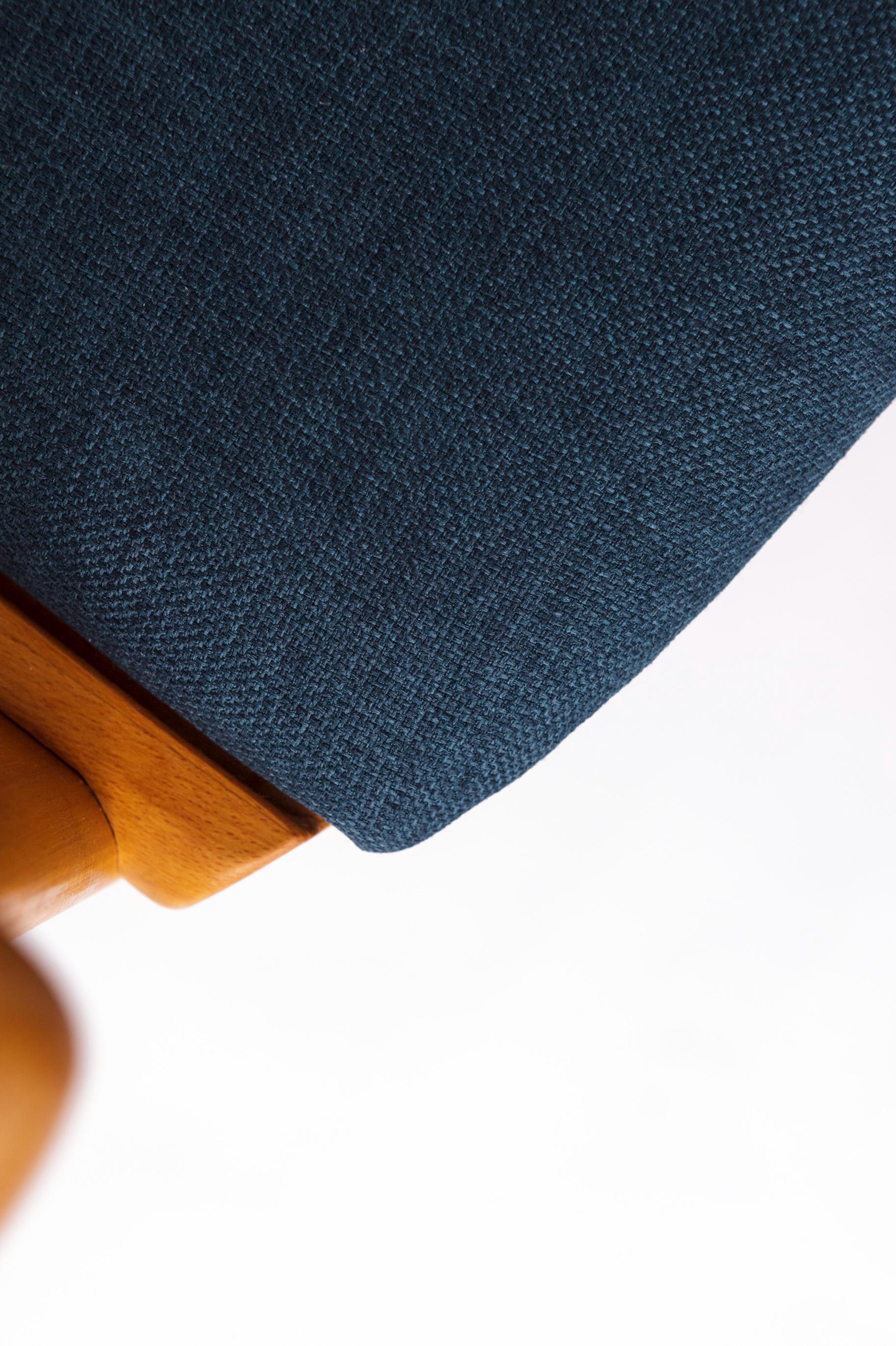 Sæderne er nybetrukket med et kraftigt tekstil i blå nuance, som tilfører stolene et moderne udtryk i harmonisk kontrast til det klassiske formsprog. Hver stol er mærket under sædet med producentens logo, hvilket bekræfter oprindelsen.