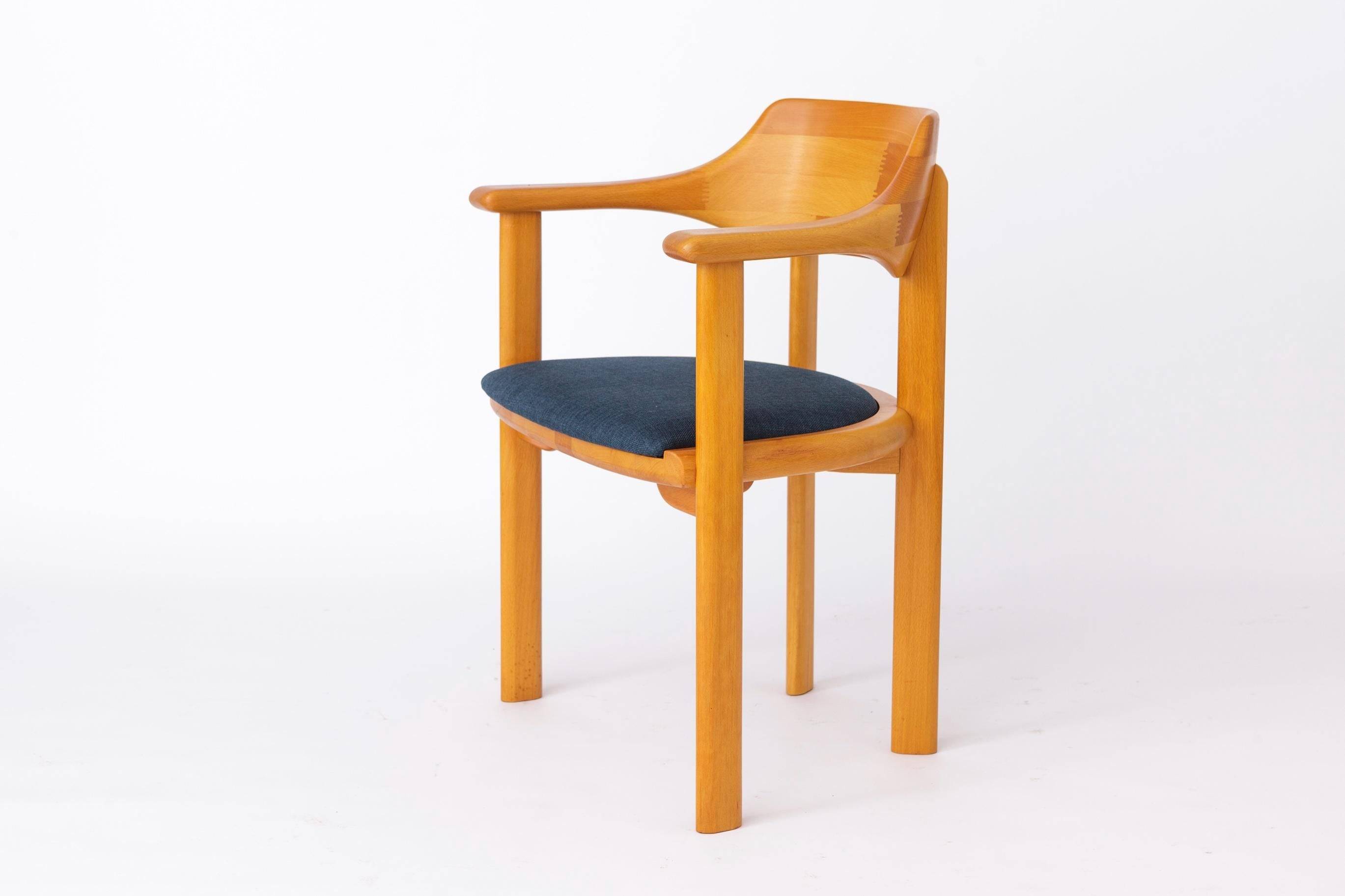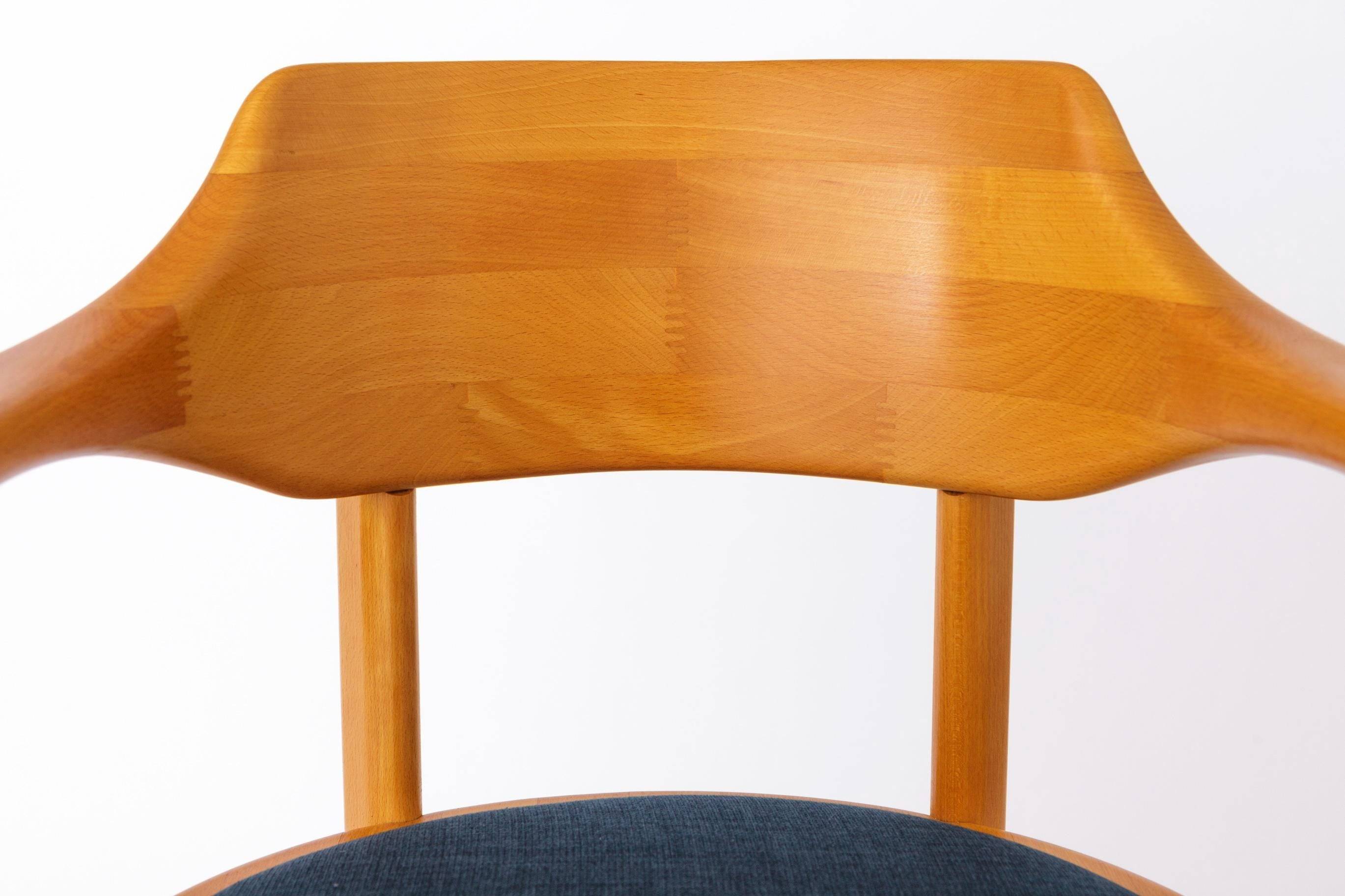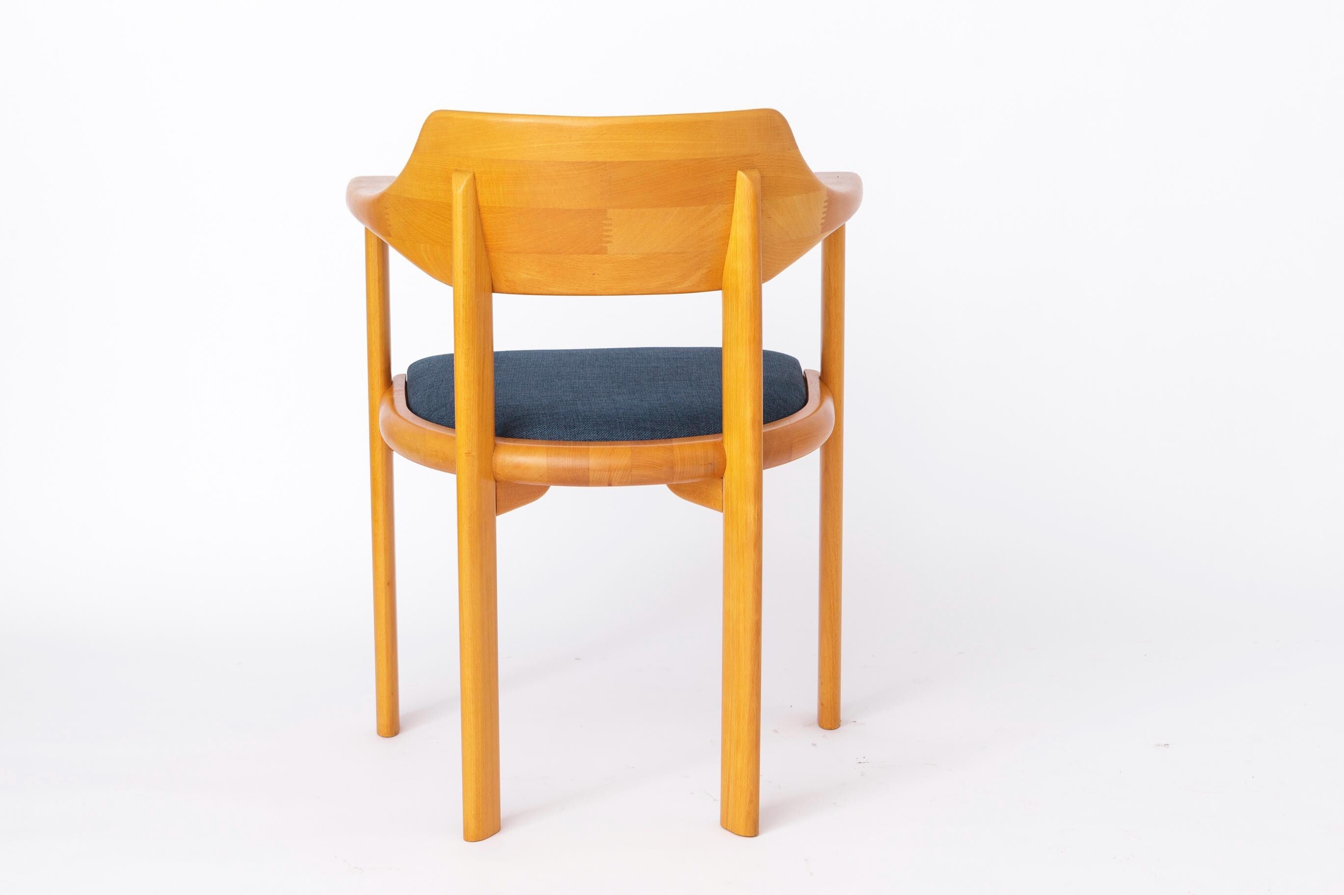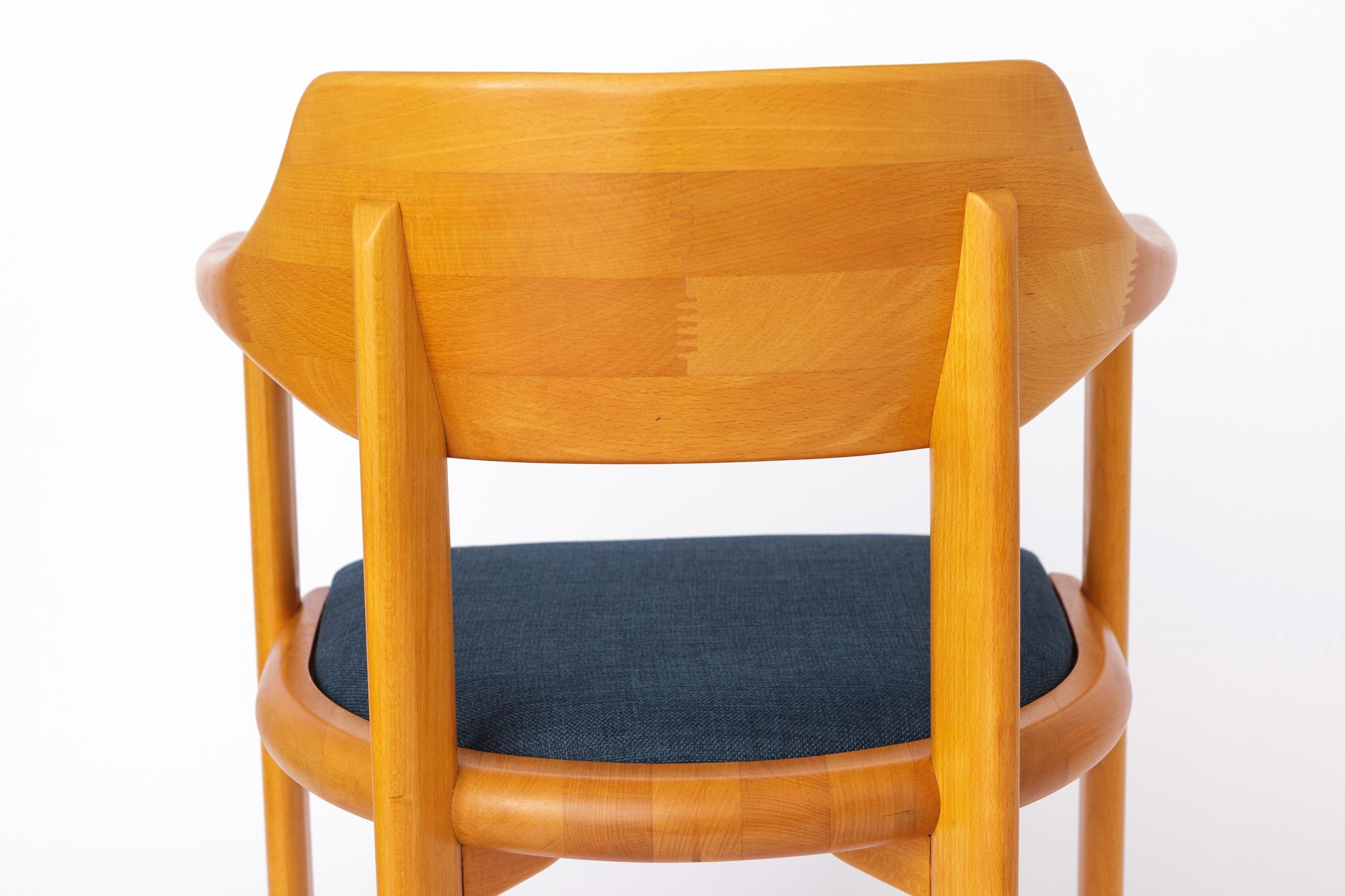 Sæderne er nybetrukket med et kraftigt tekstil i blå nuance, som tilfører stolene et moderne udtryk i harmonisk kontrast til det klassiske formsprog. Hver stol er mærket under sædet med producentens logo, hvilket bekræfter oprindelsen.