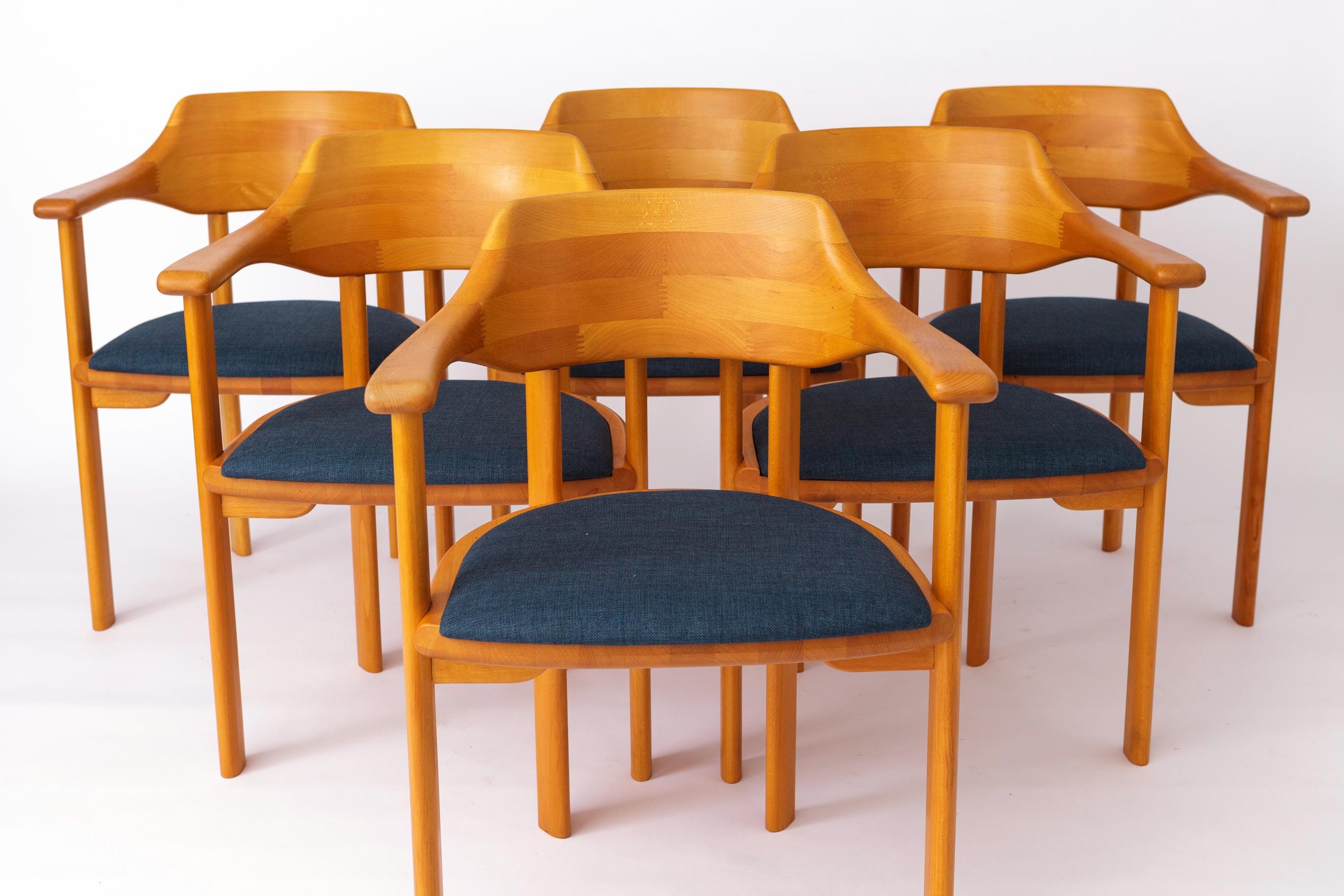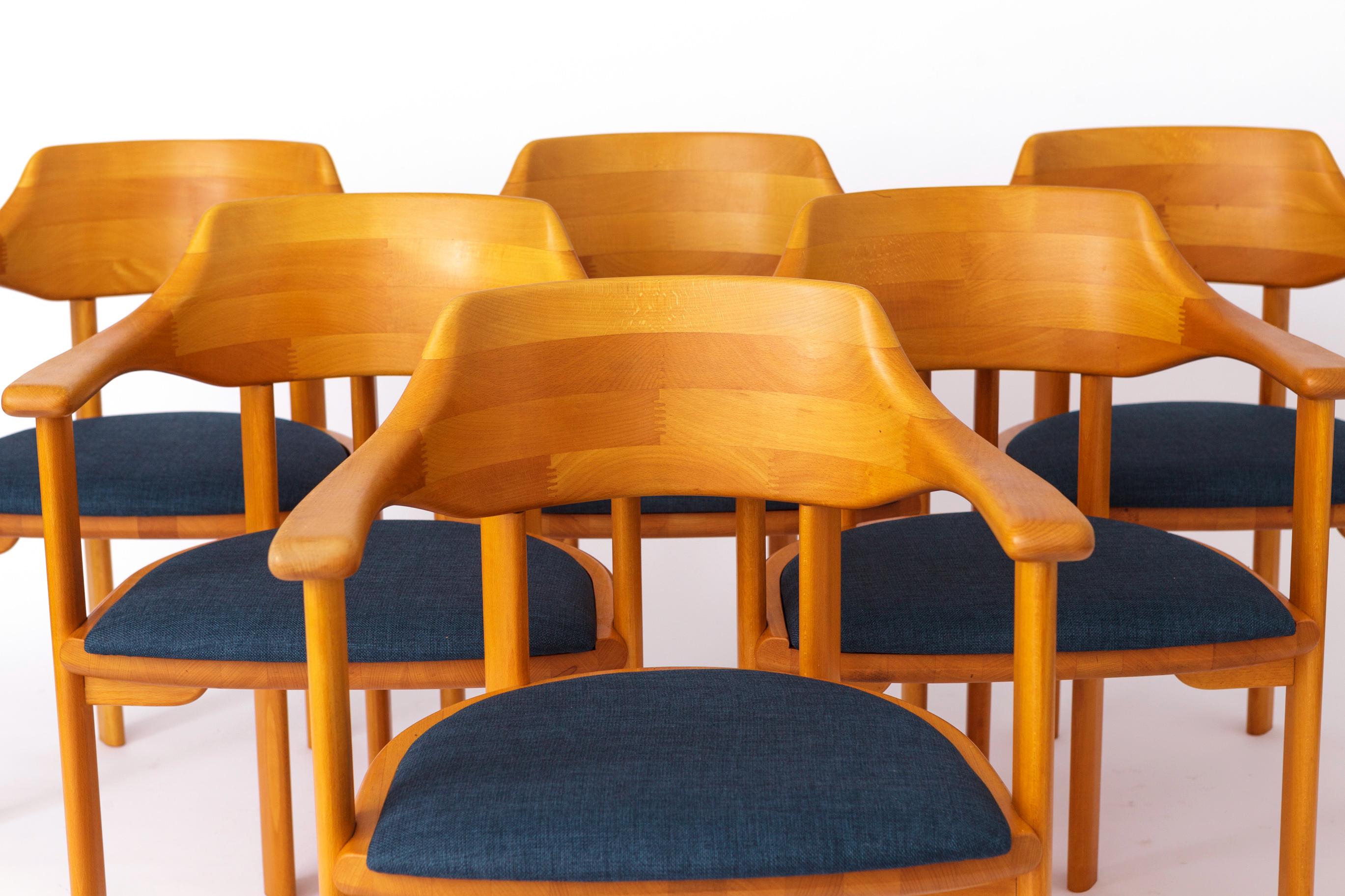 Model armstole fremstillet af Ansager Møbler, oprindeligt designet i 1960’erne og sandsynligvis produceret i 1980’erne–90’erne. Sættet består af seks stole udført i massiv bøg, hvor trærammerne er restaureret og oliebehandlet for at fremhæve den naturlige glød i træet.