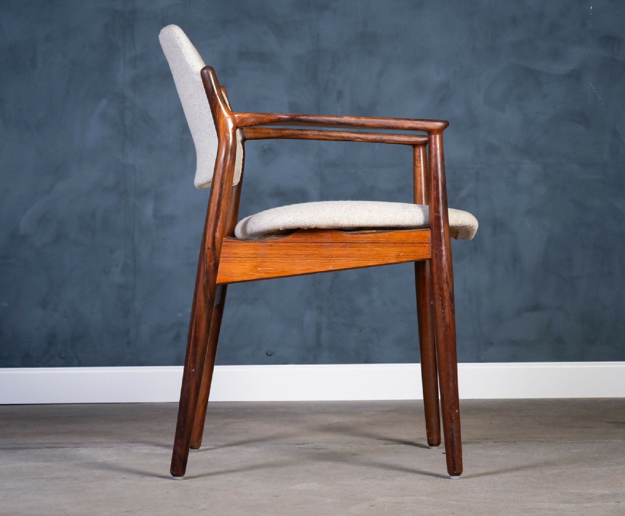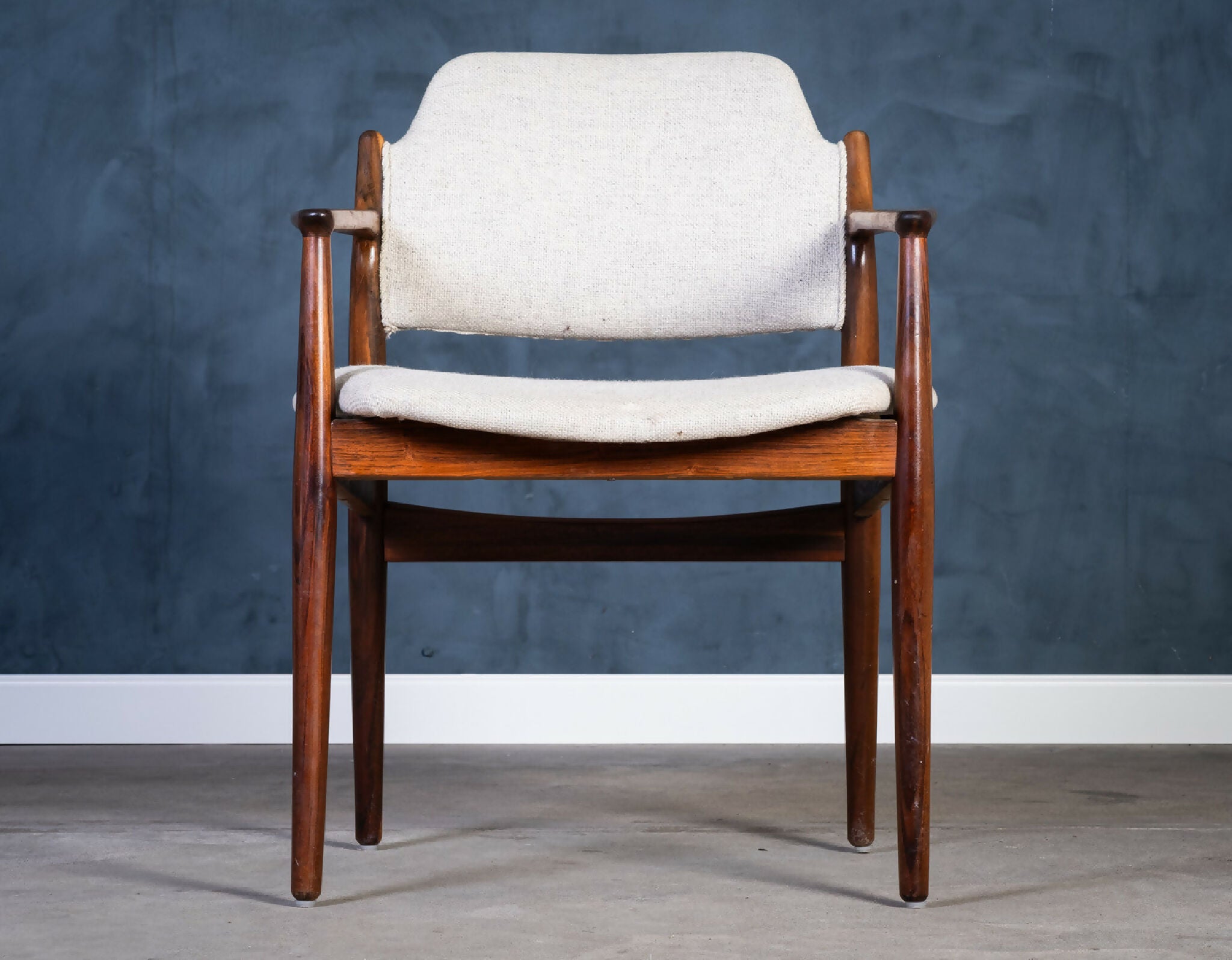 Model lænestol designet af Arne Vodder for Sibast Møbelfabrik i 1960’erne. Stolens ramme er udført i massiv palisander med elegant formede linjer og bløde overgange, der vidner om Vodders sans for proportioner og håndværksmæssig kvalitet. Det enkle og raffinerede formsprog gør stolen velegnet både som solitær stol og som del af en klassisk indretning.