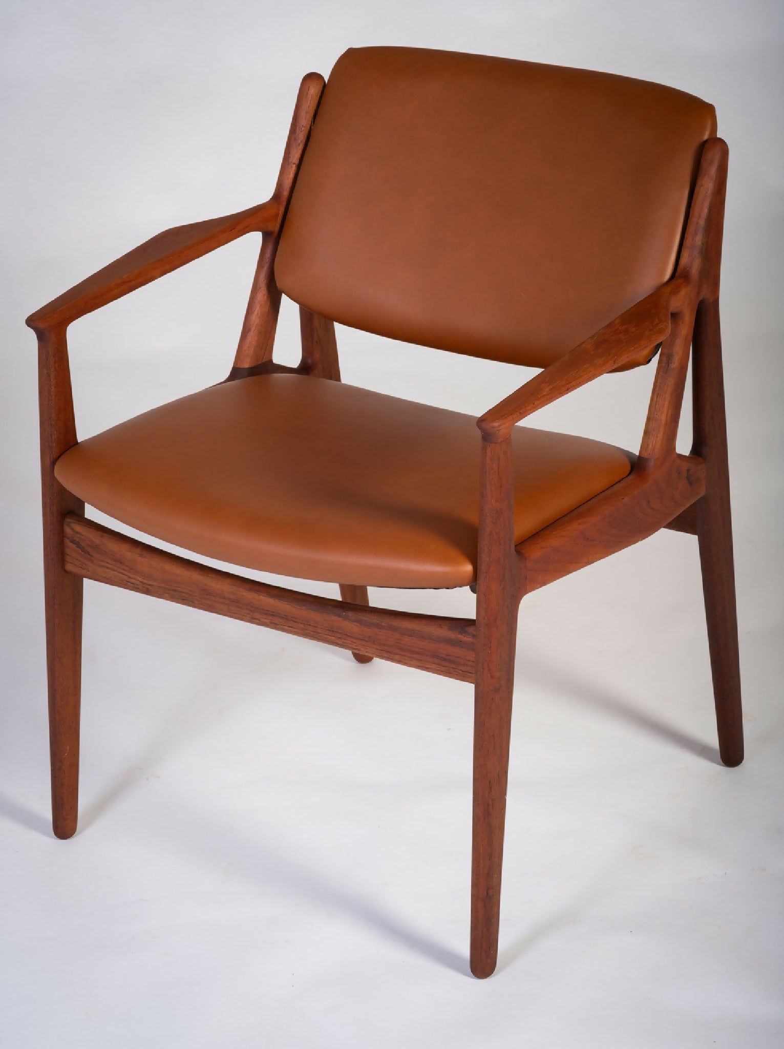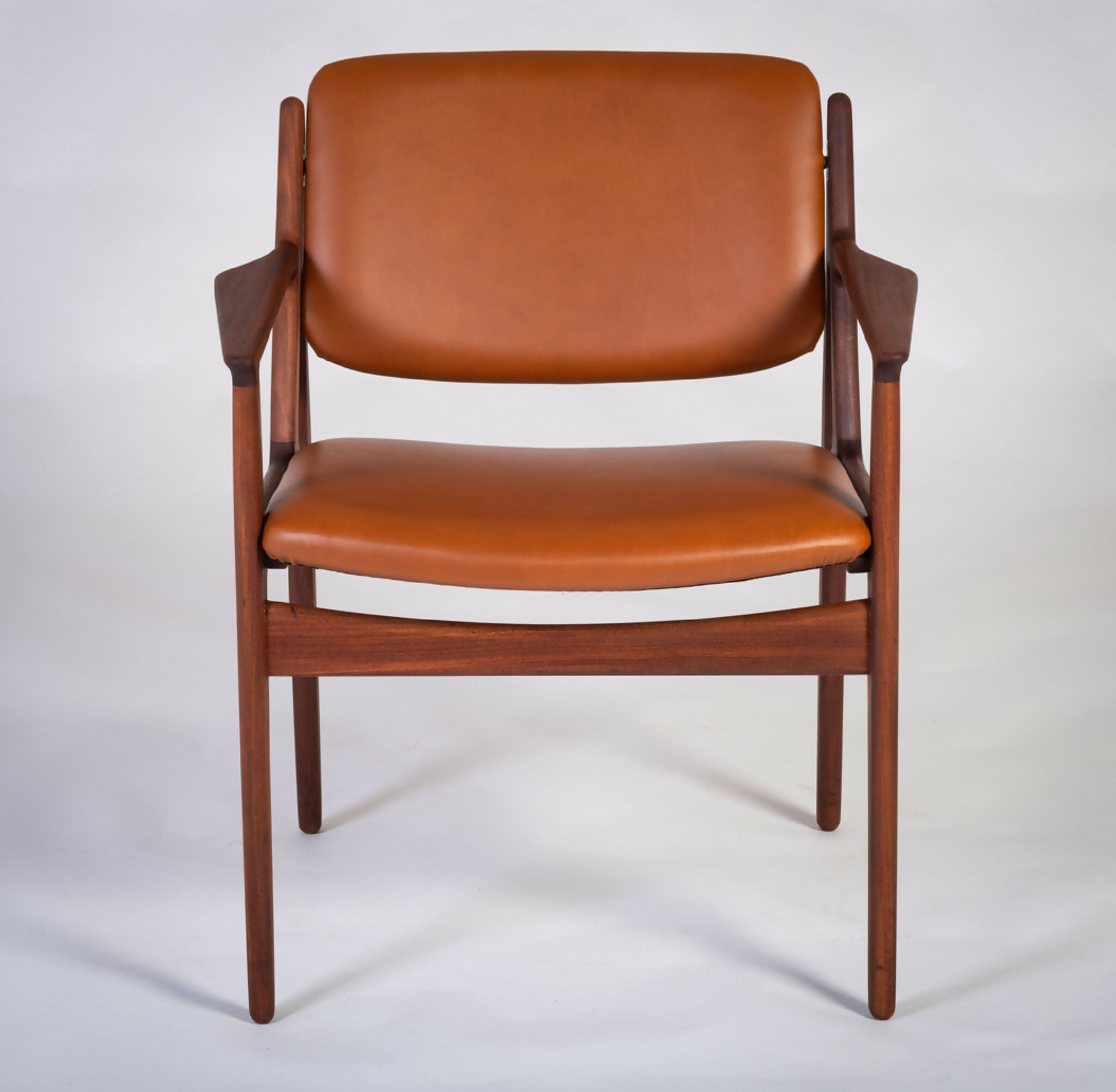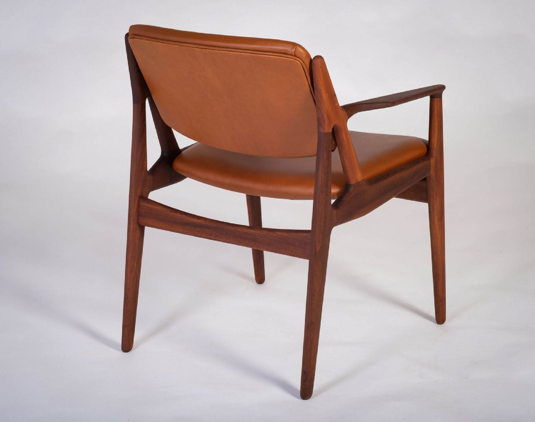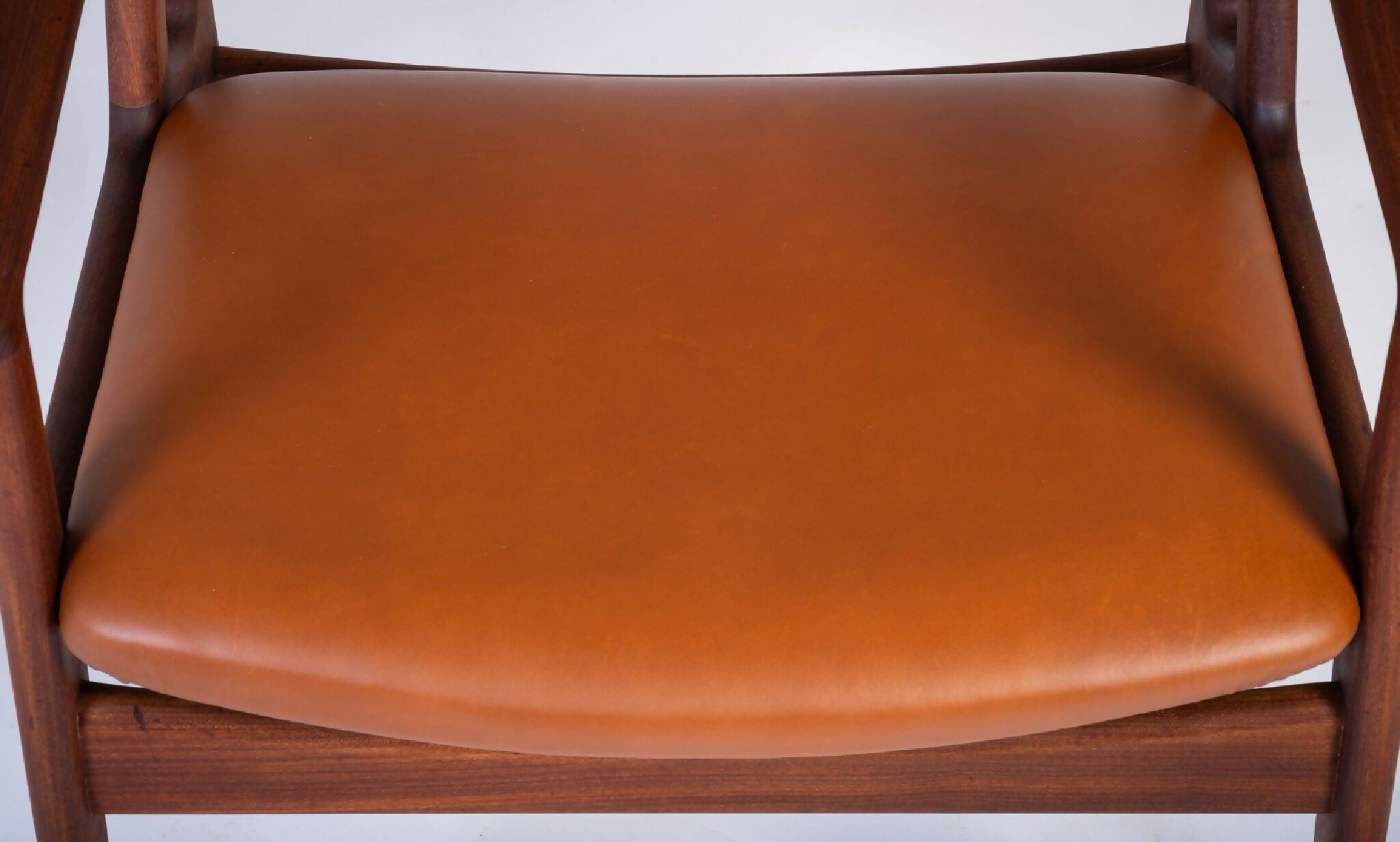 Model Ella armstol designet af Arne Vodder for Vamo Møbelfabrik i 1960’erne. Sættet består af to stole udført i massiv teak med nybetrukne sæder og ryglæn i cognacfarvet anilinlæder. Den skulpturelle ramme med åbne, trekantede armlæn og det let hældende ryglæn giver stolen et elegant og harmonisk udtryk.