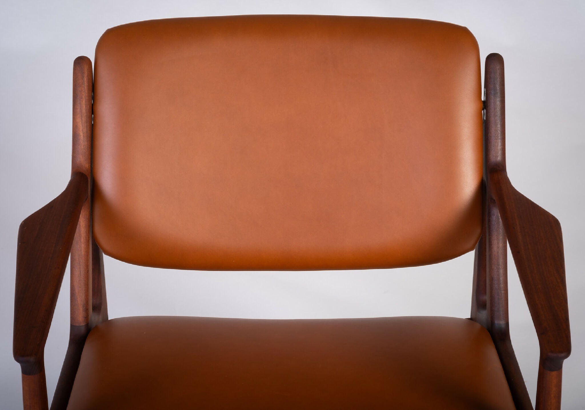 Ryglænet er monteret med en drejemekanisme, der tilpasser sig kroppen og giver fremragende siddekomfort. Et design, der på smukkeste vis kombinerer funktionalitet, æstetik og håndværk – kendetegnende for Vodders arbejde.