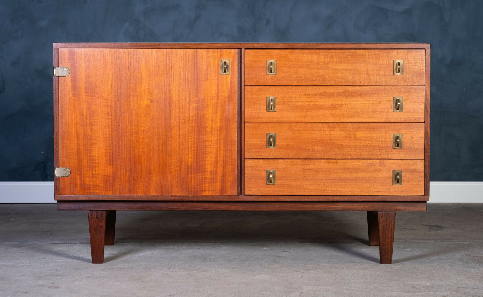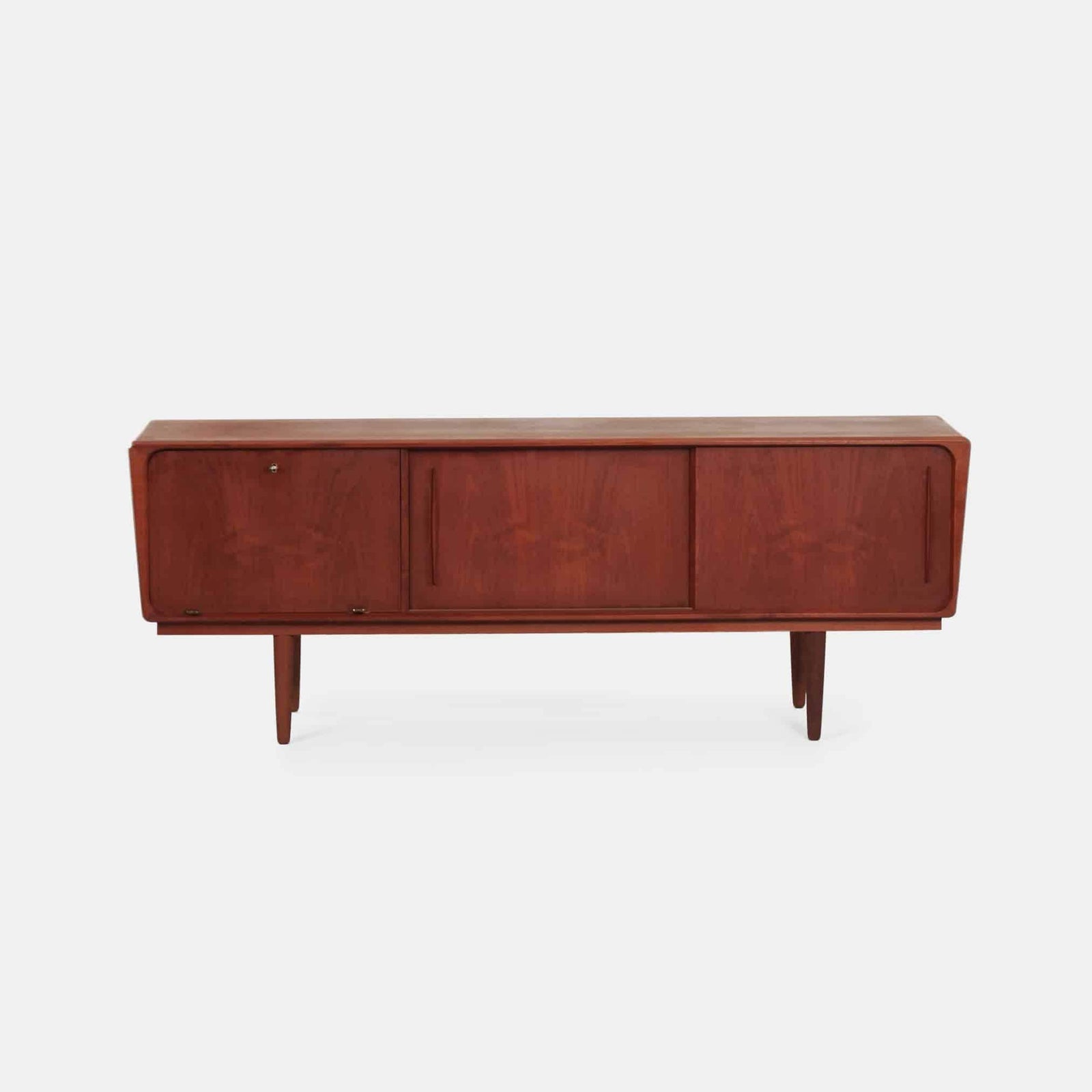 Model skænk designet af Børge Mogensen. Fremstillet i teak med stel i eg, hvilket skaber et harmonisk spil mellem materialer og giver møblet både varme og robusthed. De rene linjer og den funktionelle opbygning er karakteristisk for Mogensens tilgang til møbeldesign, hvor æstetik og anvendelighed går hånd i hånd.