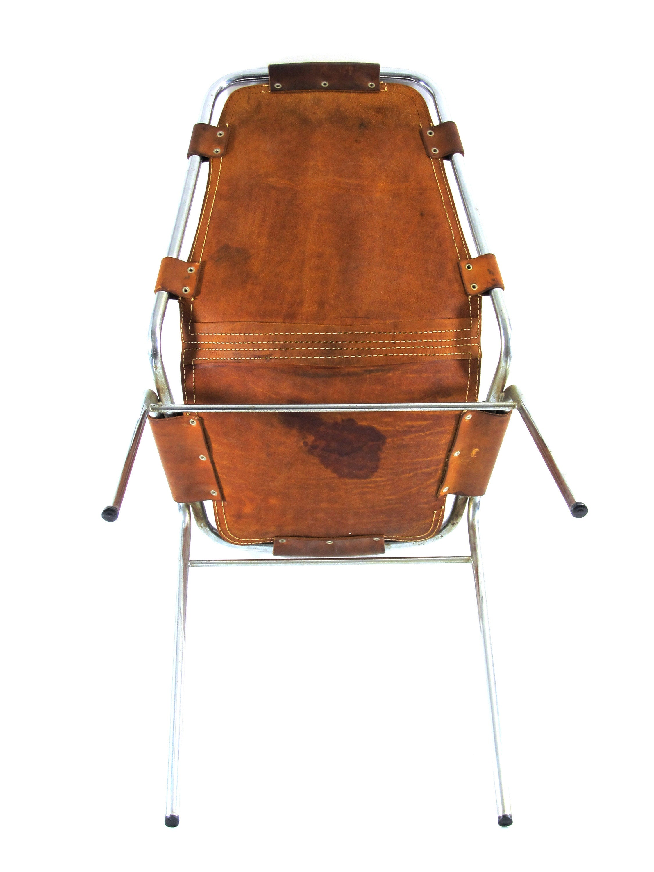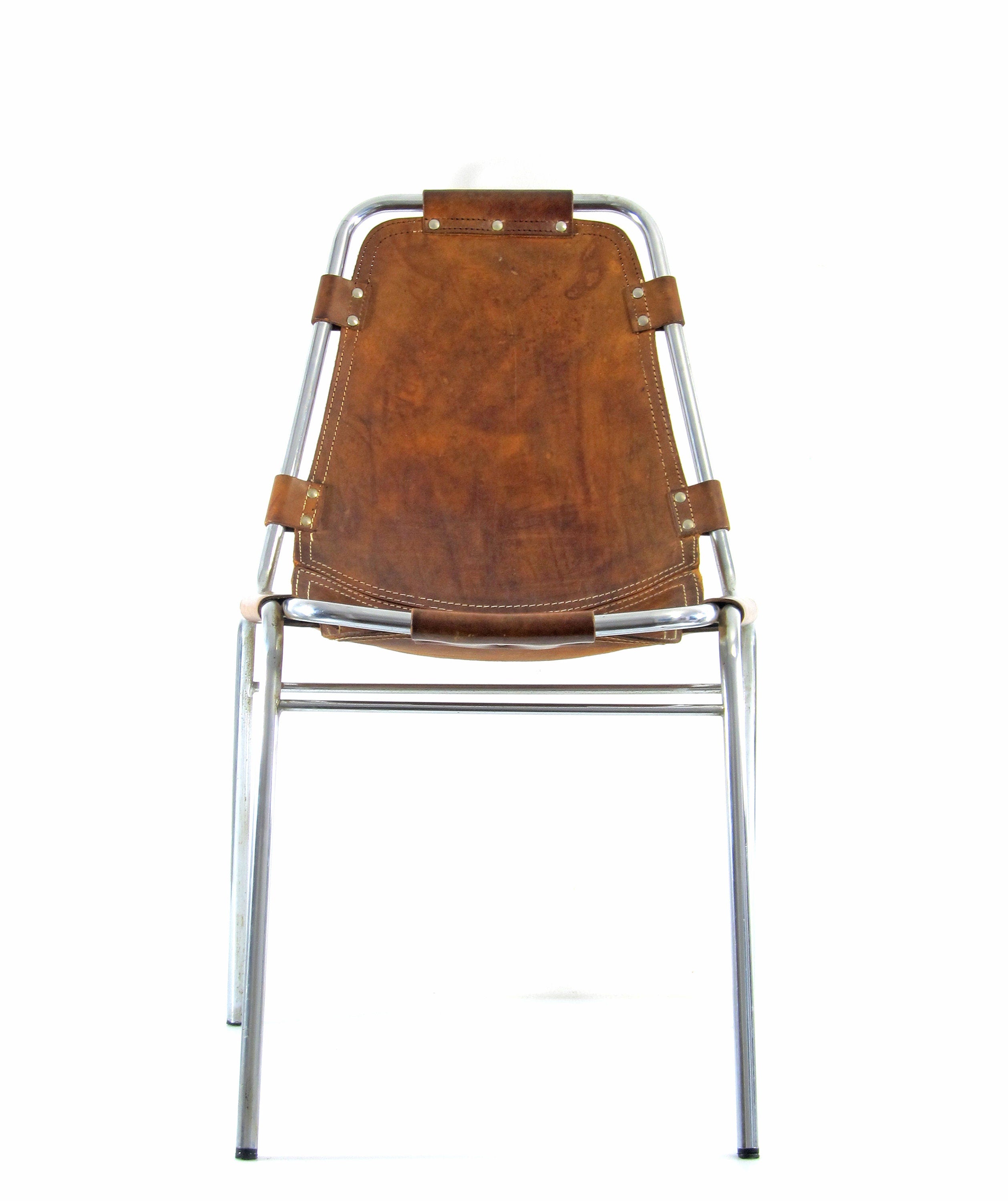 Model spisebordsstol designet af Charlotte Perriand til Les Arcs-skisportsstedet i Frankrig i 1960’erne. Stolen er udført med sæde og ryg i varmt brunt sadellæder, som har udviklet en smuk og autentisk patina over tid. Konstruktionen er enkel og funktionel og afspejler Perriands tilgang til ærlige materialer og praktisk anvendelighed.