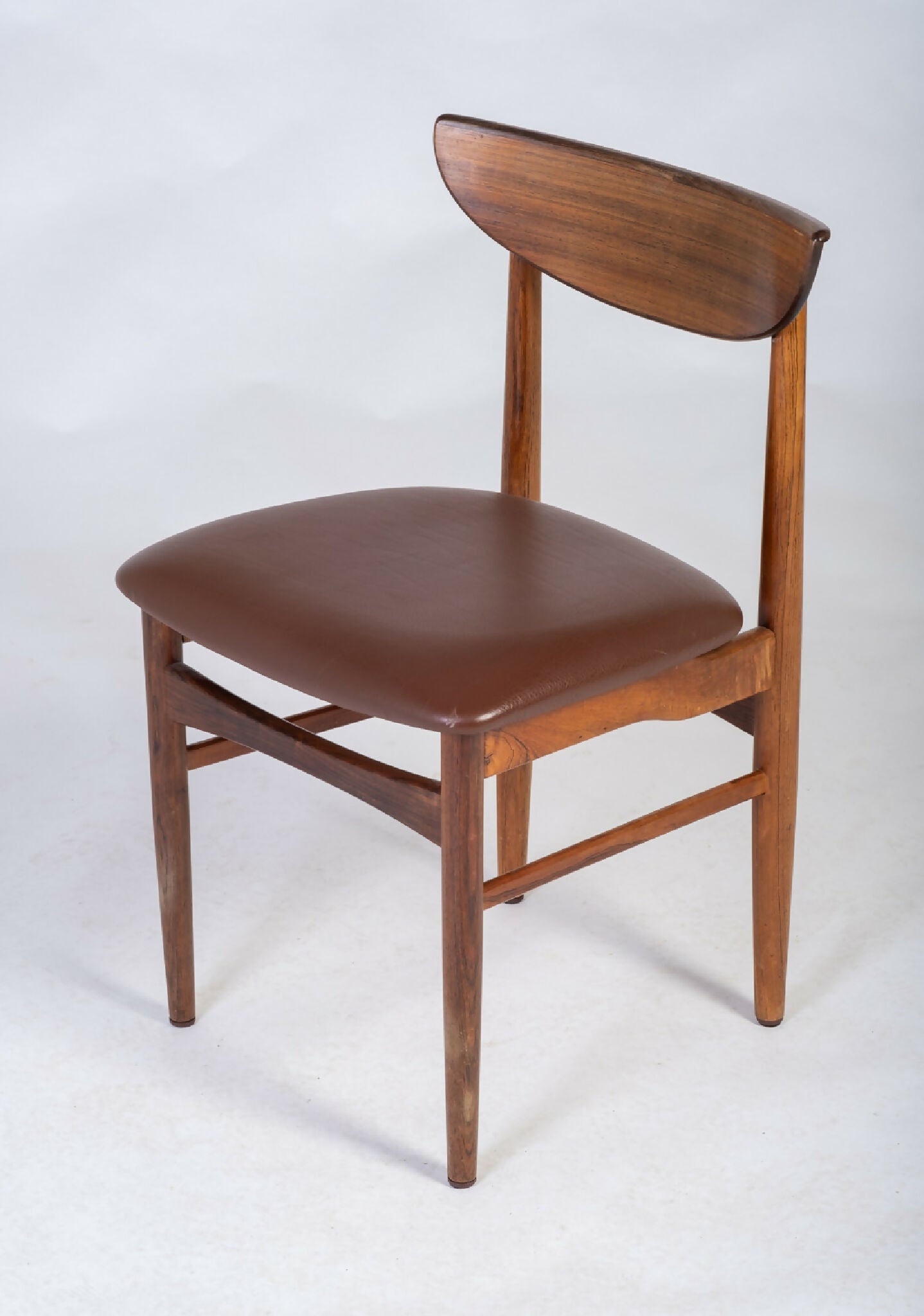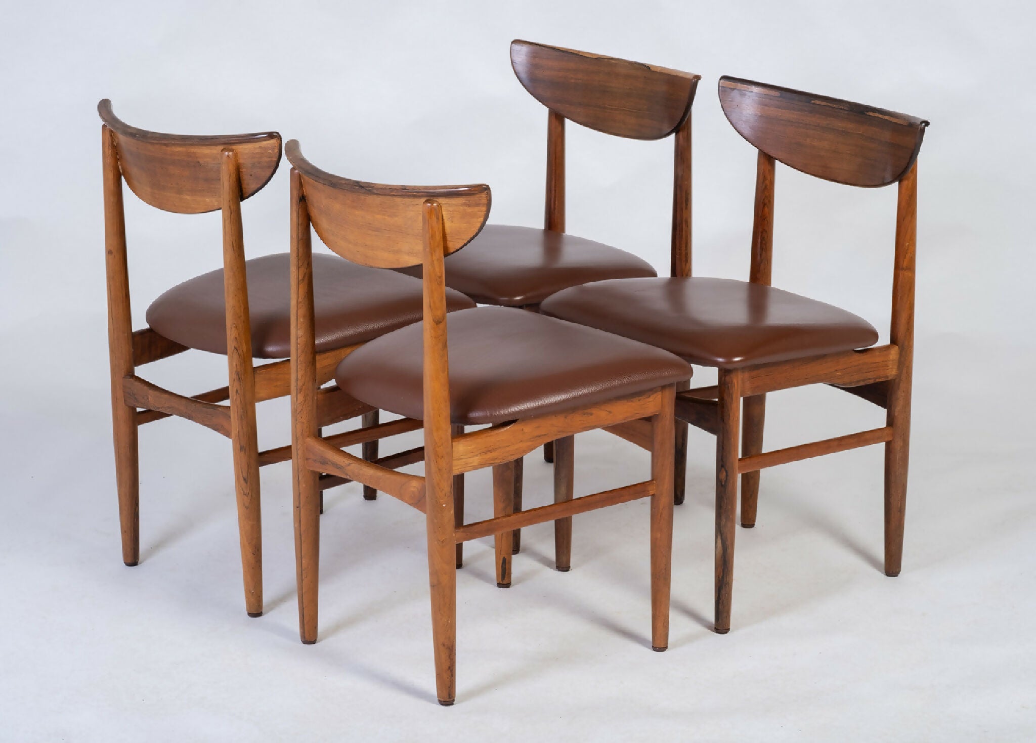 Sæt af fire spisebordsstole designet af E. W. Bach og fremstillet af Skovby Møbelfabrik i Danmark i 1960’erne. Stolene er udført i massiv palisander med afrundet ryglæn og en karakteristisk rullekant, der fremhæver træets levende åretegning og varme glød. De elegante, koniske ben understreger det lette og harmoniske formsprog, som kendetegner perioden.