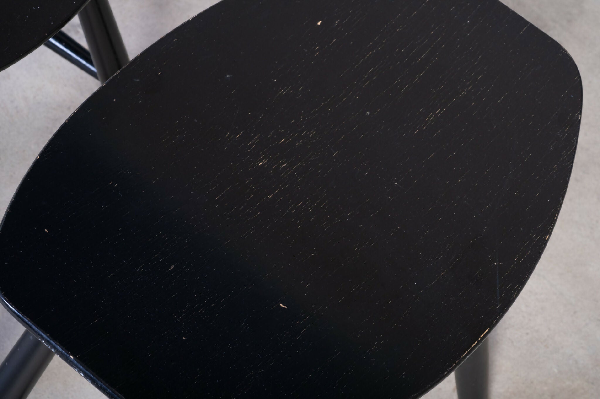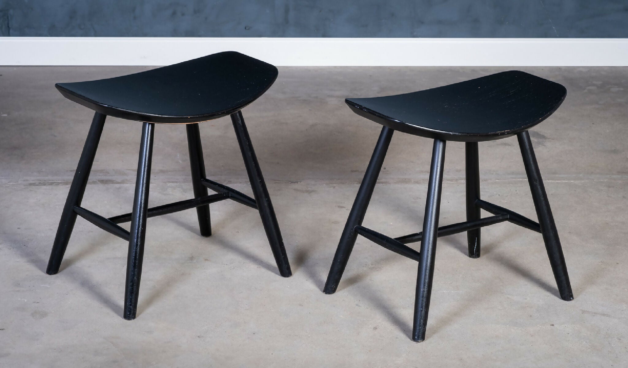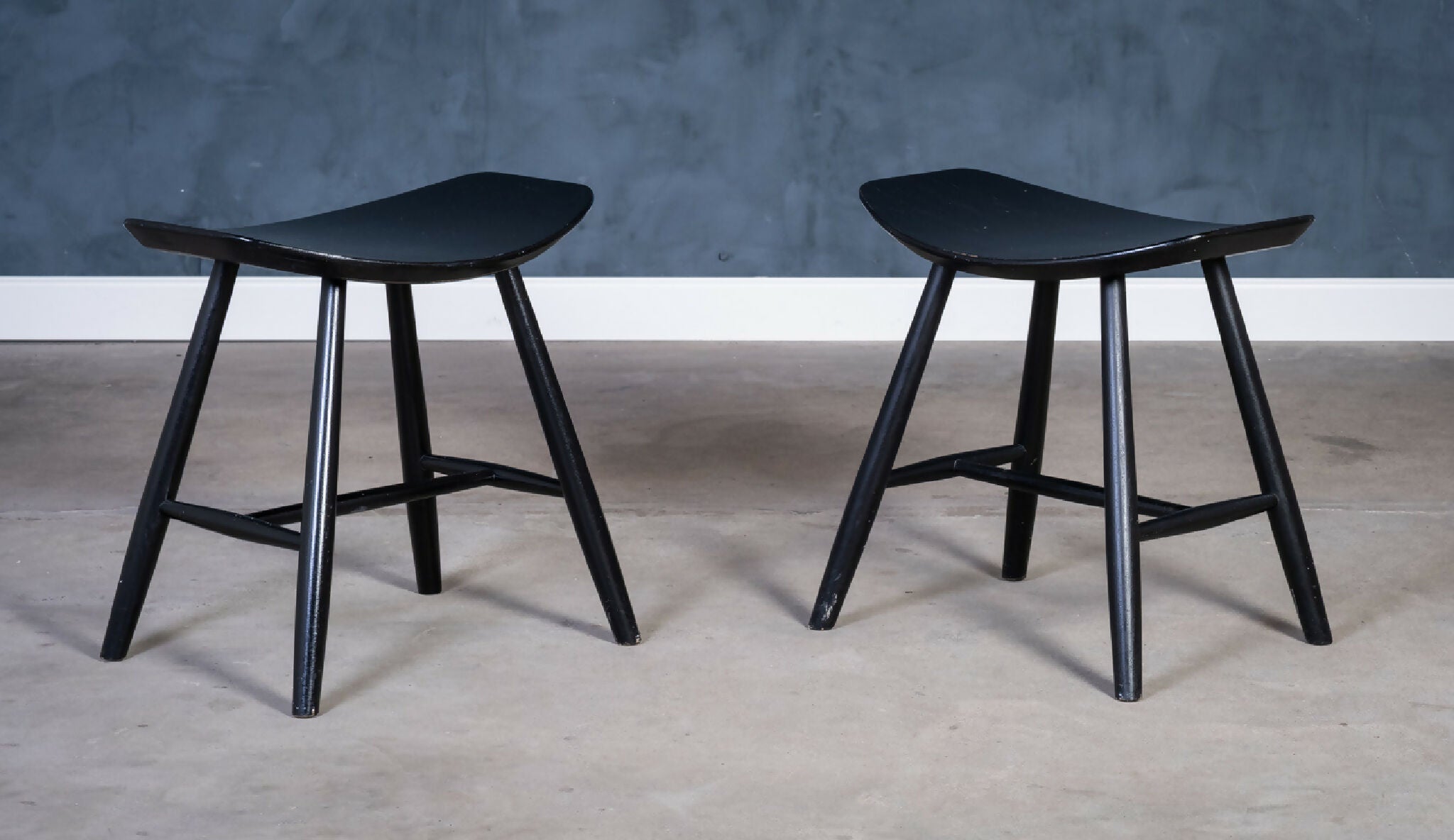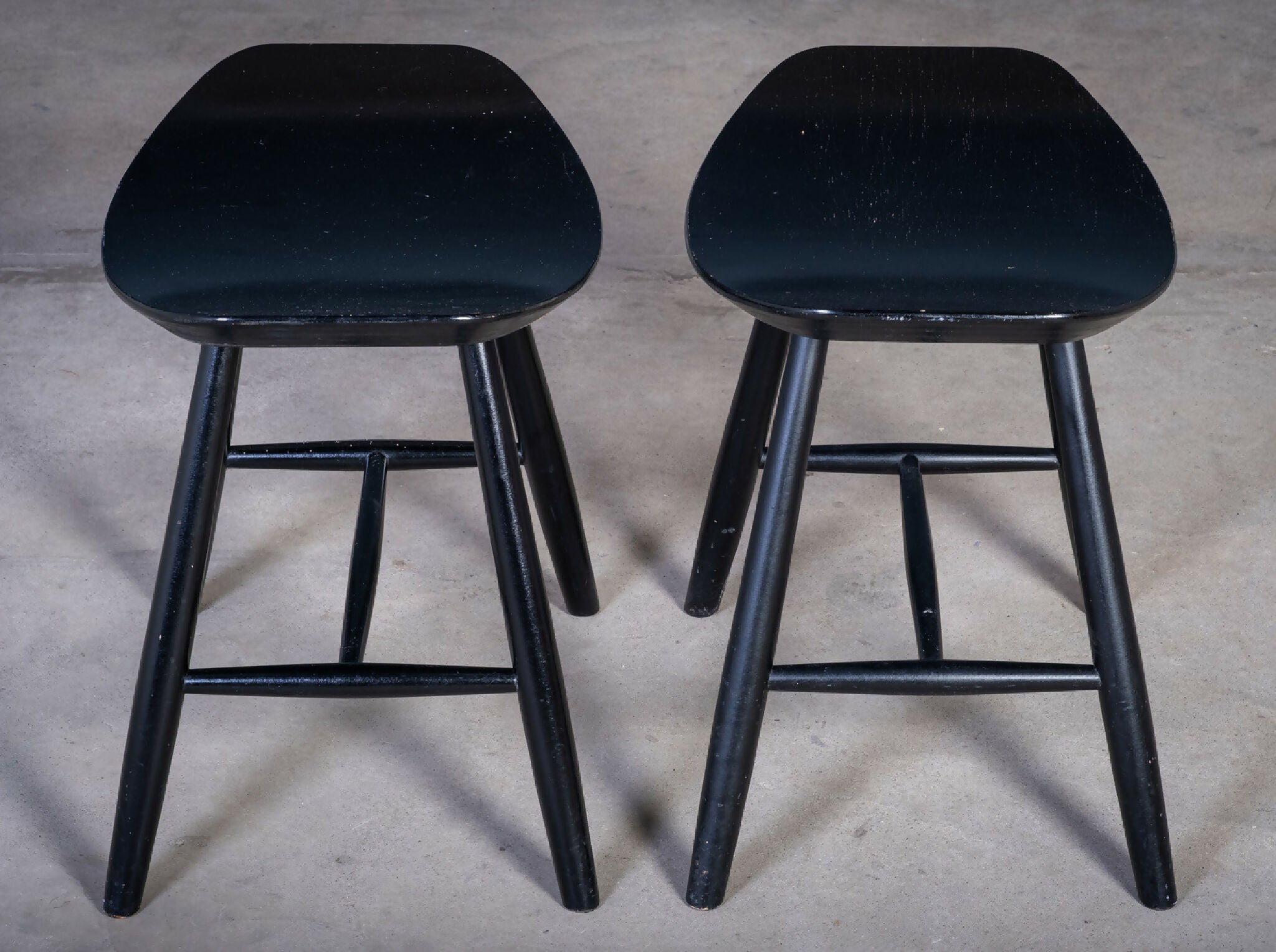 Model J36 skamler designet af Ejvind A. Johansson for FDB Møbler i 1960’erne. Udført i massivt træ med original sort lakering, der fremhæver det enkle og arkitektoniske formsprog. Skamlerne er et fint eksempel på den funktionelle æstetik, som kendetegner FDB’s designtradition – skabt med fokus på brugsværdi, holdbarhed og tidløs skønhed.