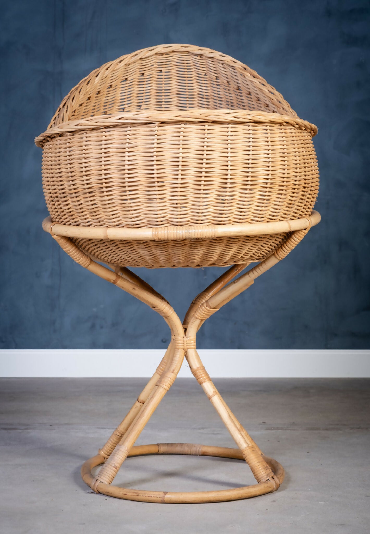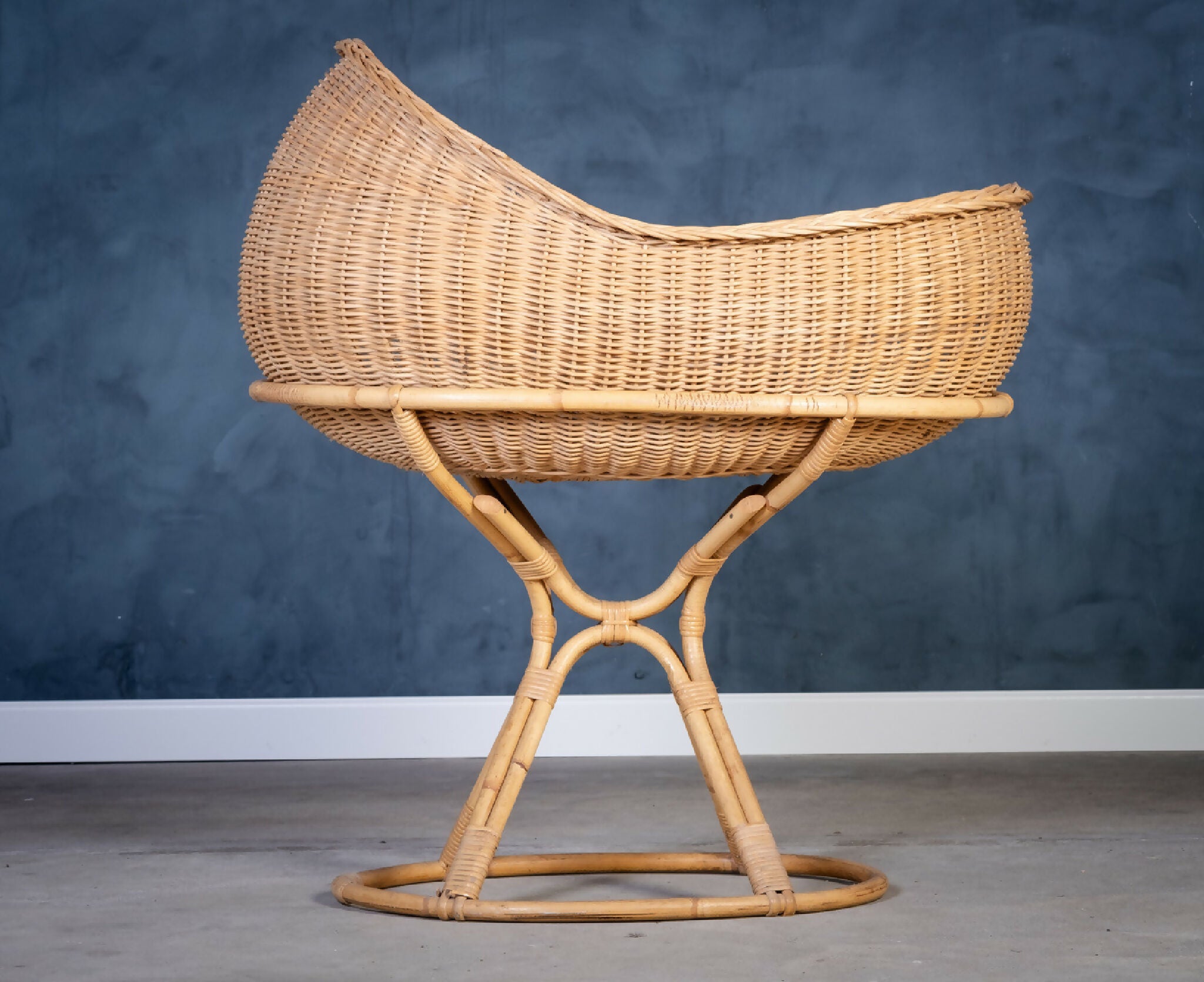 Model vugge designet af Elin & Jarl Heger i 1960’erne. Fremstillet i bambus og flet med et let og organisk formsprog, der forener funktionalitet og naturlig skønhed. Vuggens luftige konstruktion giver et harmonisk og tidløst udtryk, der afspejler 1960’ernes danske designtradition med fokus på håndværk og materialets ærlighed.