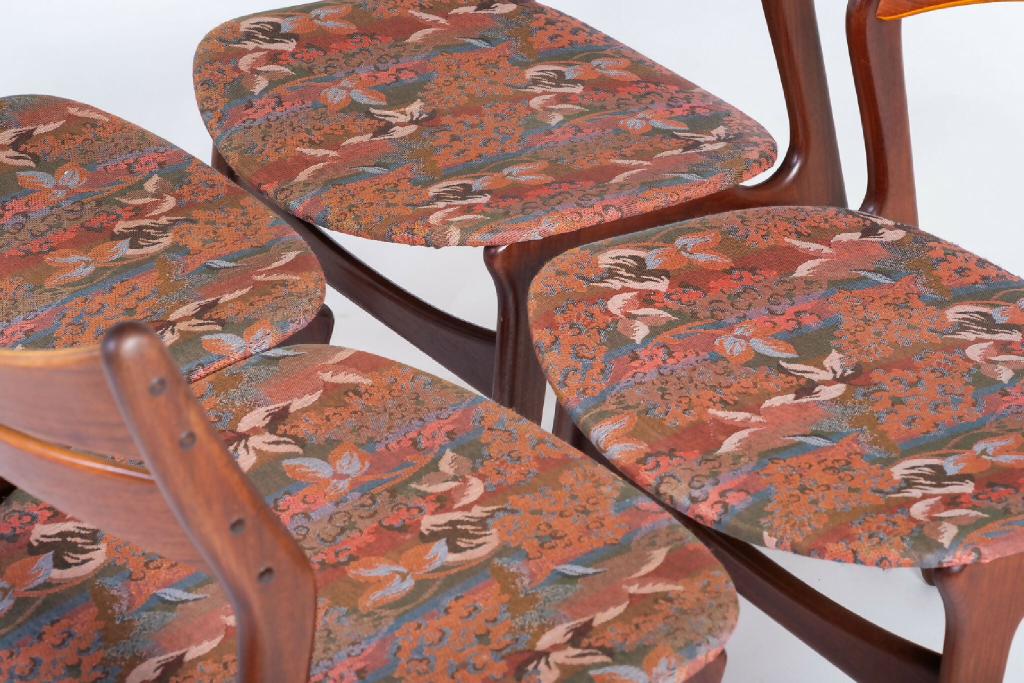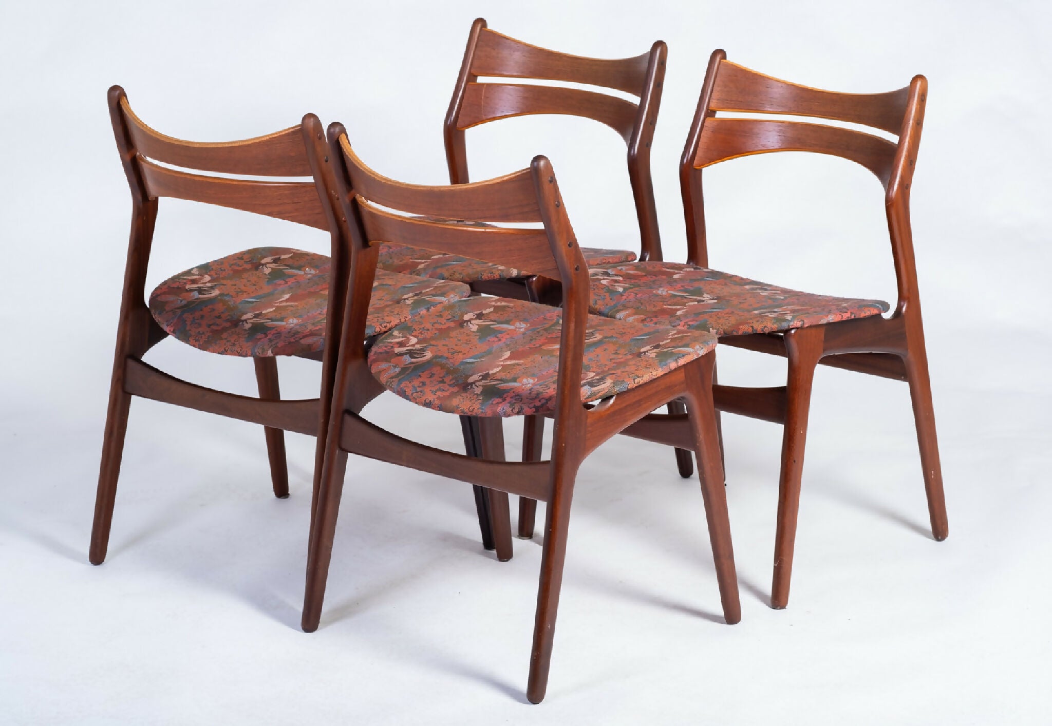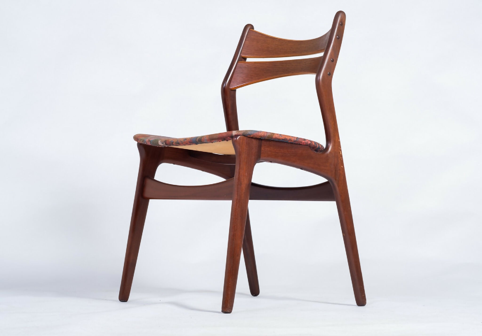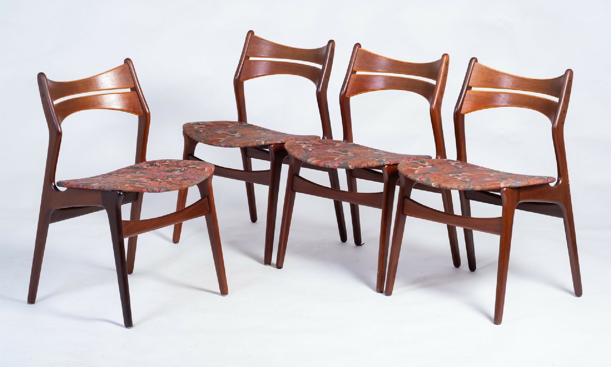 Sæt af fire spisebordsstole designet af Erik Buch og produceret af Christiansen Møbelfabrik i Danmark i 1960’erne. Stolene er udført i massiv teak og kendetegnes ved det svungne ryglæn og det svævende, bredt polstrede sæde. Den organiske formgivning og de bløde linjer gør stolen både elegant og ergonomisk – et klassisk eksempel på dansk design, hvor komfort og æstetik forenes.