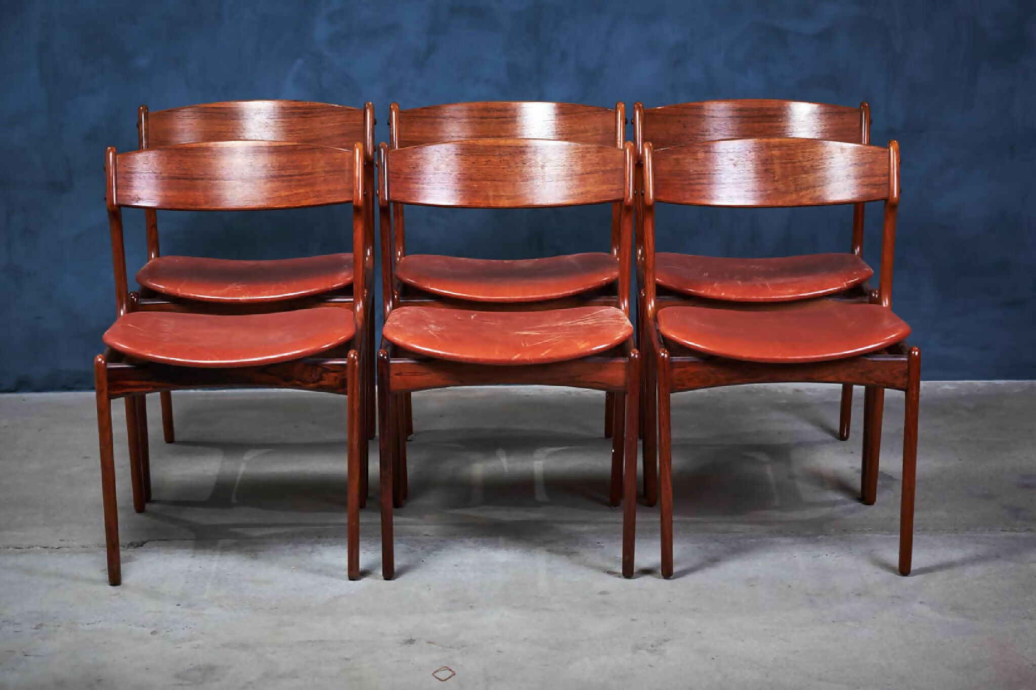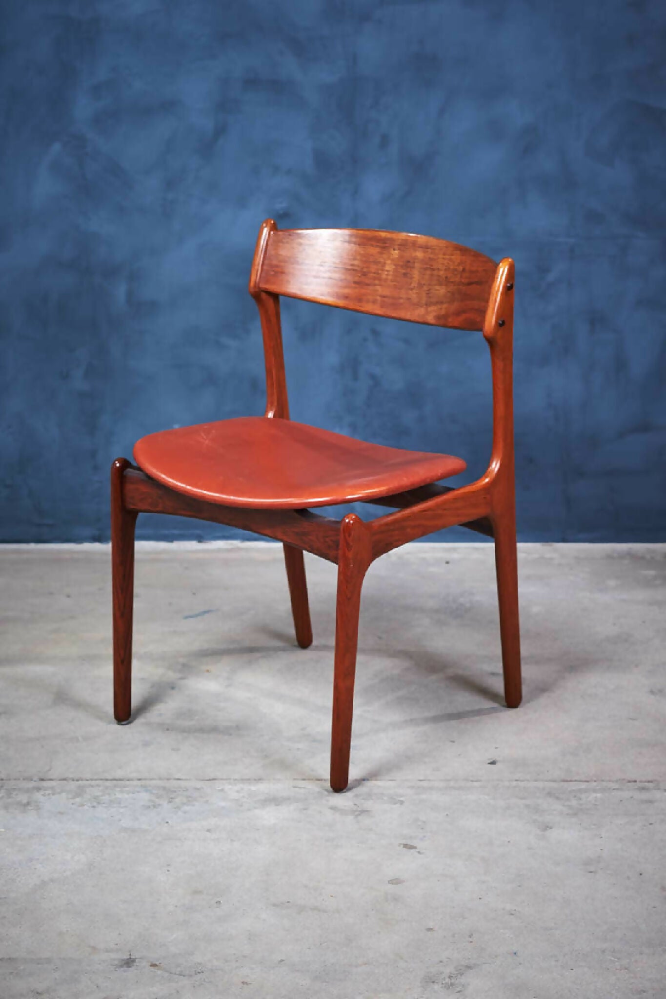 Model spisebordsstol designet af Erik Buch i 1960’erne. Sættet består af seks stole udført i palisander med Buchs karakteristiske svævende sædekonstruktion, der giver et let, harmonisk udtryk og høj siddekomfort. Det cognacfarvede læder har udviklet en smuk patina, som understøtter stolens varme trænuancer og fremhæver håndværket.