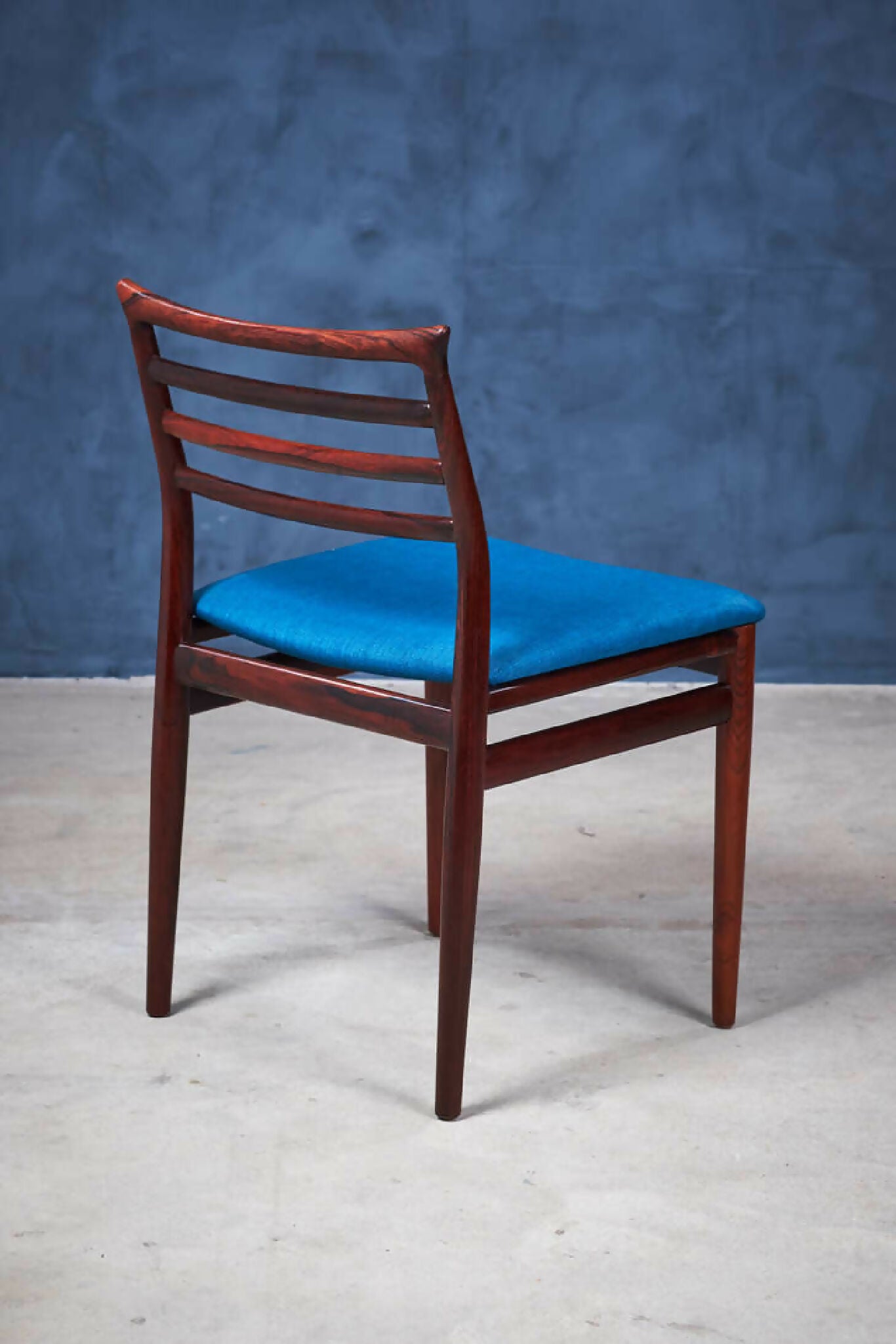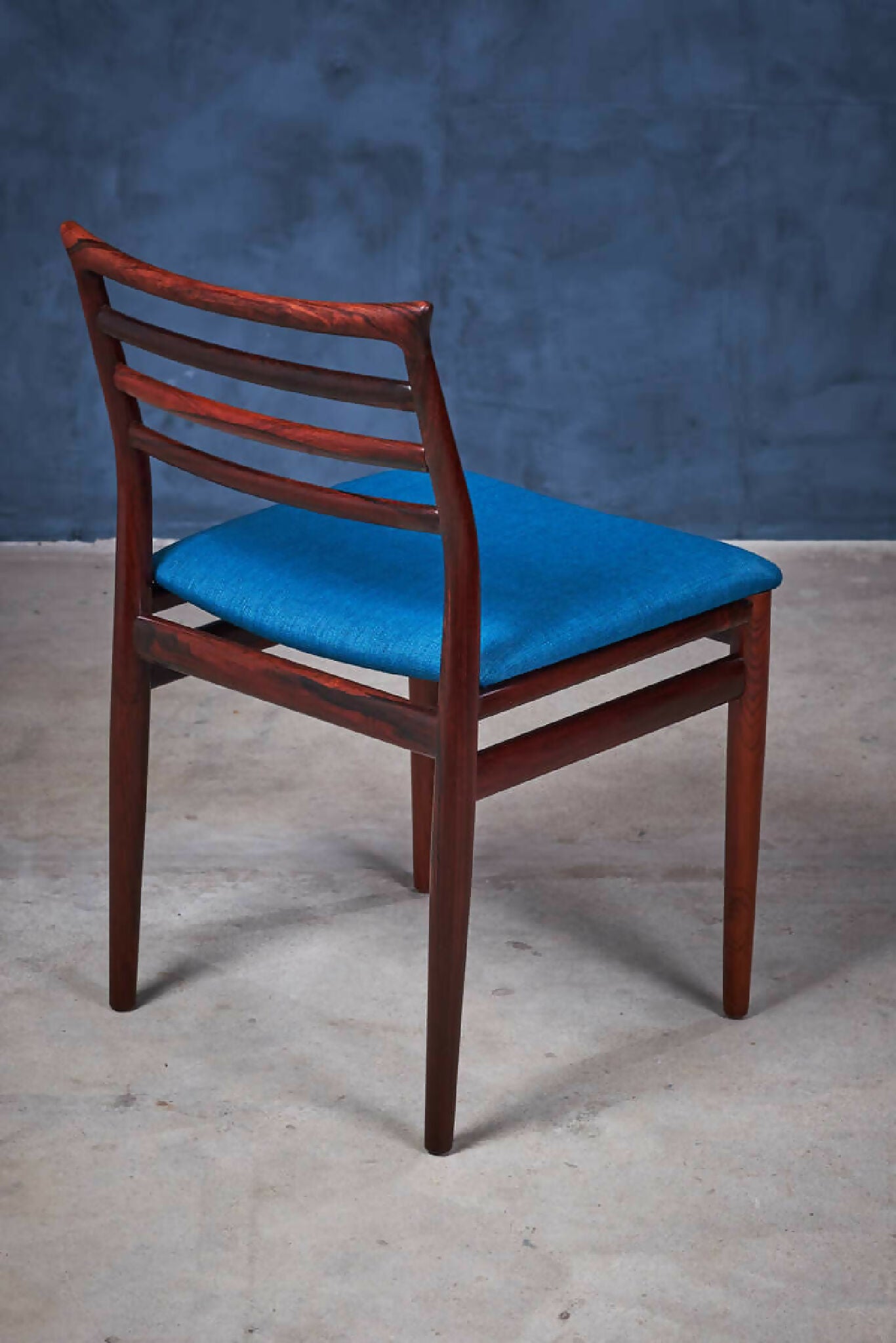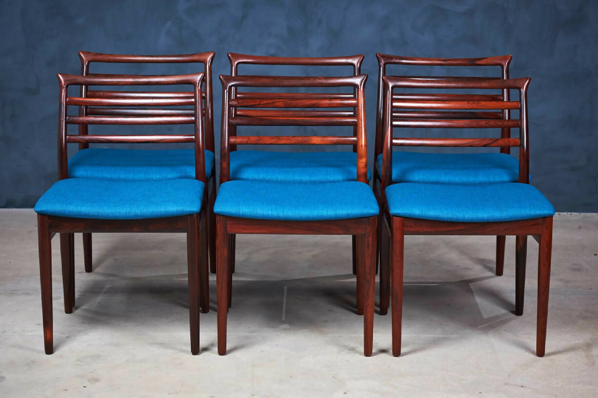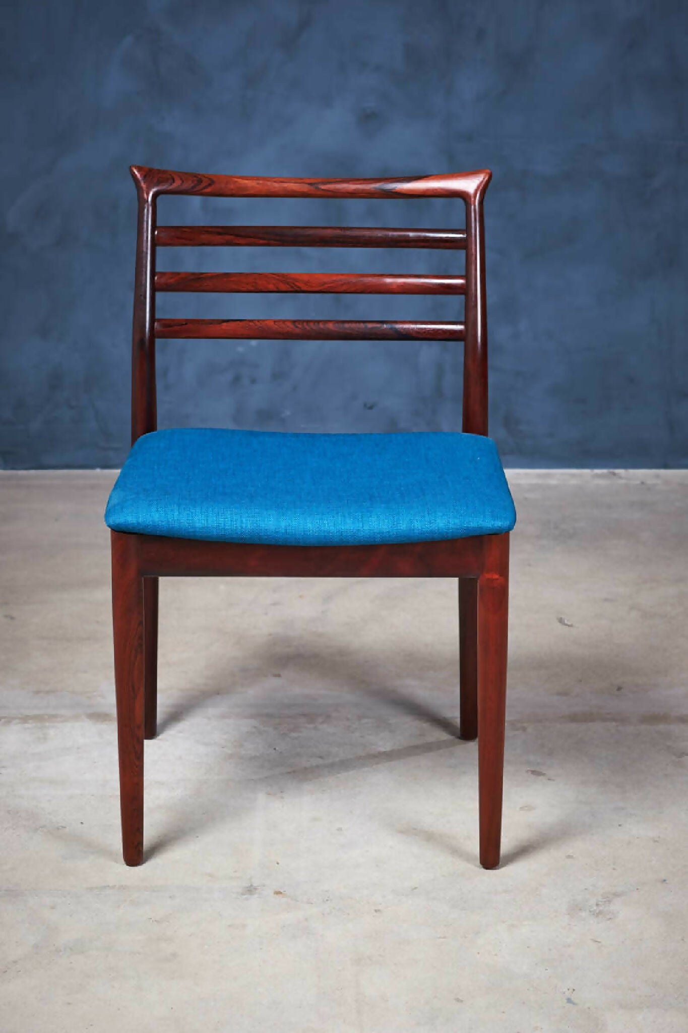 Model spisebordsstol designet af Erling Torvits for Sorø Stolefabrik i 1960’erne. Sættet består af seks stole udført i massiv palisander med smukt buede ryglæn og rene, organiske linjer. Et klassisk eksempel på dansk design, hvor håndværk og proportioner går op i en højere enhed.