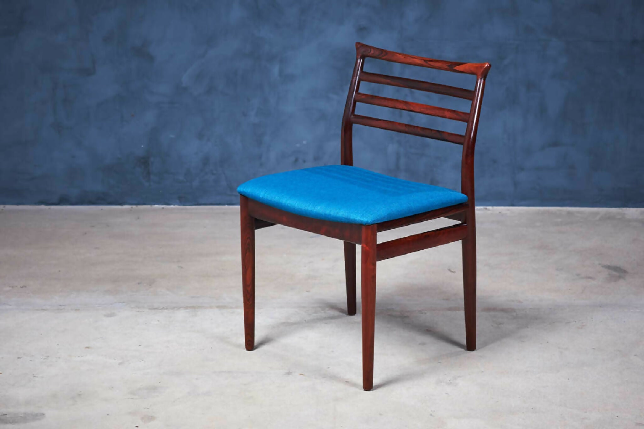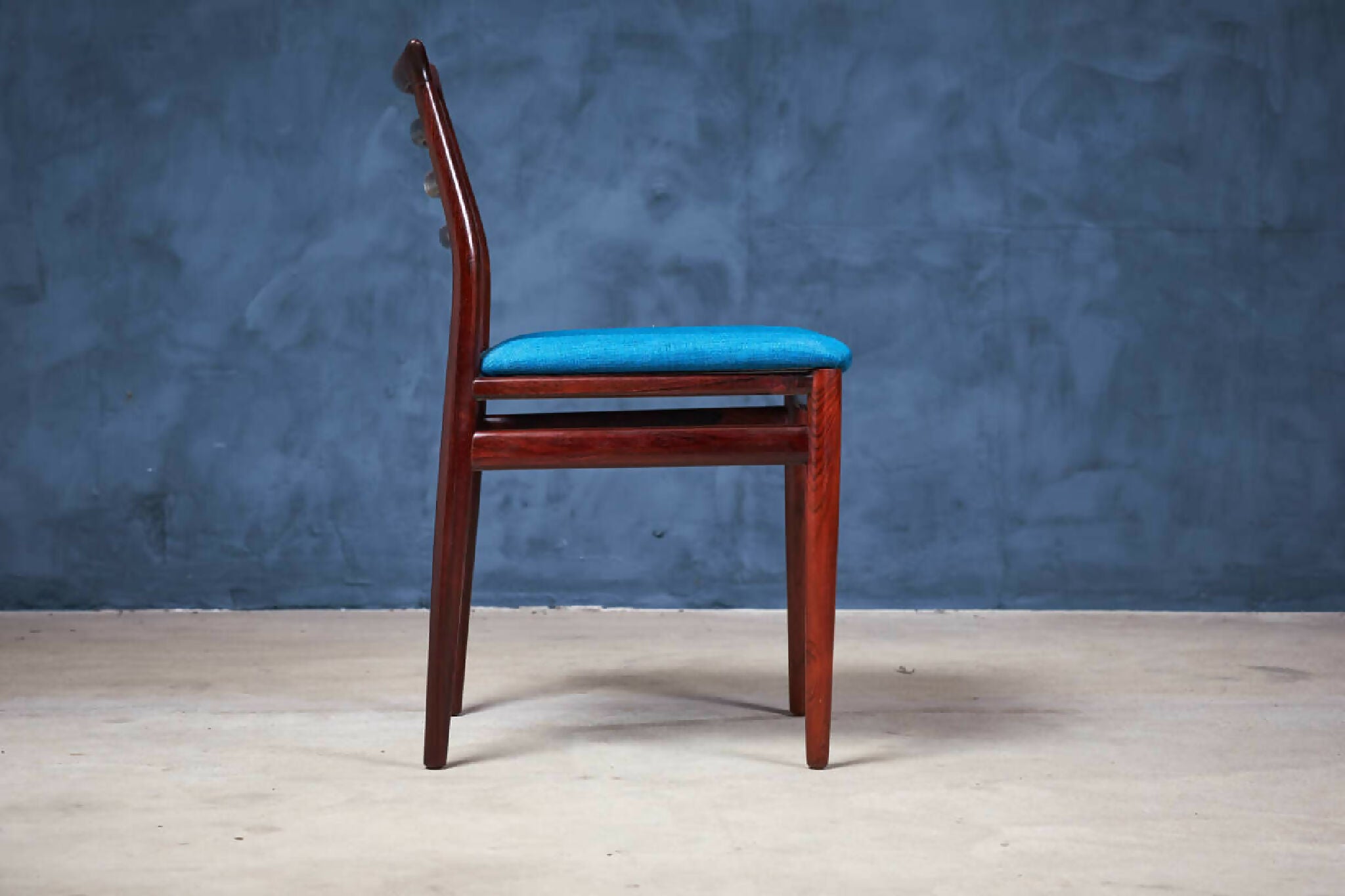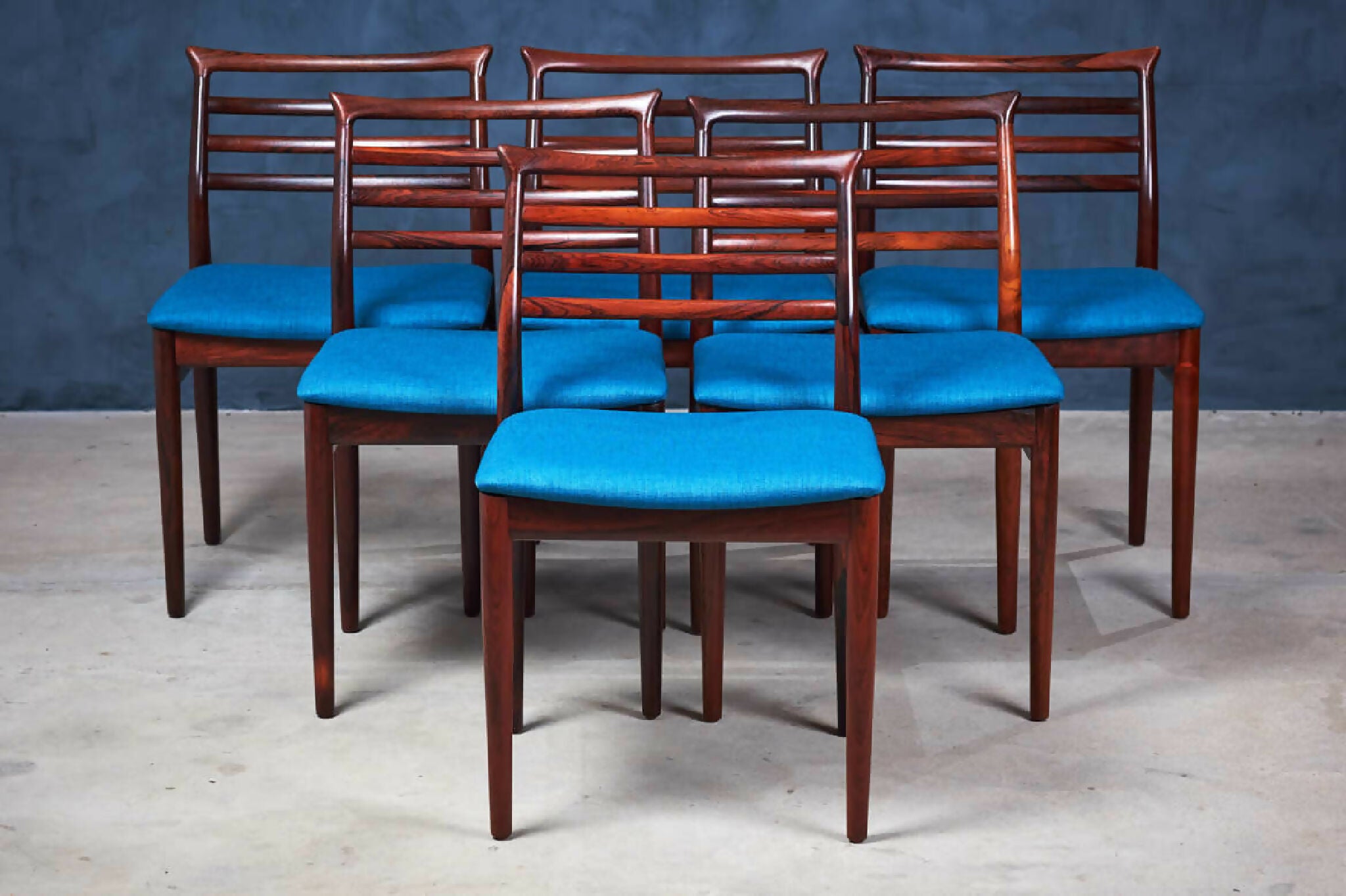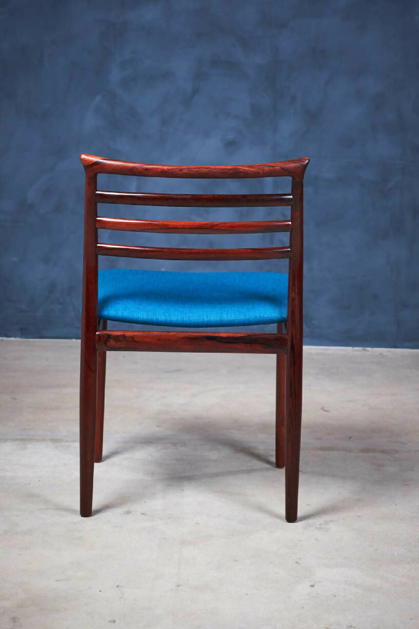 Model spisebordsstol designet af Erling Torvits for Sorø Stolefabrik i 1960’erne. Sættet består af seks stole udført i massiv palisander med smukt buede ryglæn og rene, organiske linjer. Et klassisk eksempel på dansk design, hvor håndværk og proportioner går op i en højere enhed.