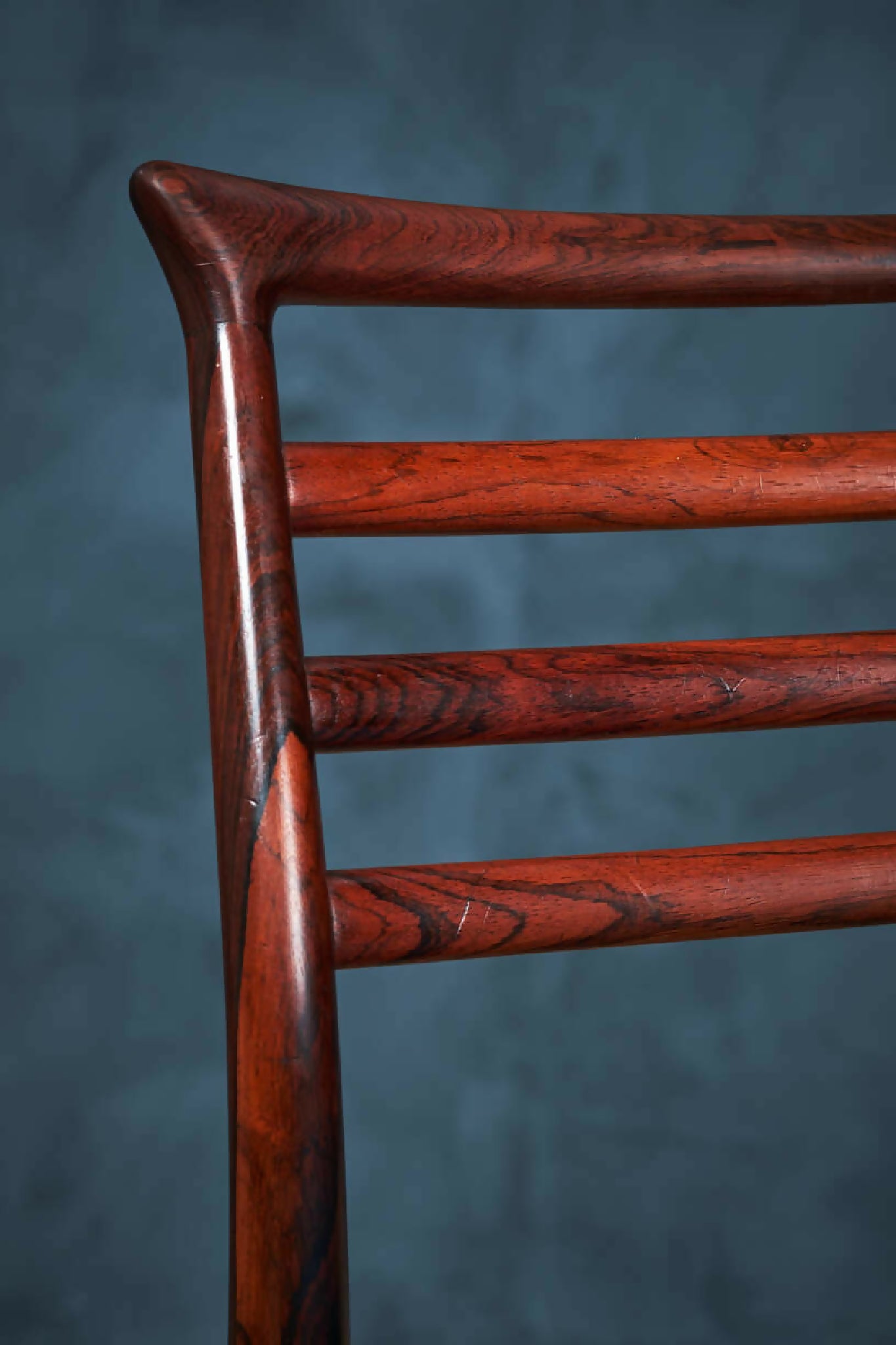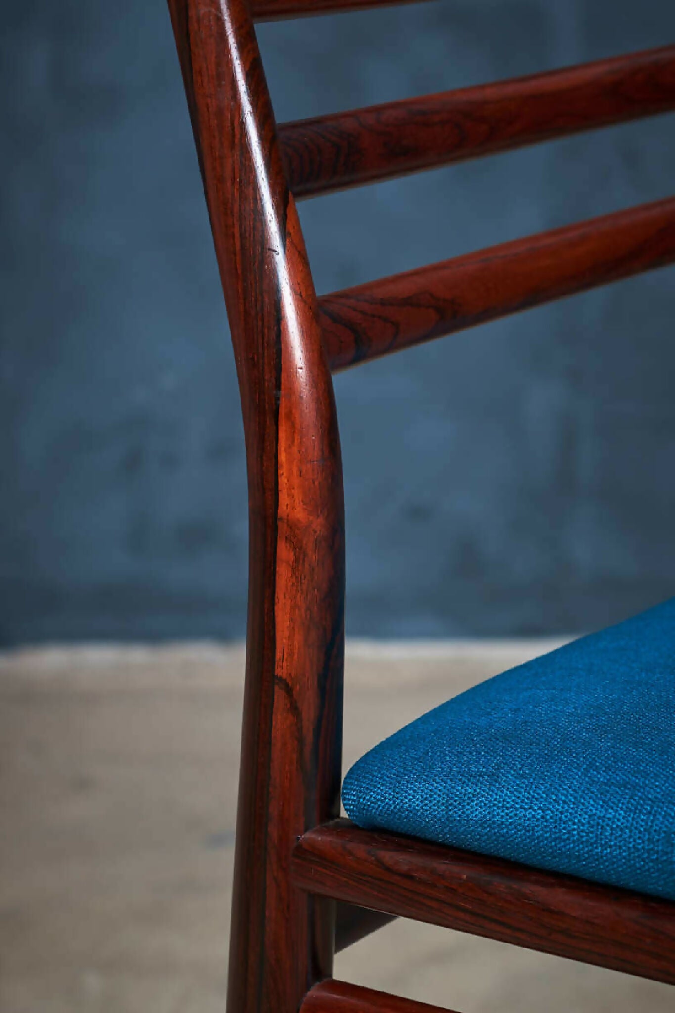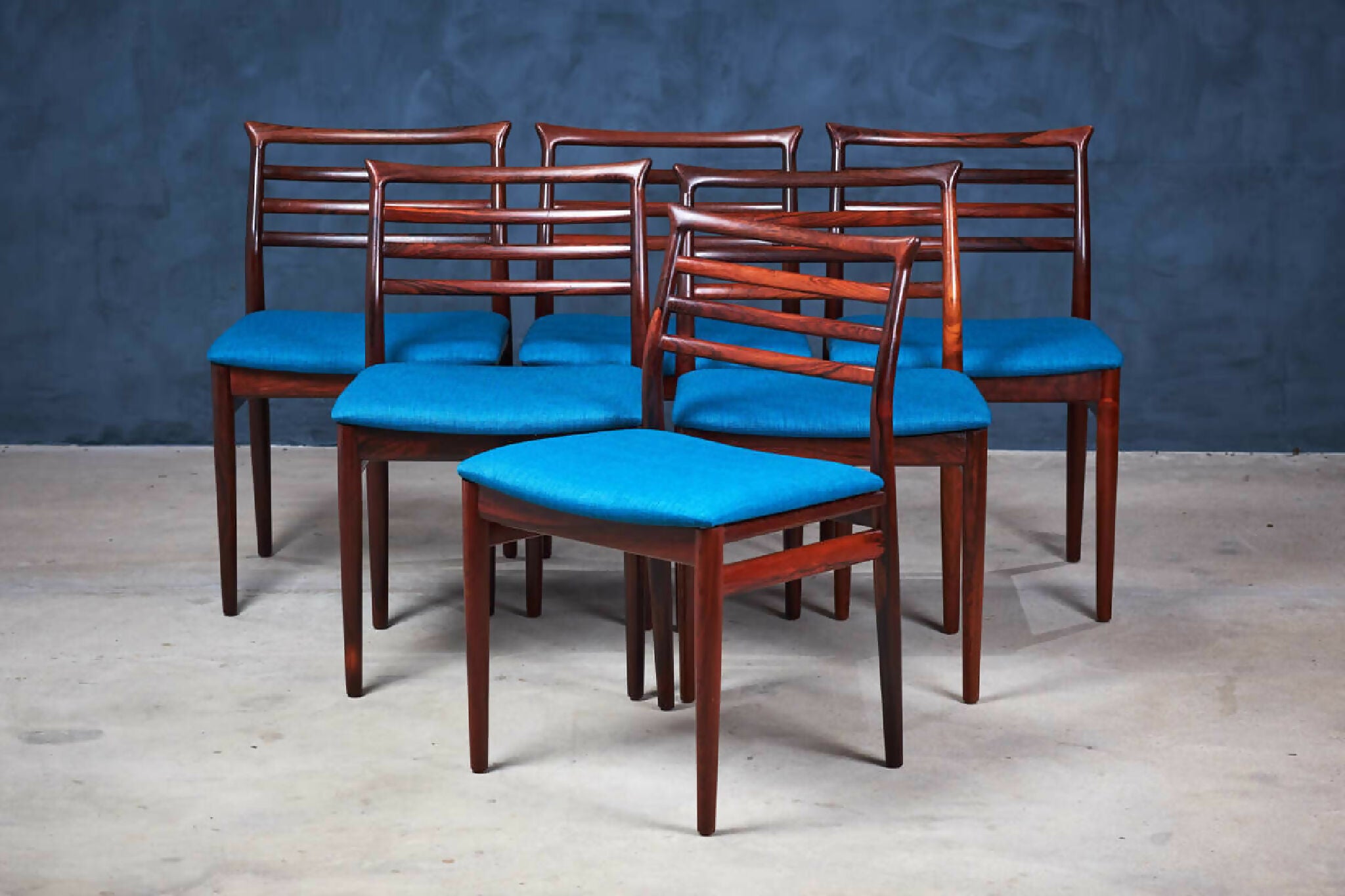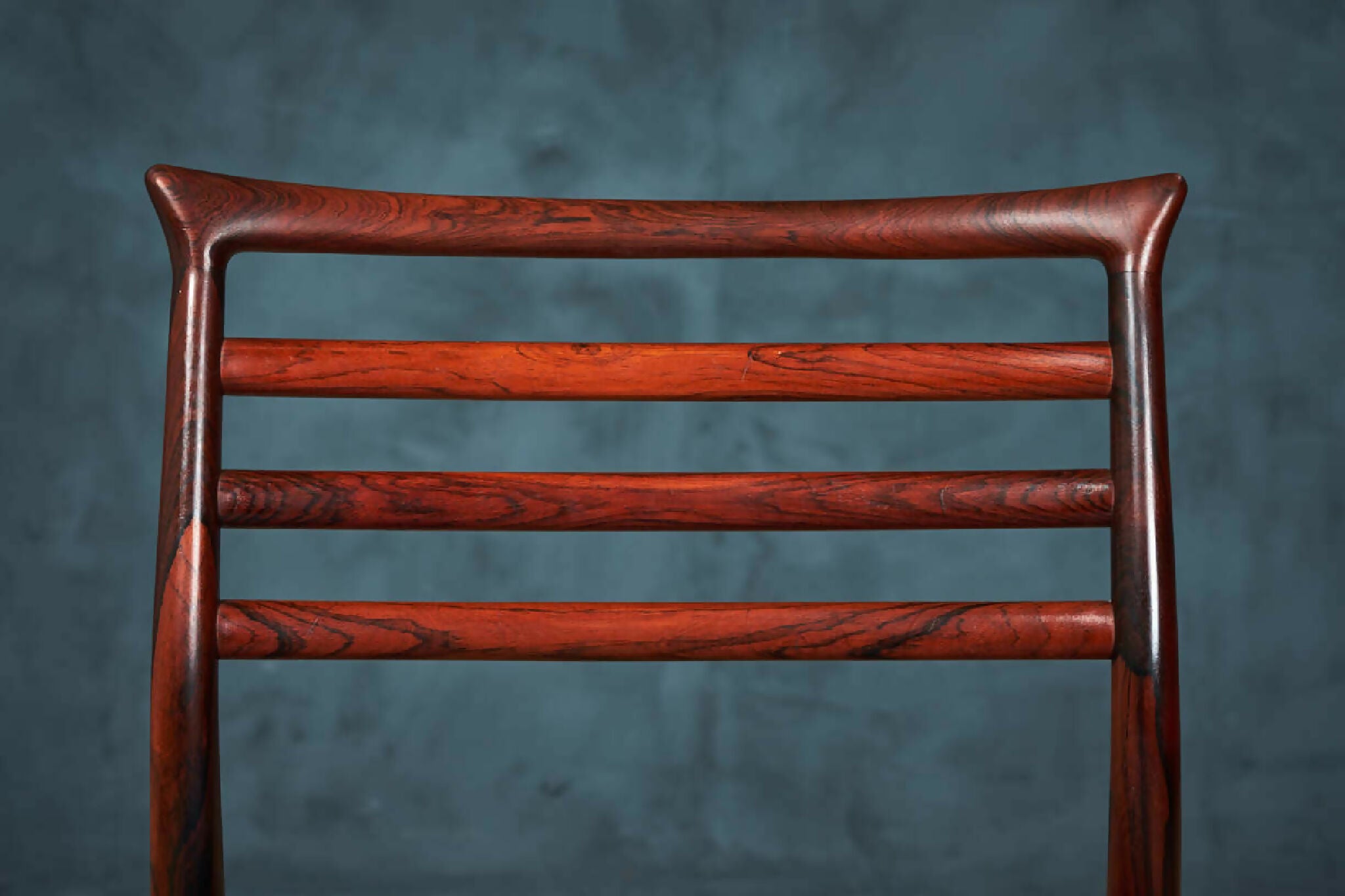 Model spisebordsstol designet af Erling Torvits for Sorø Stolefabrik i 1960’erne. Sættet består af seks stole udført i massiv palisander med smukt buede ryglæn og rene, organiske linjer. Et klassisk eksempel på dansk design, hvor håndværk og proportioner går op i en højere enhed.