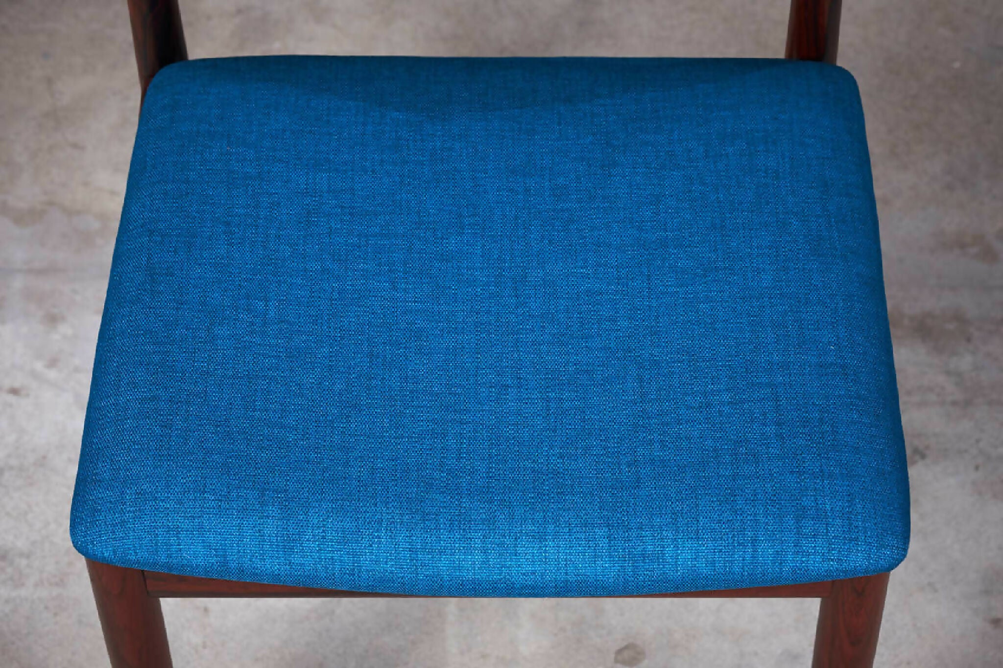Stolene er totalrestaureret af vores professionelle snedker og nybetrukket i blå kvalitetsstof med struktur. Efter ønske kan de også ombetrækkes i læder eller et andet tekstil. Fremstår i fremragende stand med kun få mindre overfladiske ridser efter alder.