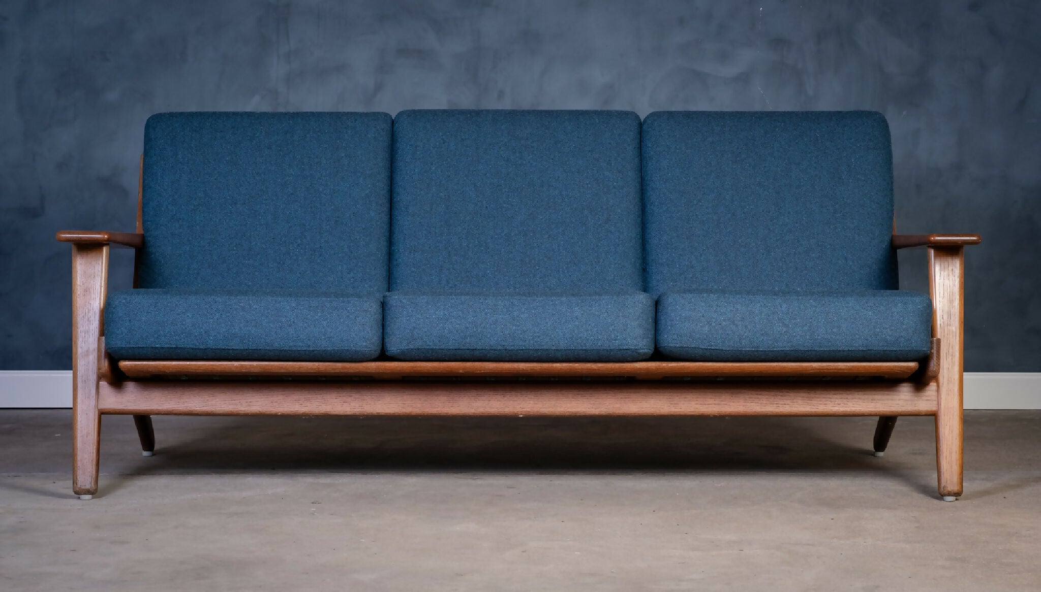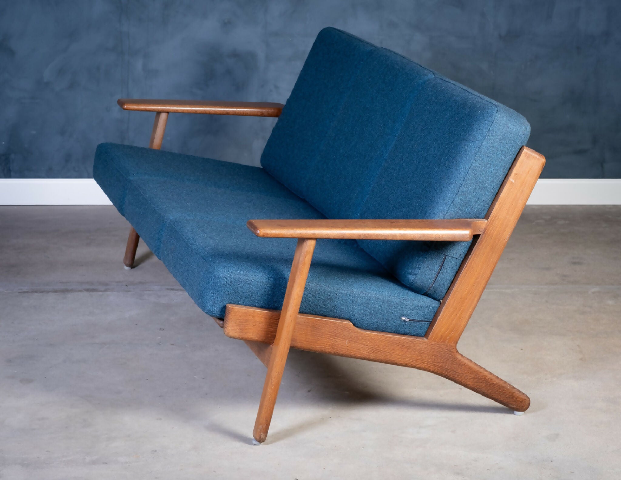 Model GE290 designet af Hans J. Wegner for Getama i 1960’erne. Sofaen er udført i massiv eg med originale blå hynder og er et ikonisk eksempel på Wegners evne til at forene funktion, komfort og skulpturel formgivning. Det solide stel, de karakteristiske skråtstillede ben og de brede armlæn giver sofaen et både robust og elegant udtryk.