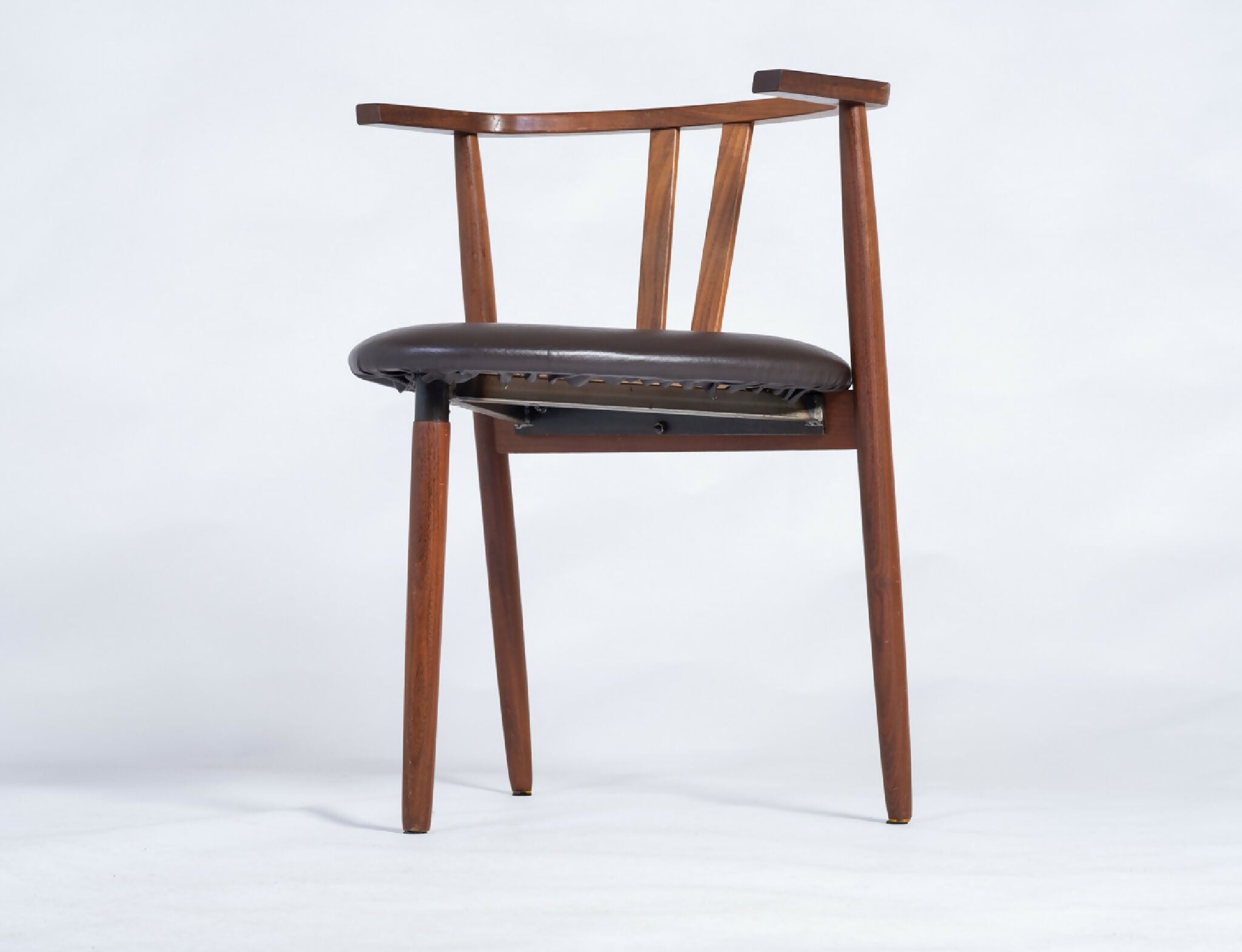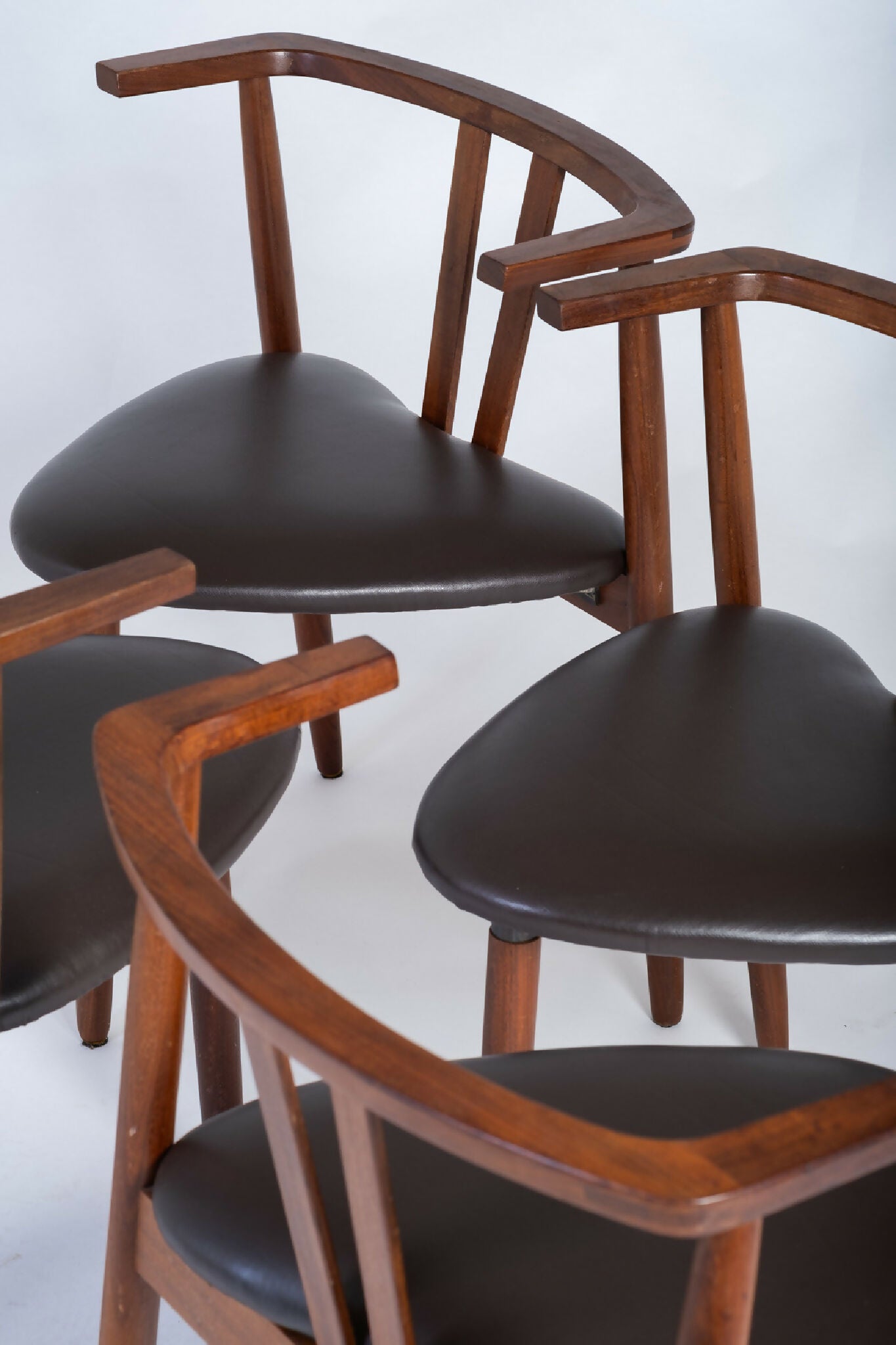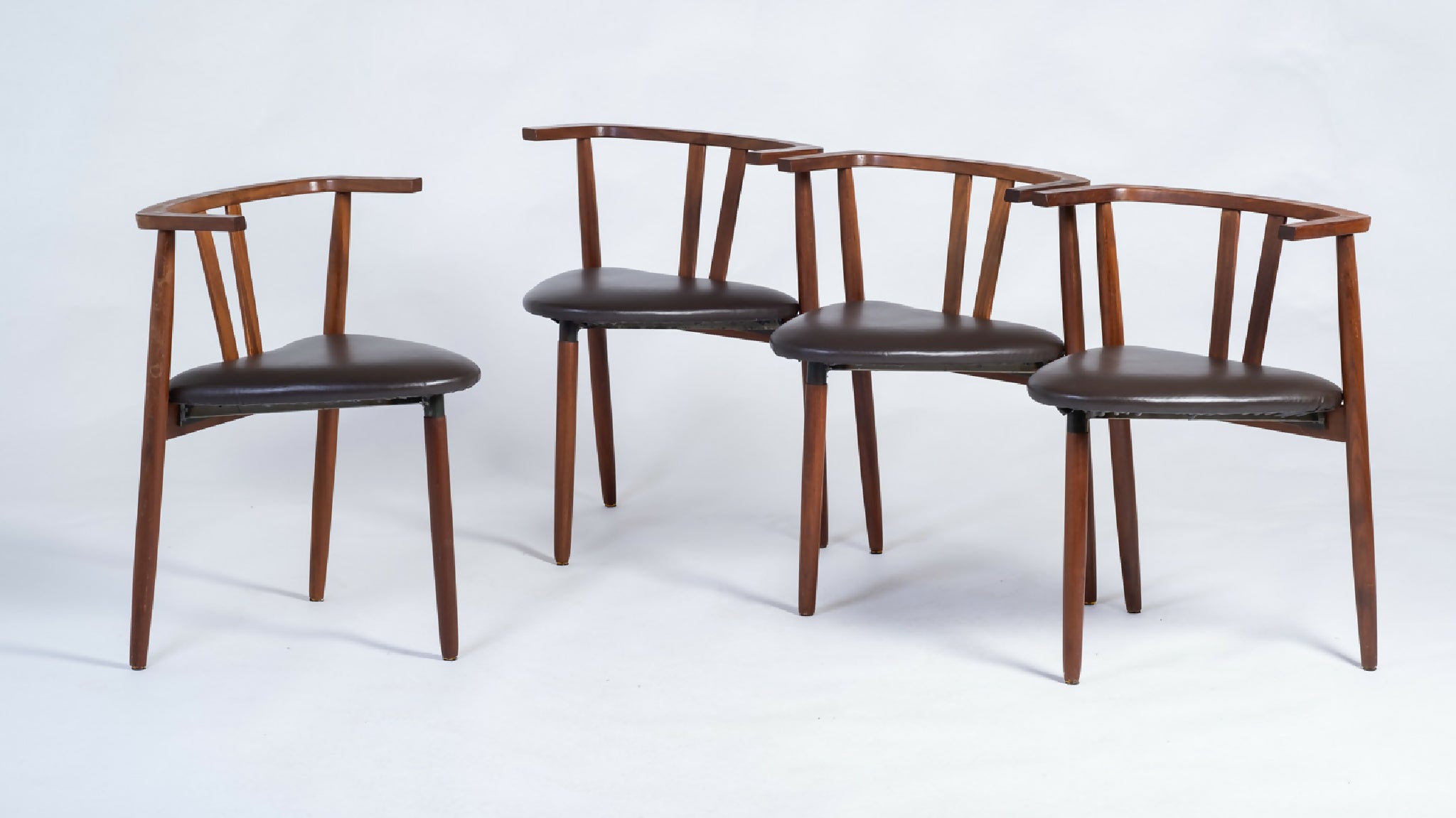 Model spisebordsstol designet af Hans Olsen, udført i afromosia (afrikansk teak) omkring 1960’erne. Sættet består af fire stole med et skulpturelt formsprog og høj siddekomfort – et kendetegn for Olsens organiske tilgang til møbeldesign. De bløde linjer og det varme træ giver stolene et harmonisk udtryk, der passer smukt ind i både moderne og klassiske indretninger.