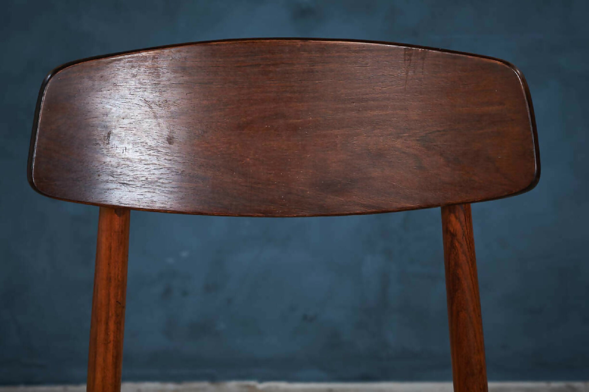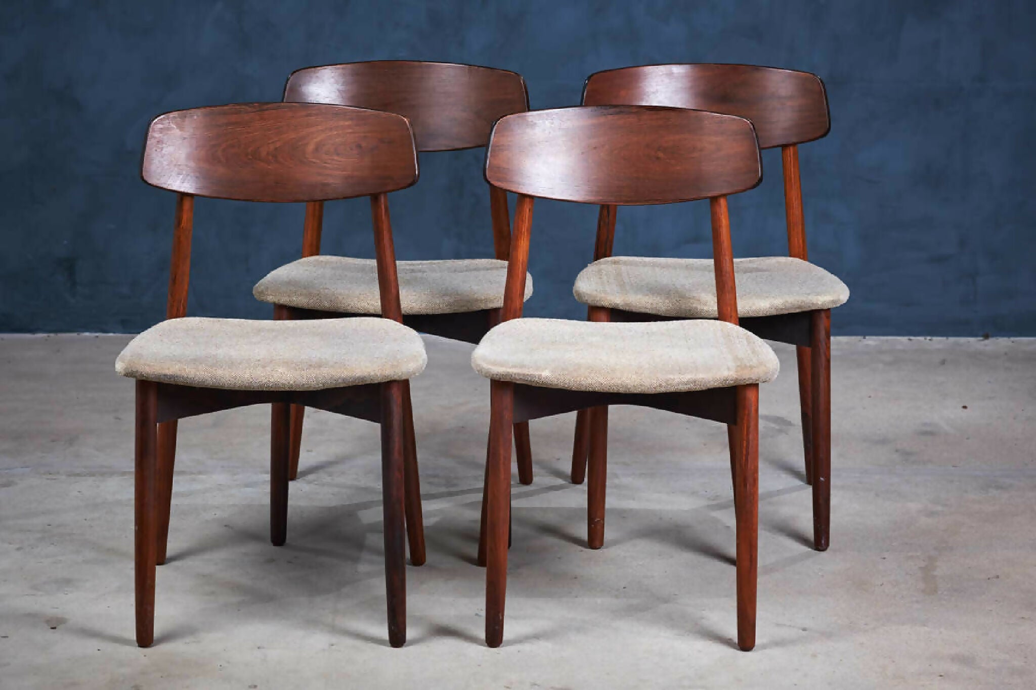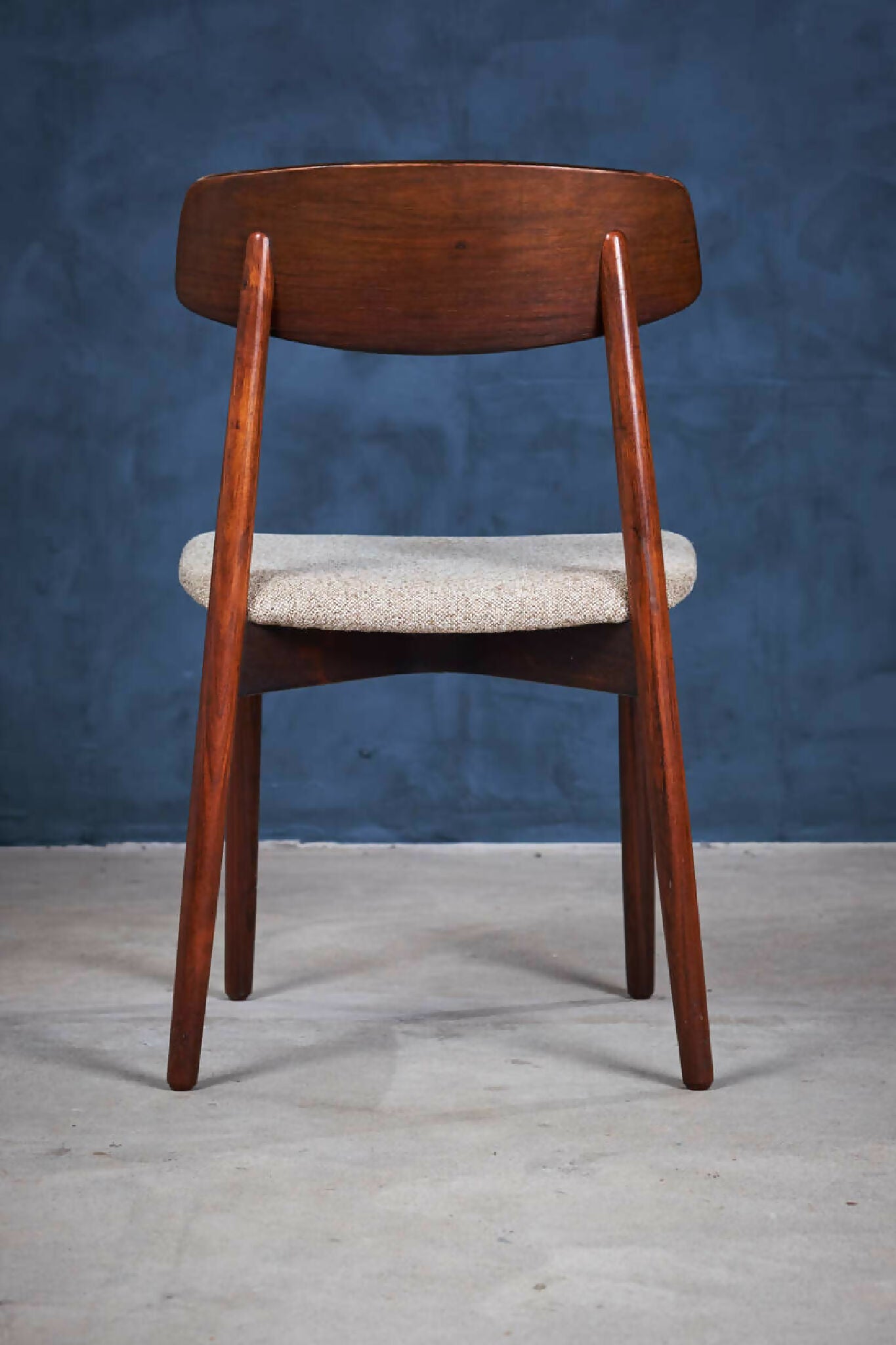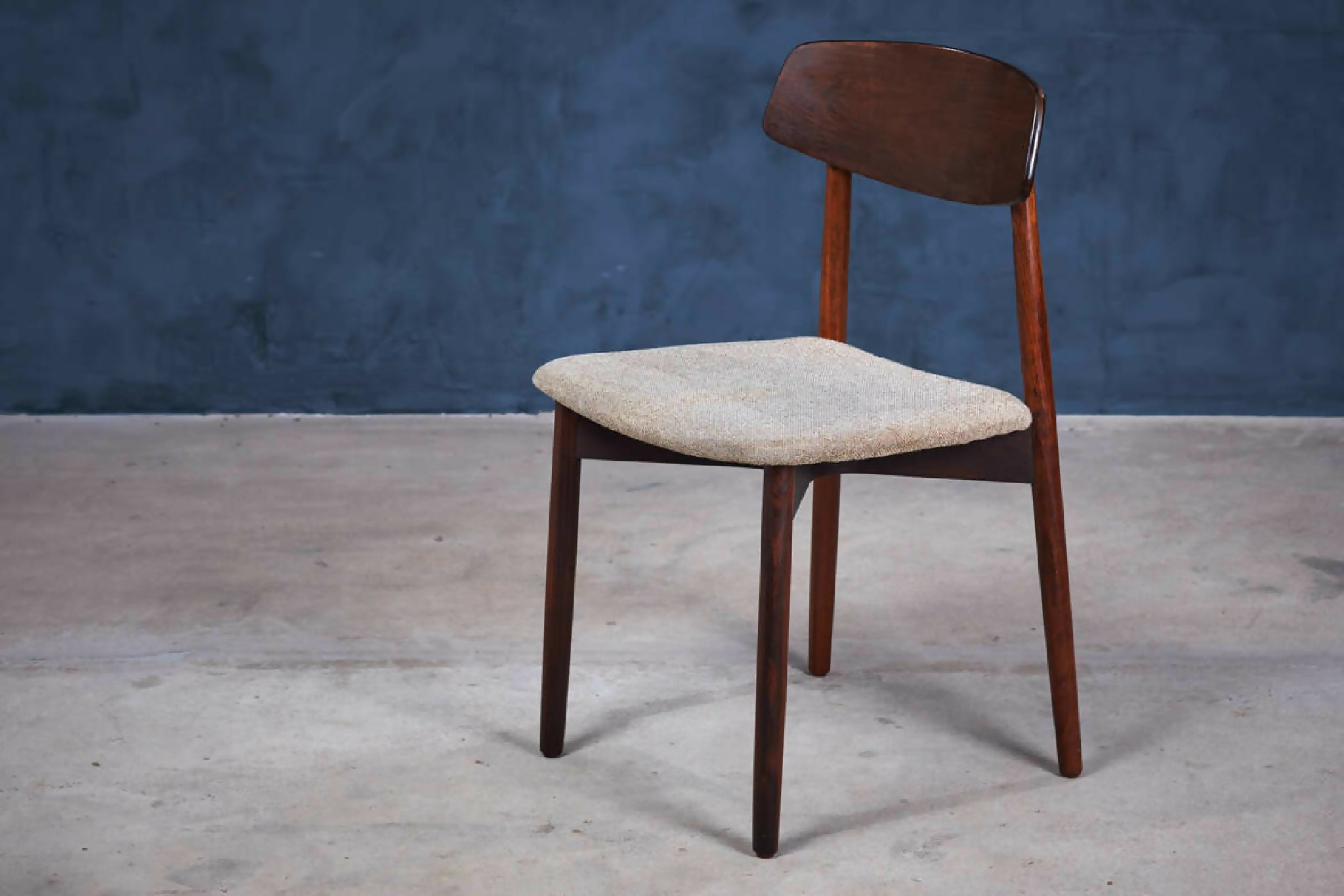 Model spisebordsstol designet af Harry Østergaard og fremstillet af Randers Møbelfabrik i 1960’erne. Stolene er udført i massiv palisander med slanke, tilspidsede ben og et let buet sæde, der hviler på en elegant X-formet konstruktion. Det fine snedkerarbejde og træets markante åretegninger understreger den høje kvalitet og det raffinerede formsprog.