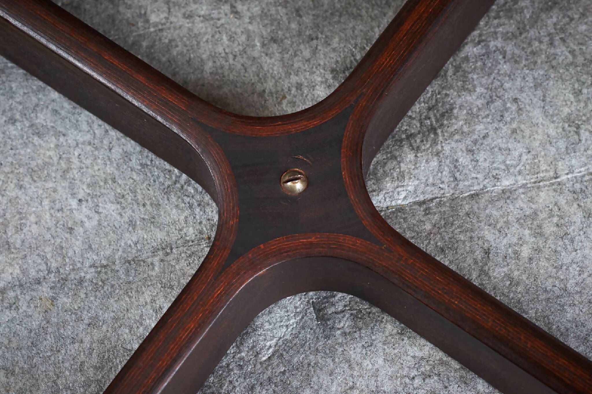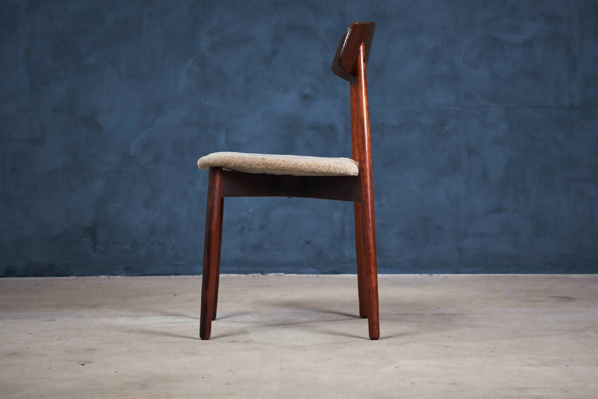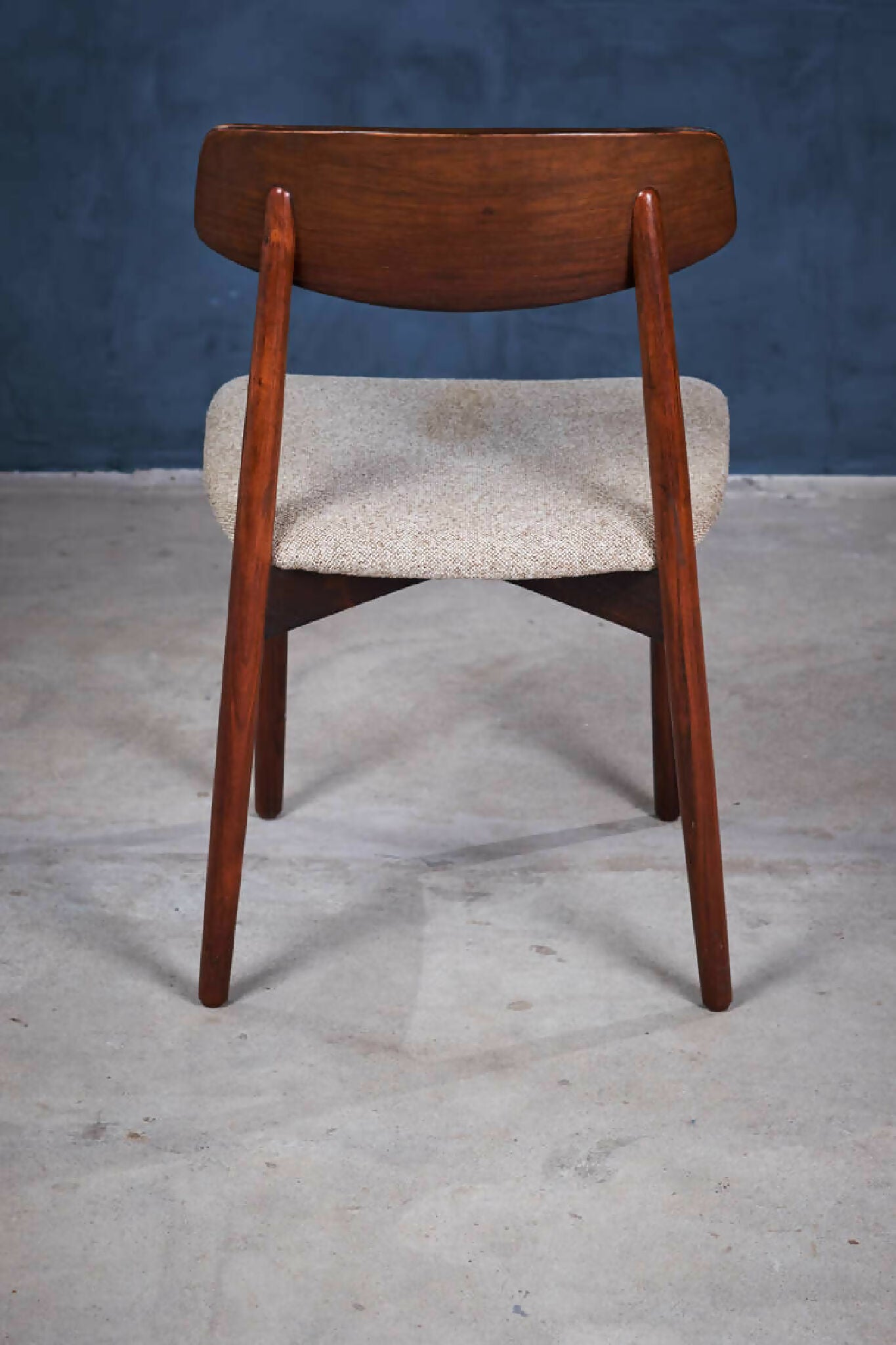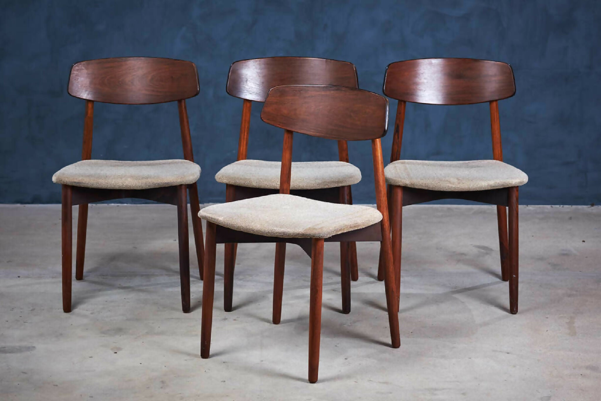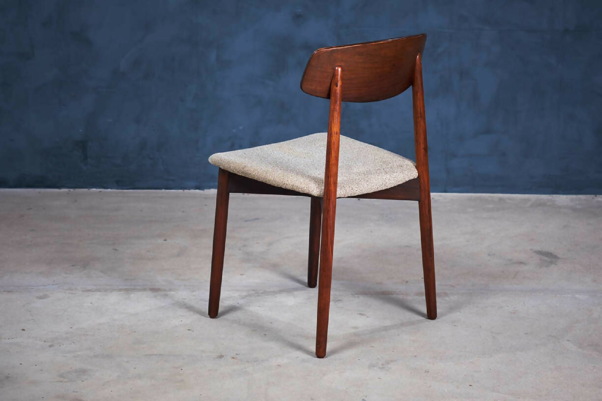 Model spisebordsstol designet af Harry Østergaard og fremstillet af Randers Møbelfabrik i 1960’erne. Stolene er udført i massiv palisander med slanke, tilspidsede ben og et let buet sæde, der hviler på en elegant X-formet konstruktion. Det fine snedkerarbejde og træets markante åretegninger understreger den høje kvalitet og det raffinerede formsprog.
