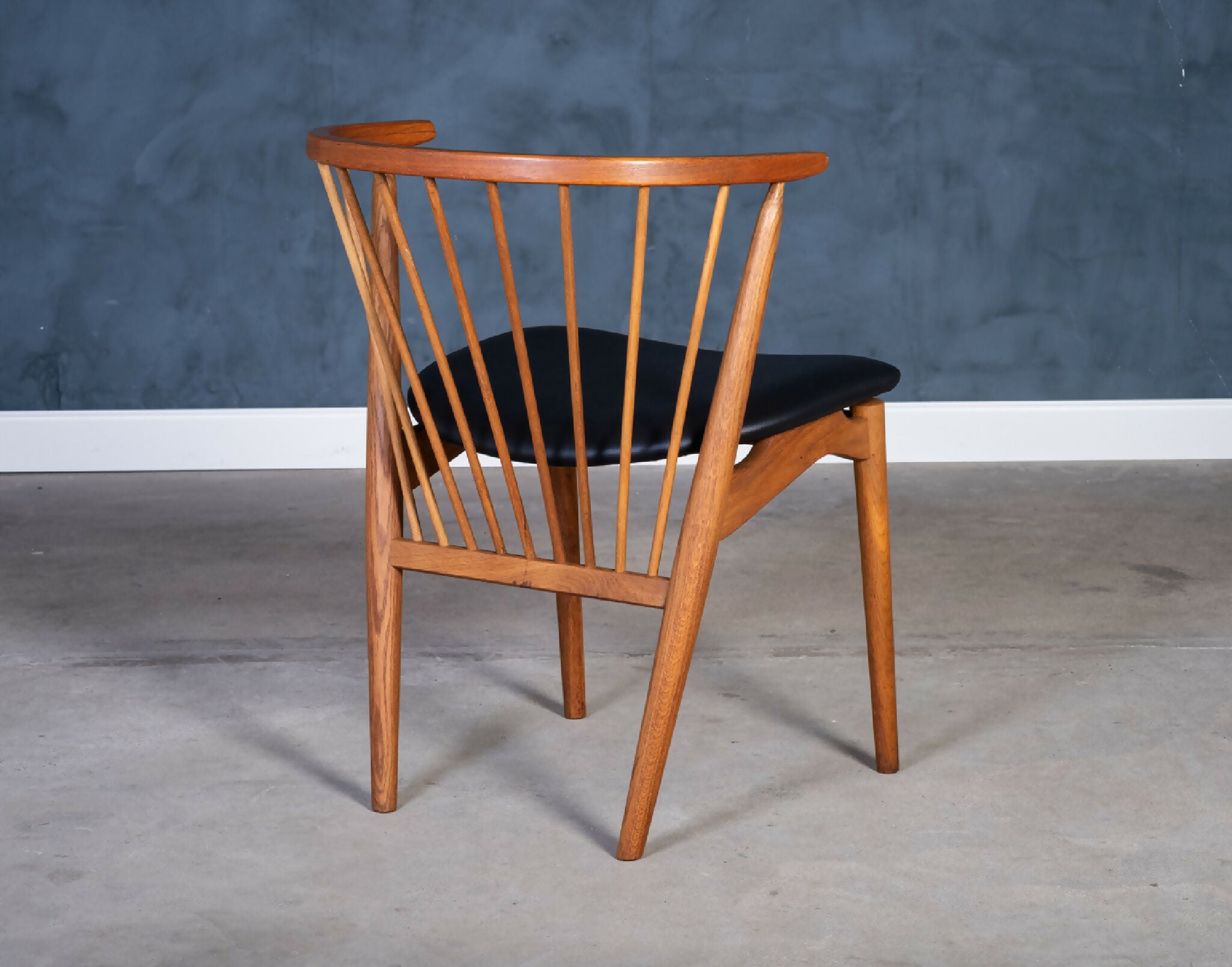 Model stol designet af Helge Sibast for Sibast Møbelfabrik i 1960’erne. Stolen er udført i en harmonisk kombination af teak og eg med smukt afrundede former og præcise samlinger, der vidner om Sibasts høje håndværksmæssige niveau. Det skulpturelle ryglæn og den naturlige læderpolstring giver stolen både komfort og visuel lethed – et fornemt eksempel på dansk modernisme.