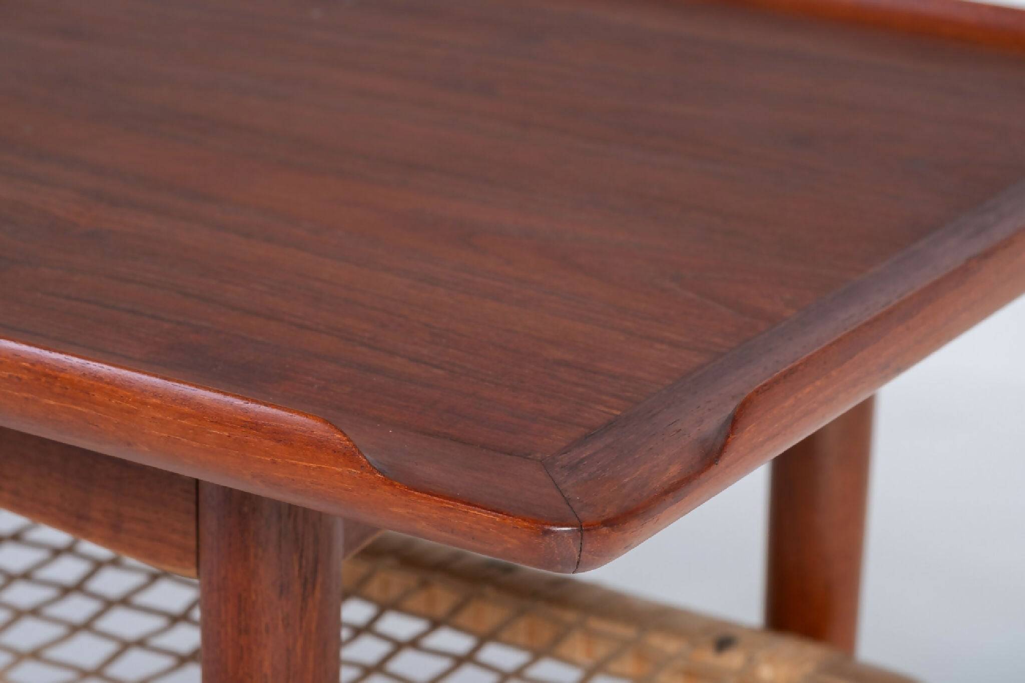 Model sidebord designet af Holger Georg Jensen, Danmark 1960’erne. Bordet er udført i teak med forhøjede kanter og en elegant flethylde, der tilføjer lethed og funktion til designet. De afrundede hjørner og det præcise håndværk afspejler Jensen’s sans for proportioner og klassisk dansk æstetik.