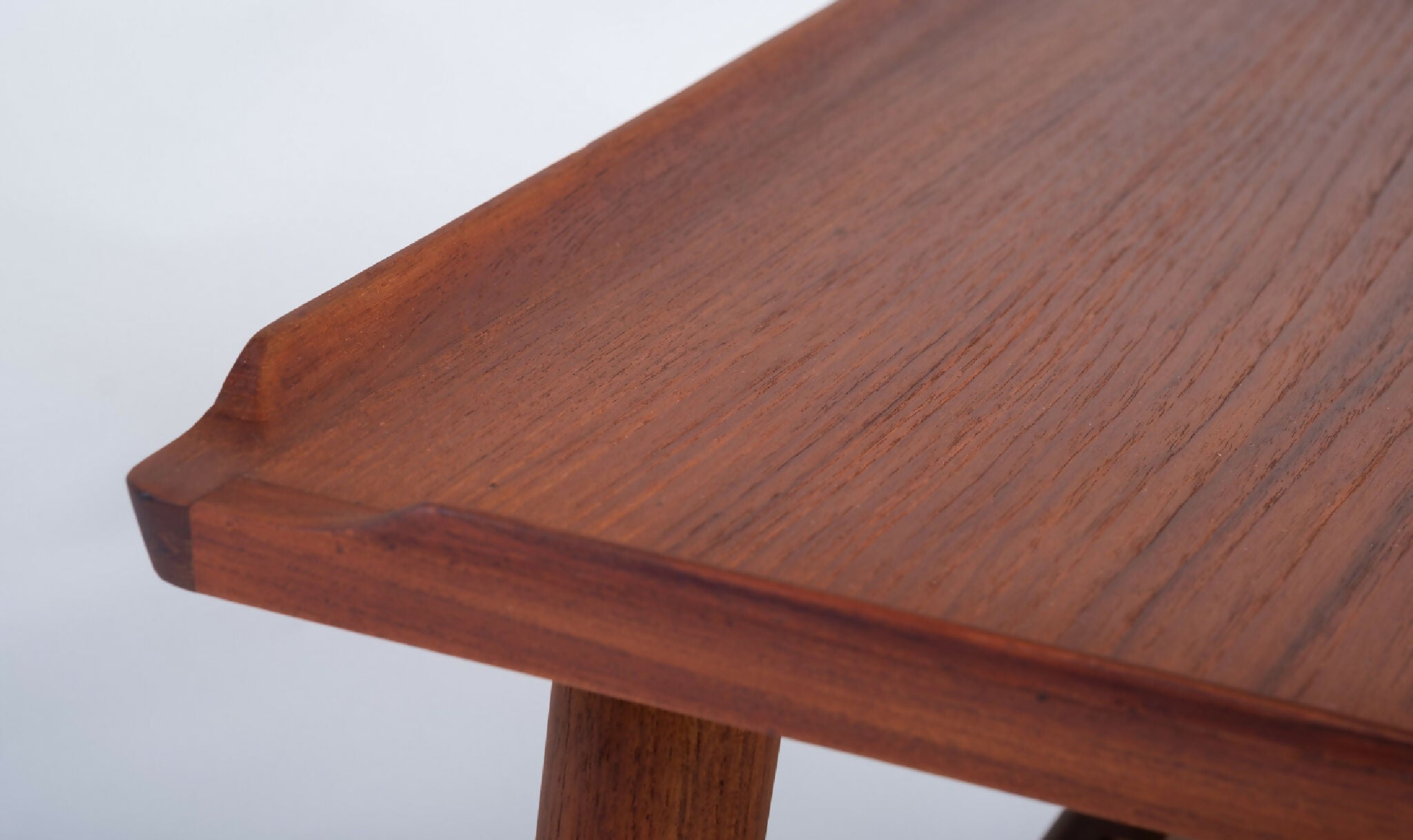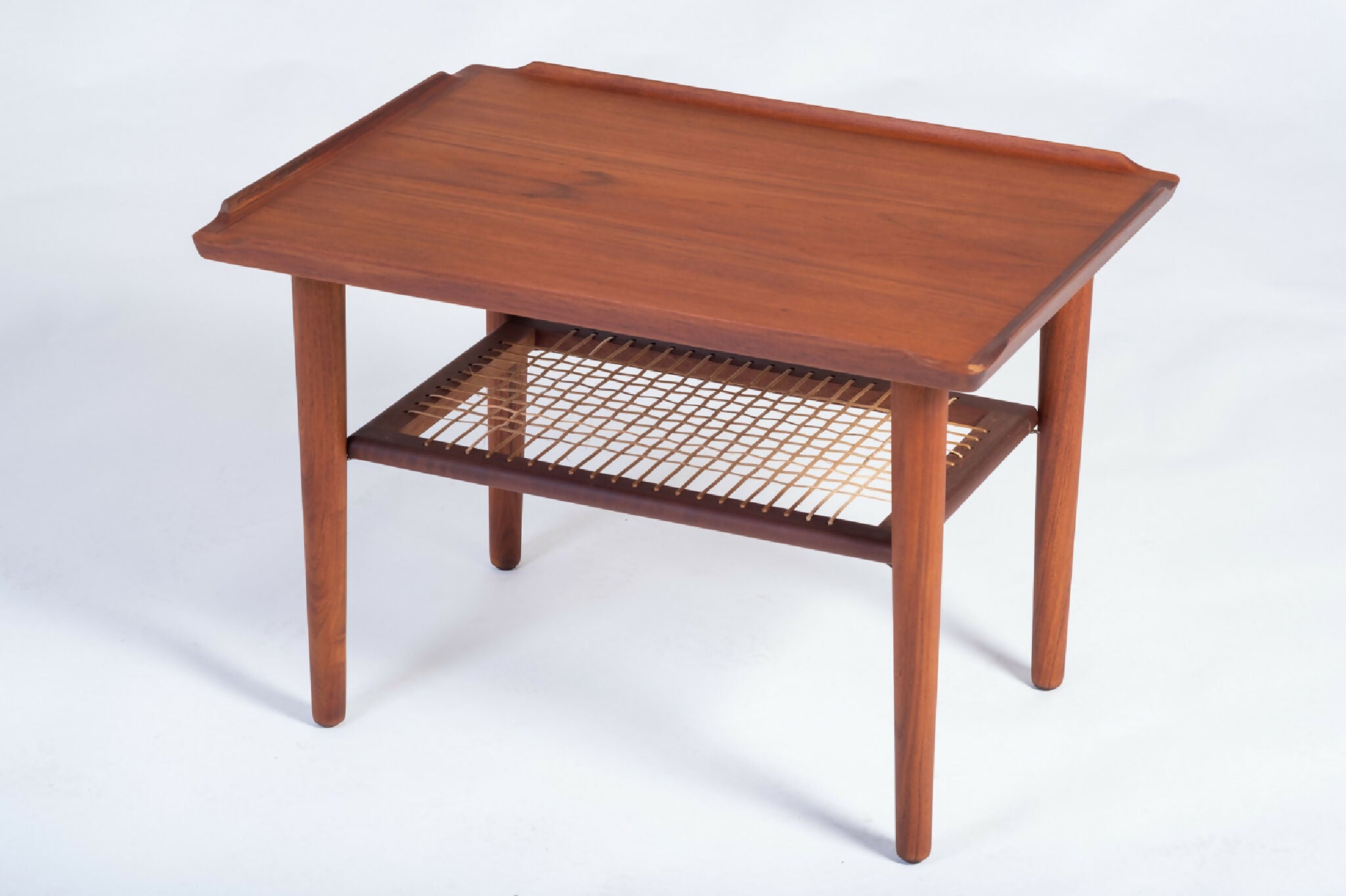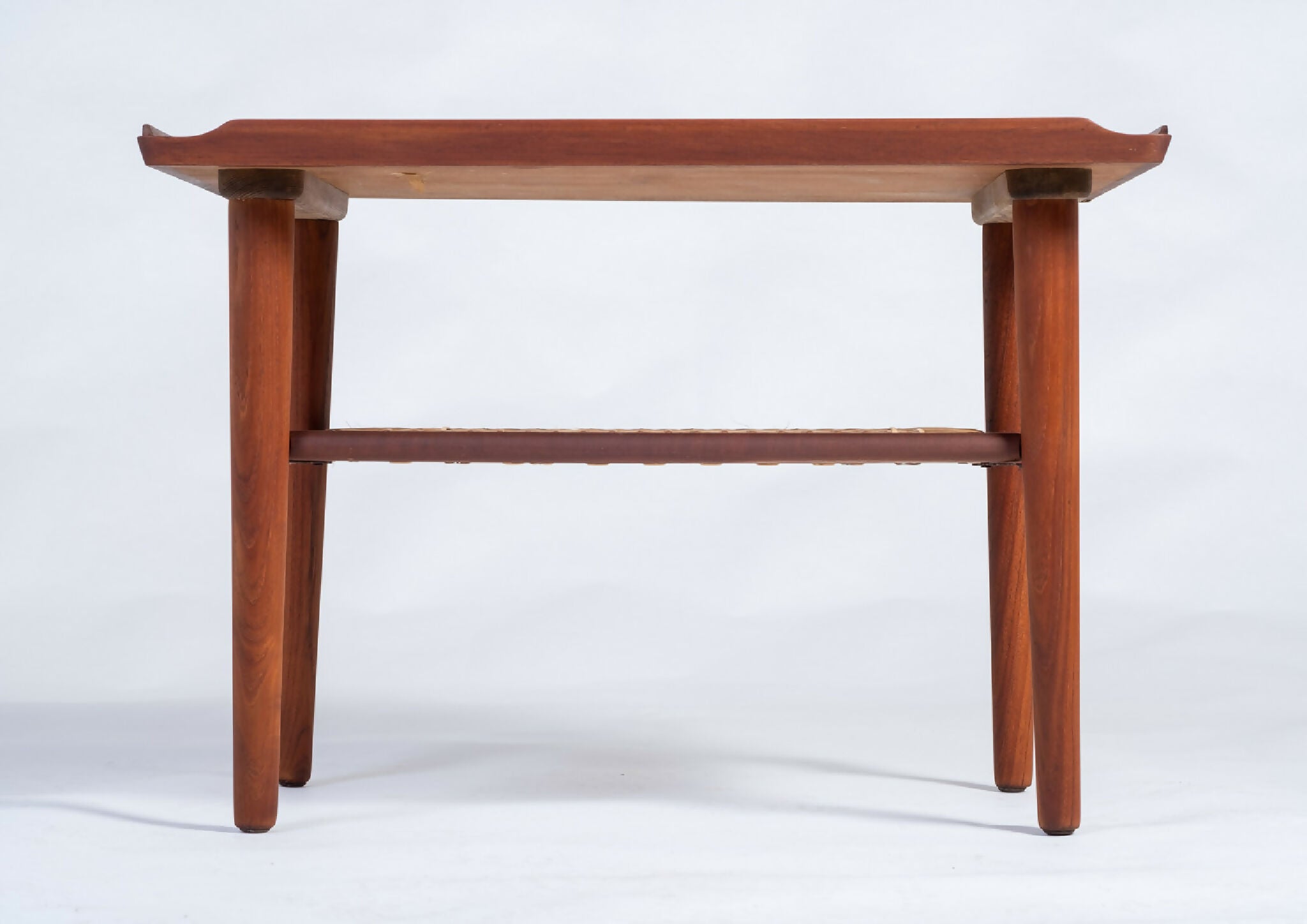 Model sofabord designet af Holger Georg Jensen, Danmark 1960’erne. Bordet er udført i teak med let hævede kanter og en elegant flethylde, der tilfører varme og funktionalitet til det rene design. De afrundede former og den velafbalancerede konstruktion viser tydeligt Jensen’s sans for proportioner og dansk håndværkstradition.