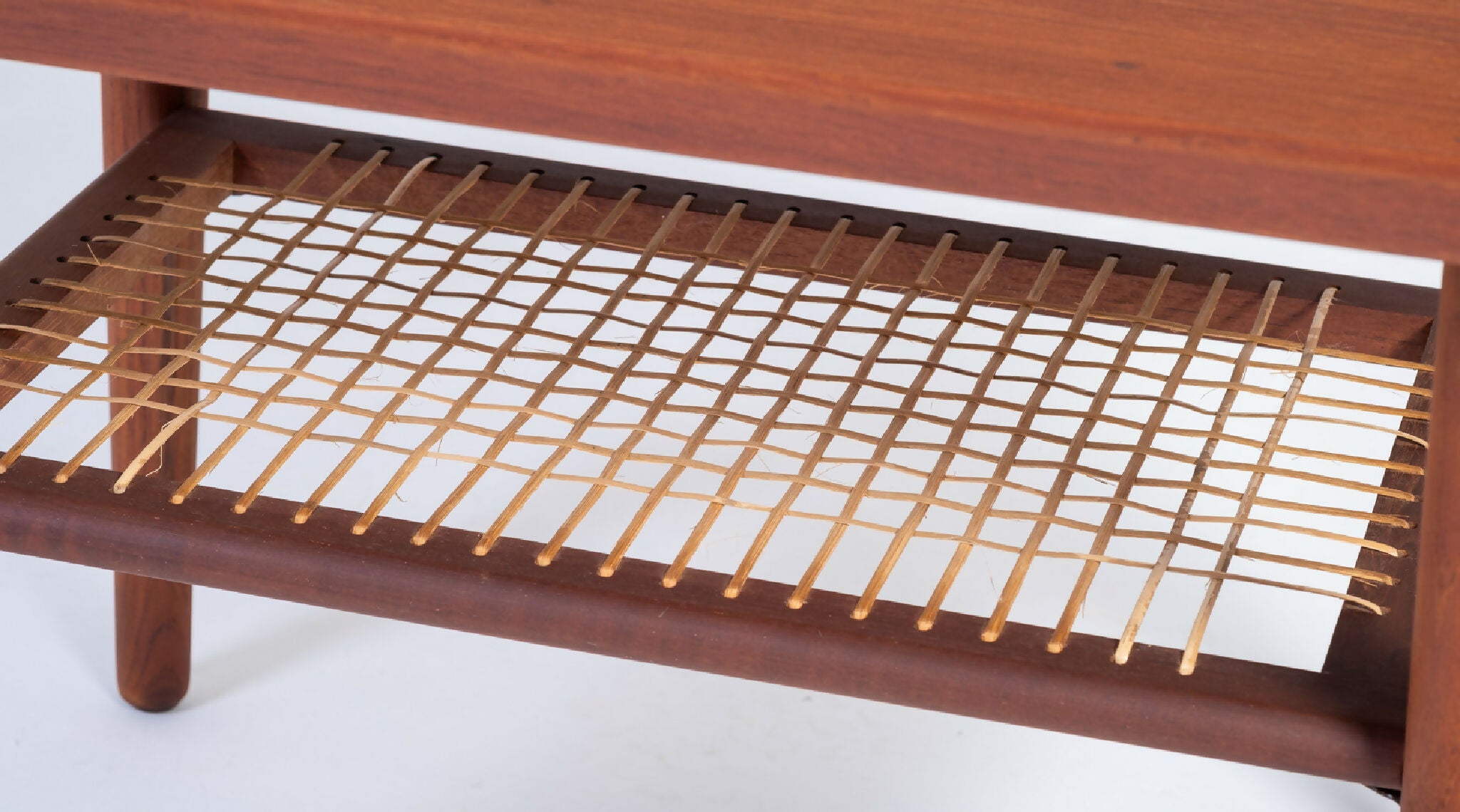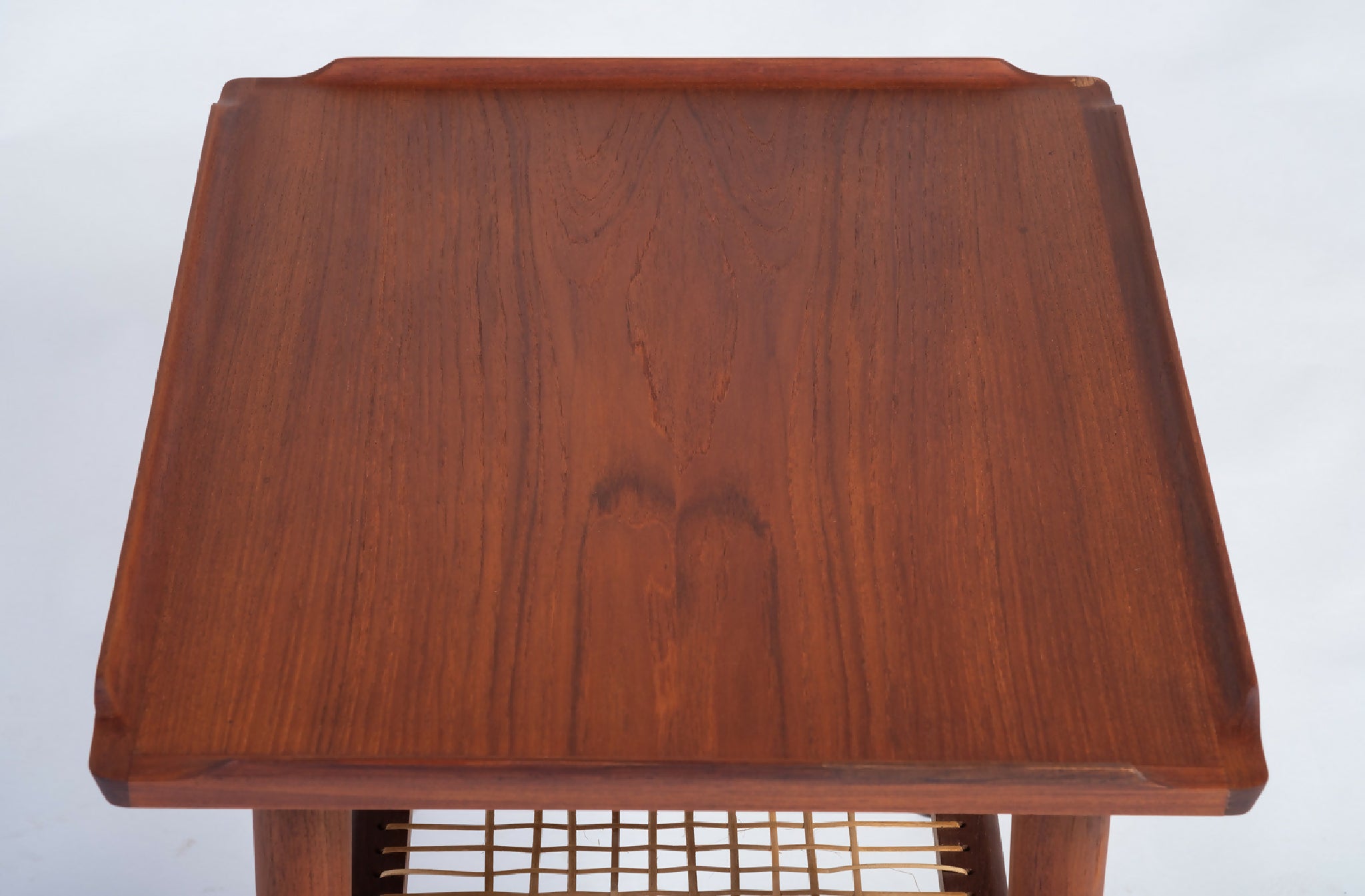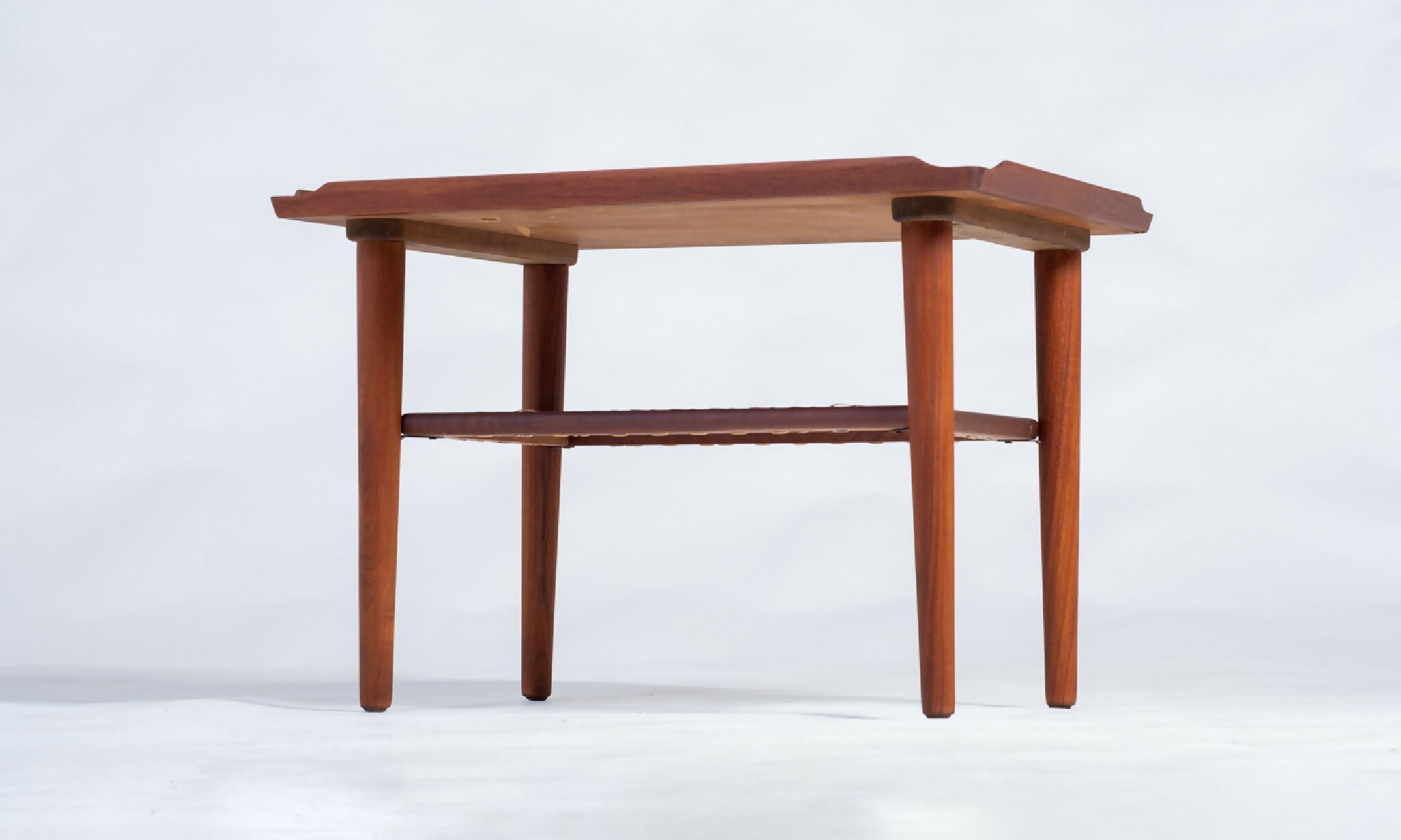 Model sofabord designet af Holger Georg Jensen, Danmark 1960’erne. Bordet er udført i teak med let hævede kanter og en elegant flethylde, der tilfører varme og funktionalitet til det rene design. De afrundede former og den velafbalancerede konstruktion viser tydeligt Jensen’s sans for proportioner og dansk håndværkstradition.