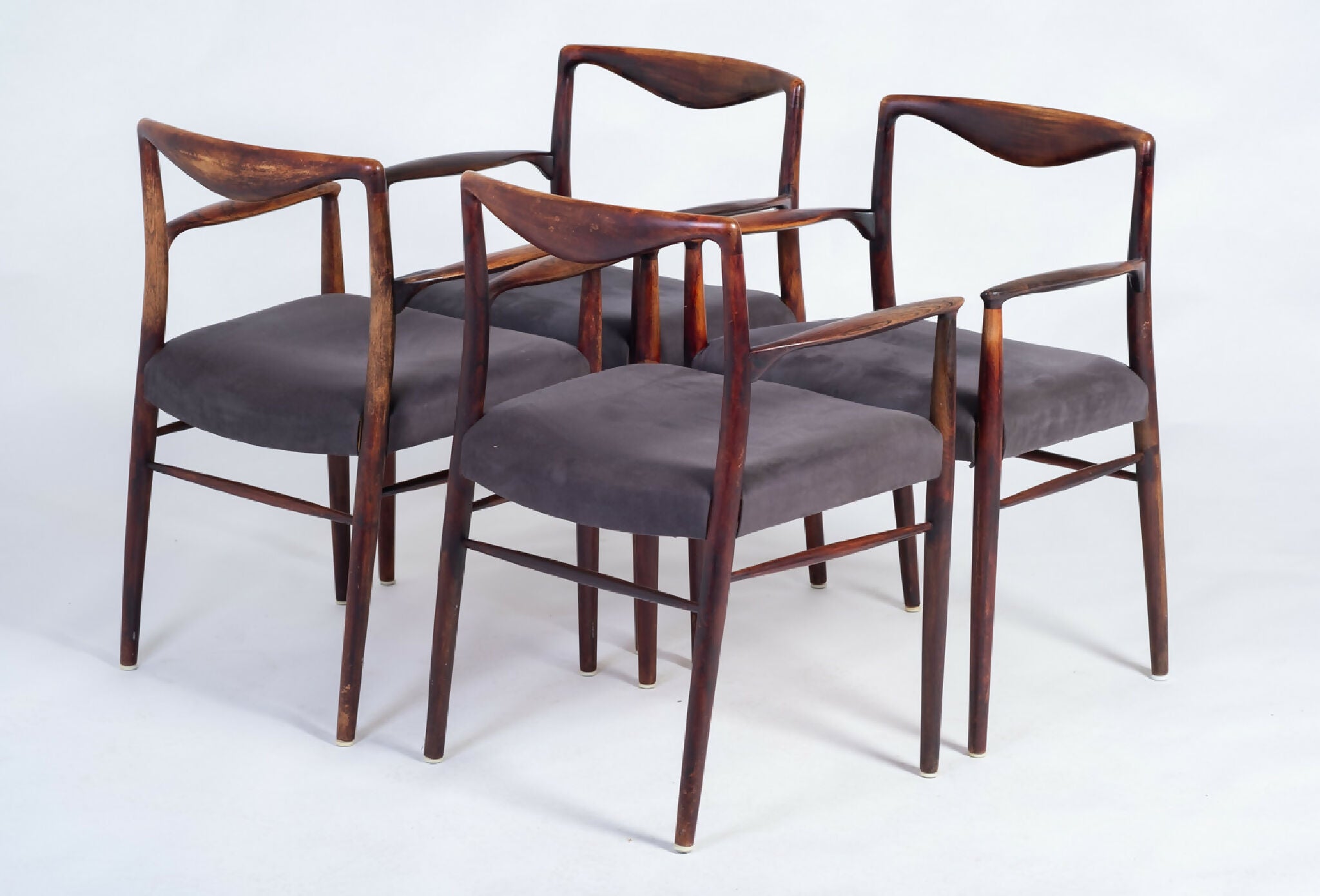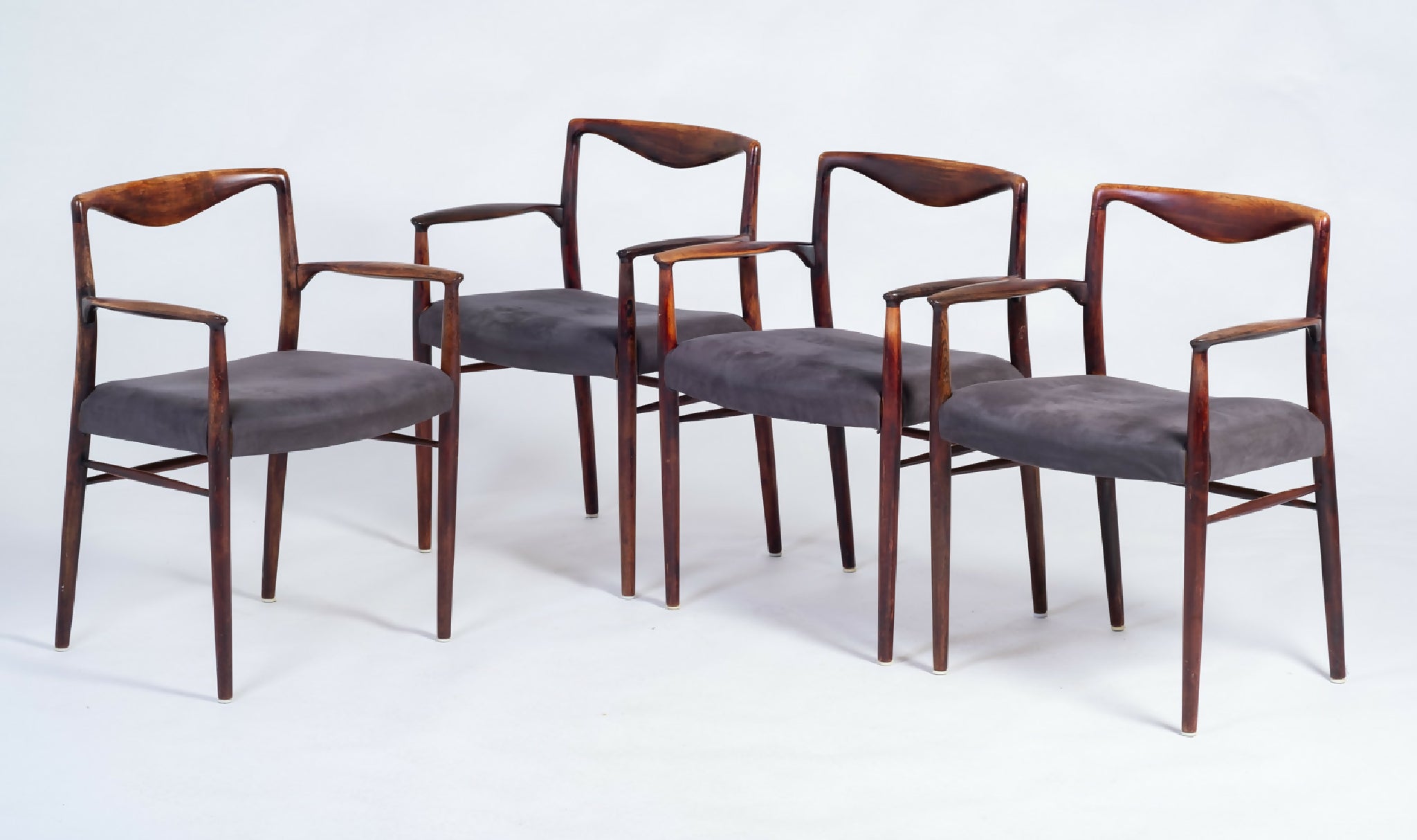 Sæt af fire armstole designet af Kai Lyngfeldt Larsen og produceret af Søren Willadsen Møbelfabrik i Danmark i 1960’erne. Stolene er udført i massiv palisander med et elegant, skulpturelt formsprog, der kombinerer raffineret håndværk og tidløs funktionalitet.