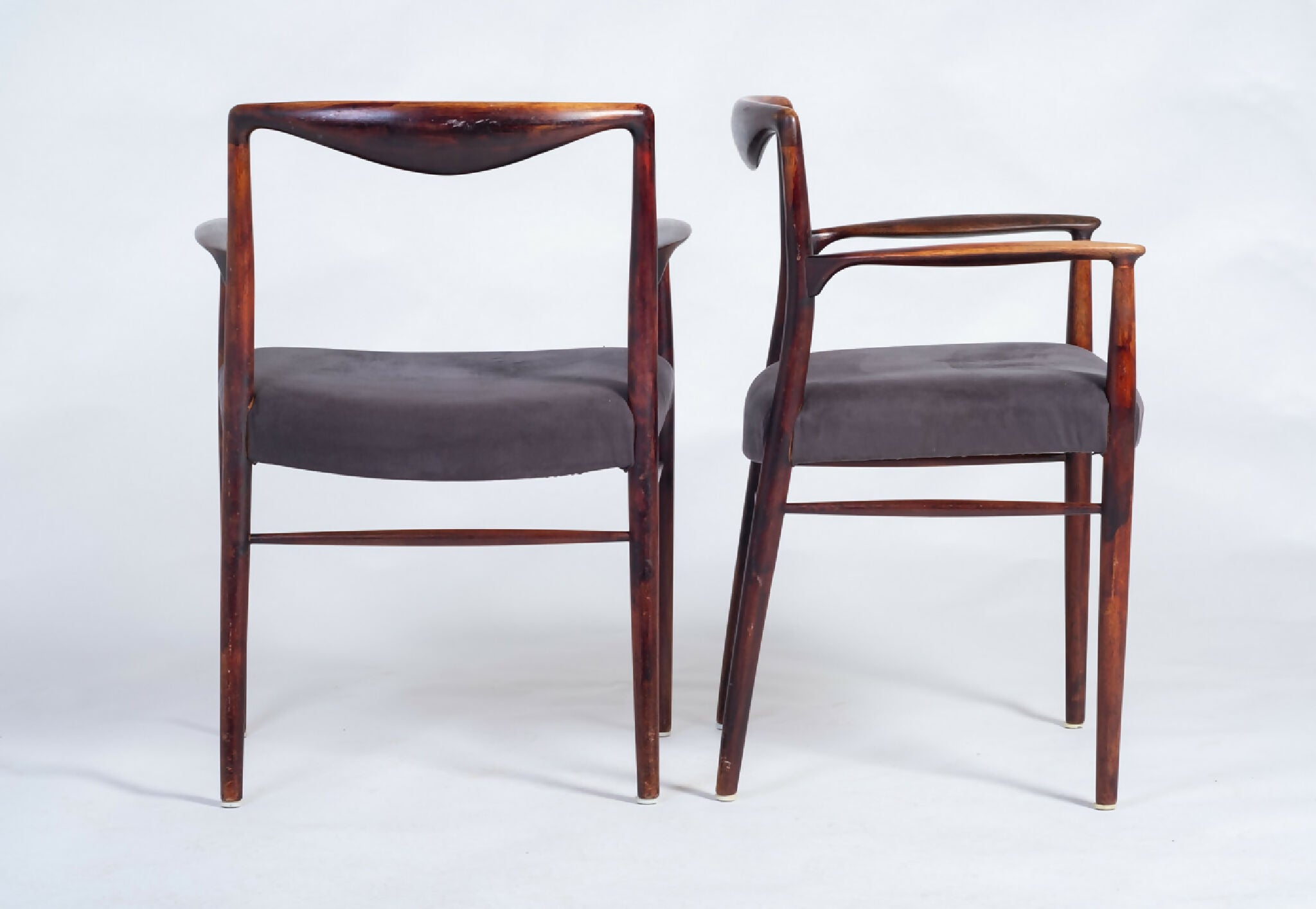 Designet er et smukt eksempel på dansk møbelkunst fra perioden, hvor organiske linjer og præcise samlinger skaber både komfort og æstetik. Stolene fremstår i meget fin vintage stand med en jævn patina, der understreger palisandertræets dybe glød og struktur.