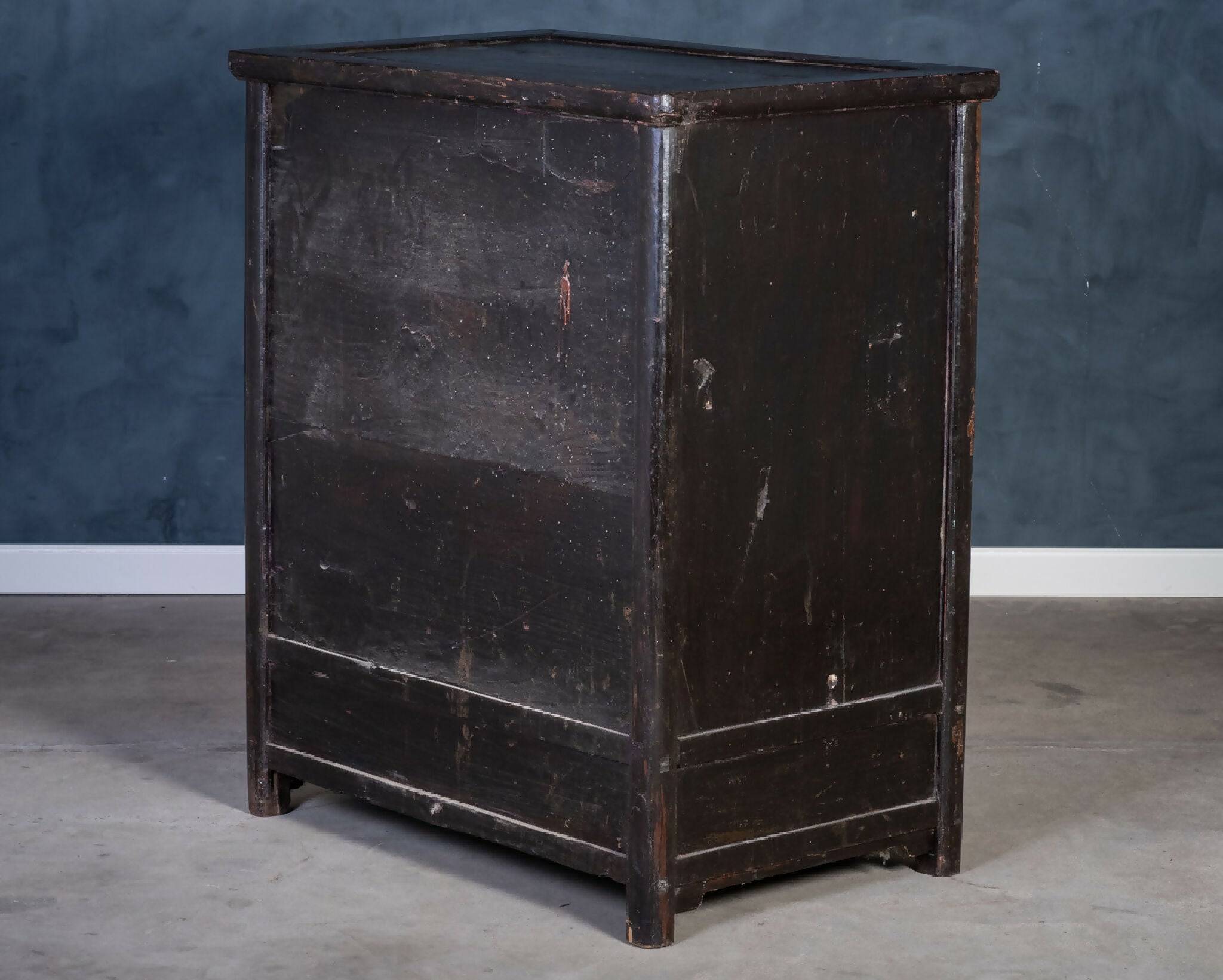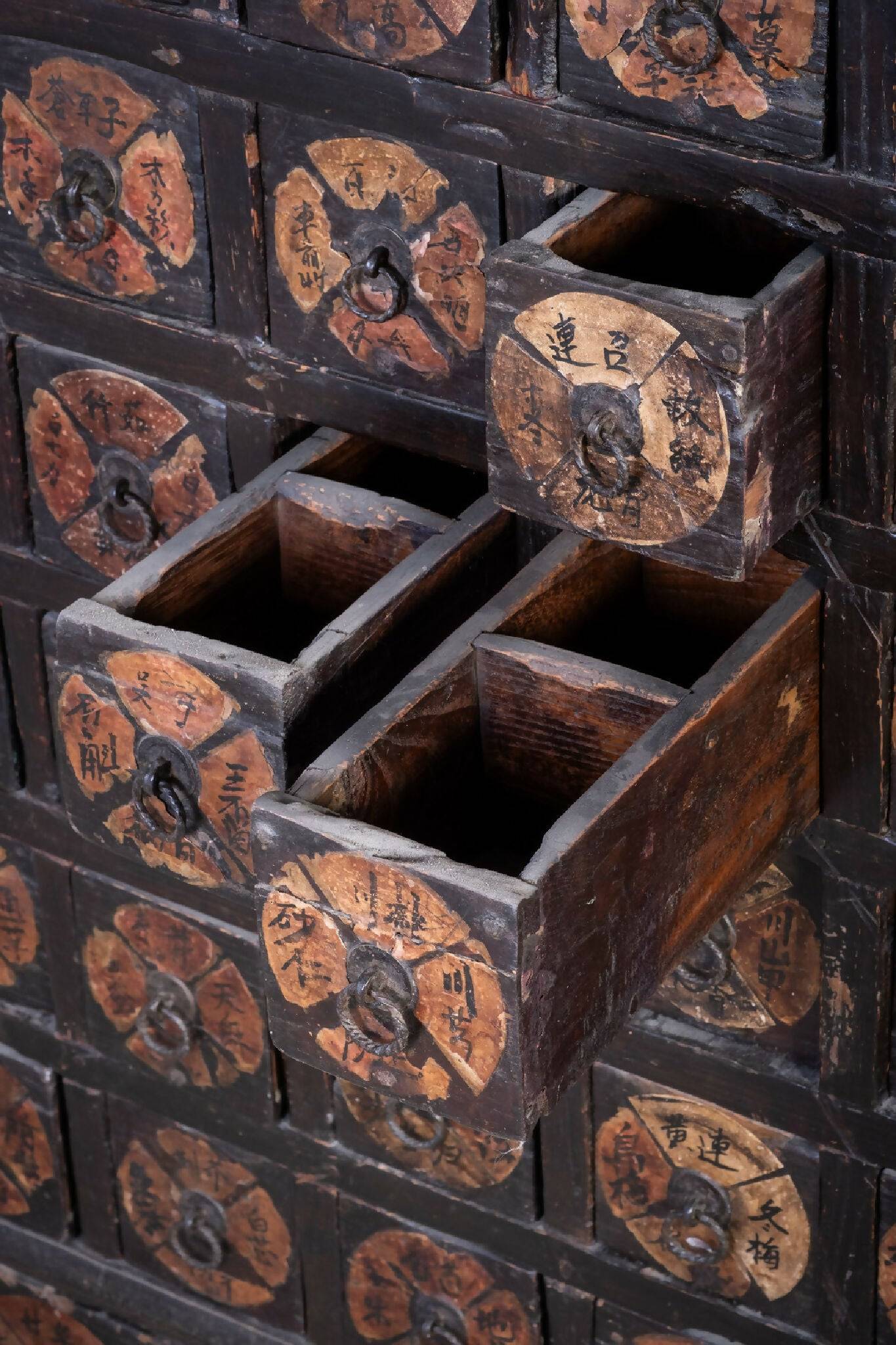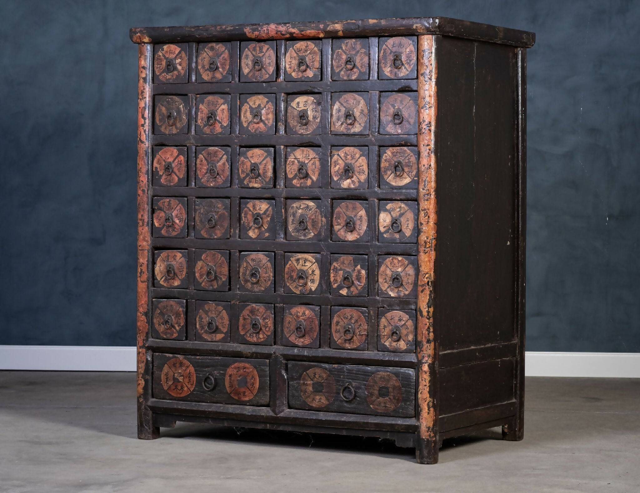 Smukt og dekorativt kinesisk medicinskab fra 1930’erne, udført i træ med et stort antal små skuffer og traditionelle detaljer. Skabet bærer præg af klassisk kinesisk håndværk, hvor funktionalitet og ornamentik går op i en højere enhed. Den originale stempling er bevaret, og overfladen har en smuk patina, der vidner om alder og autenticitet.