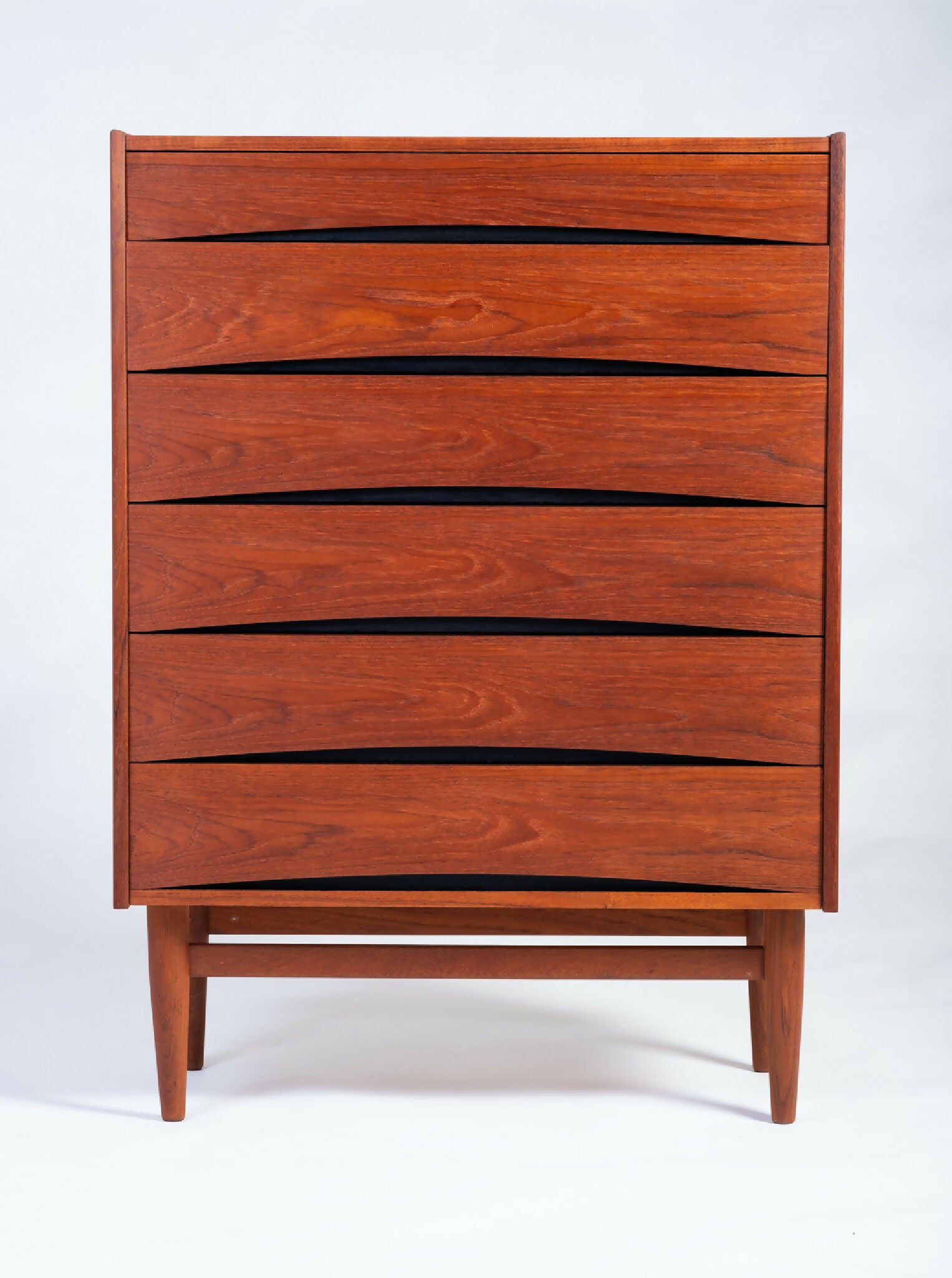 Elegant kommode i teak fra 1960’erne udført i klassisk dansk designtradition og inspireret af Arne Vodders formsprog. Møblet rummer seks rummelige skuffer og forener funktionalitet med et tidløst og afbalanceret udtryk. De rene linjer og det varme teaktræ gør kommoden ideel til stue, soveværelse eller entré.