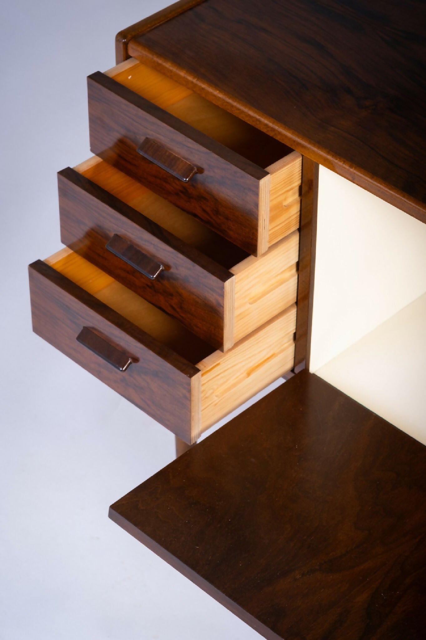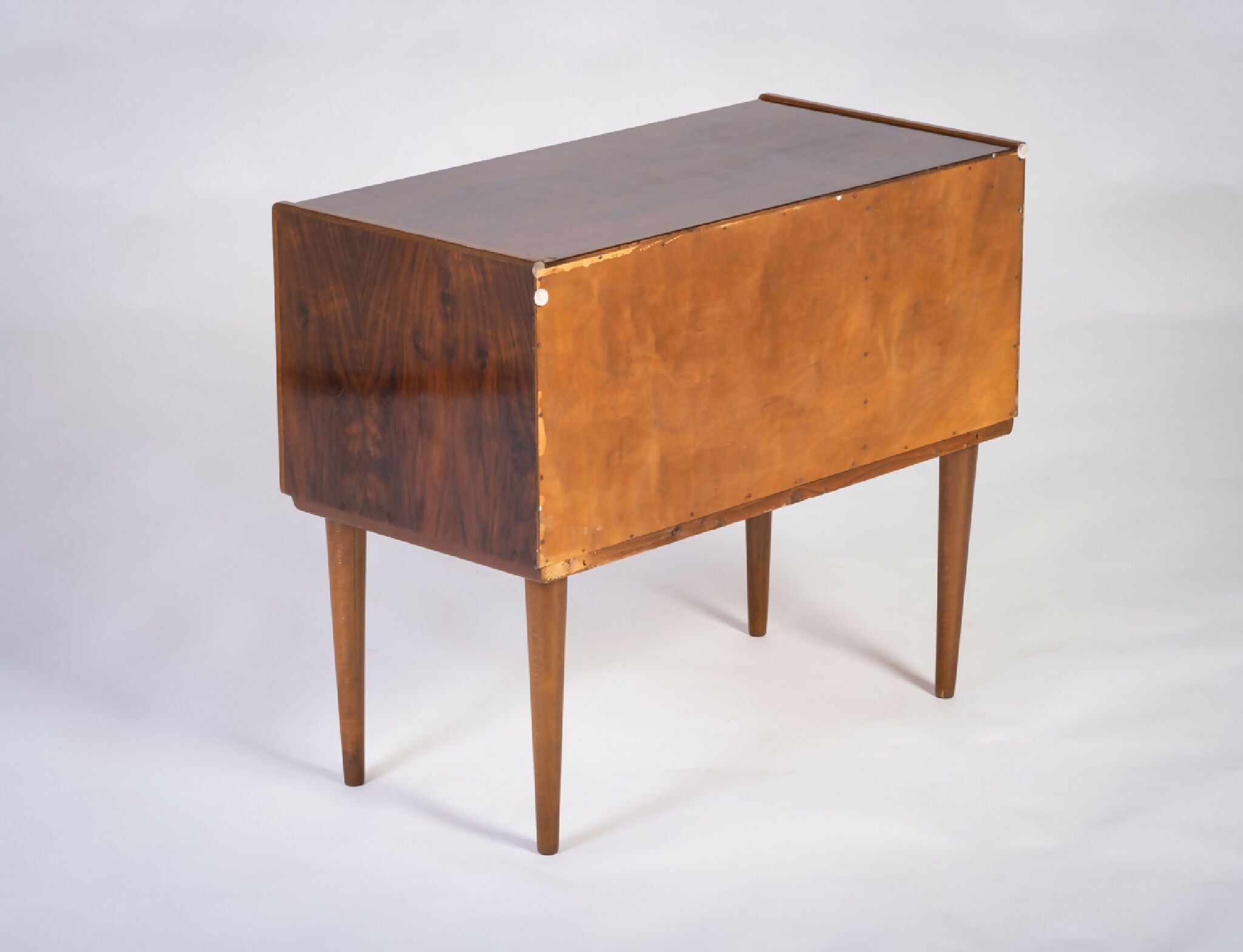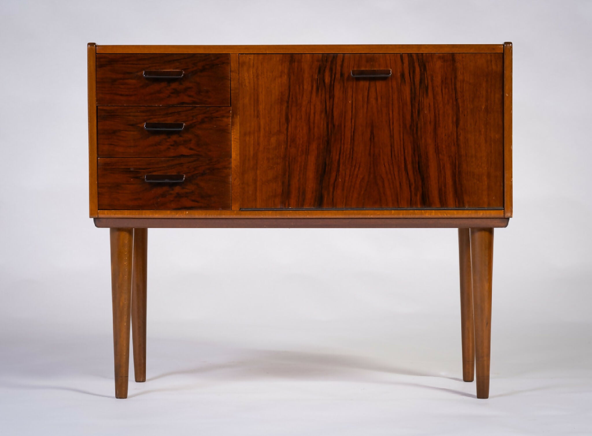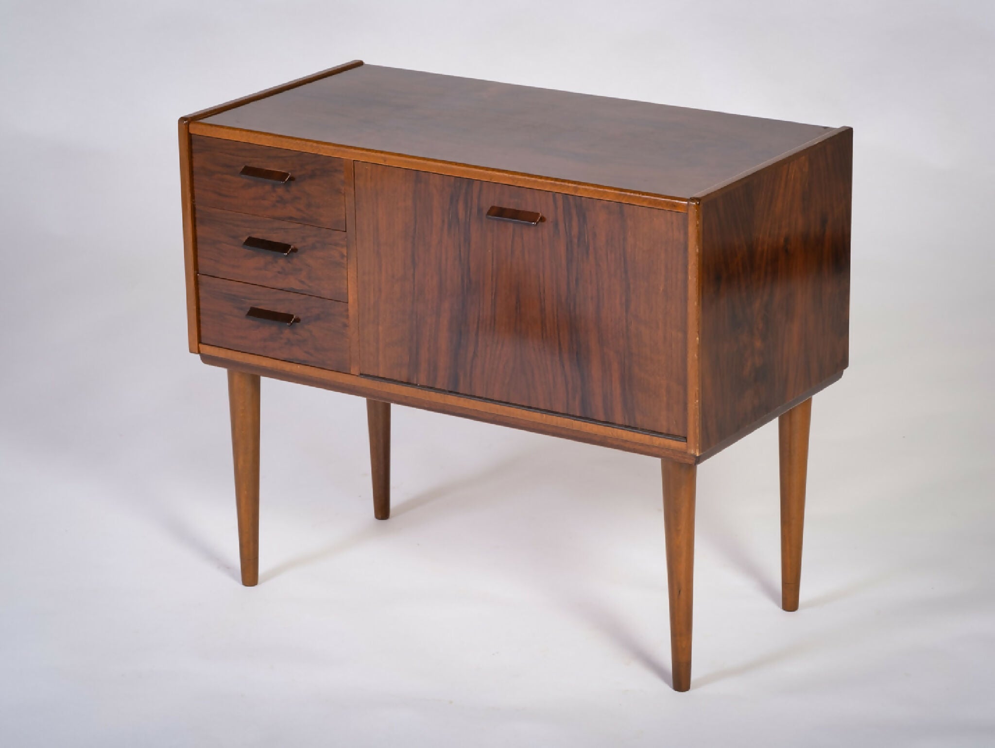 Klassisk kommode udført i valnød, fremstillet i Danmark i 1960’erne. Møblet har tre rummelige skuffer og et enkelt, elegant formsprog, hvor træets naturlige åretegninger giver varme og karakter. Designet afspejler den danske tilgang til funktionalitet og æstetik med fokus på proportioner og håndværk.