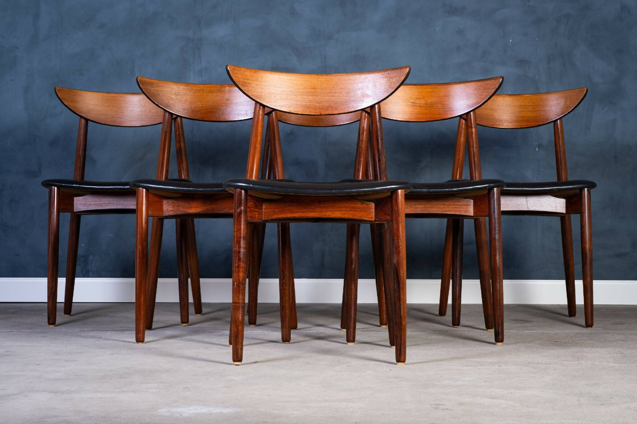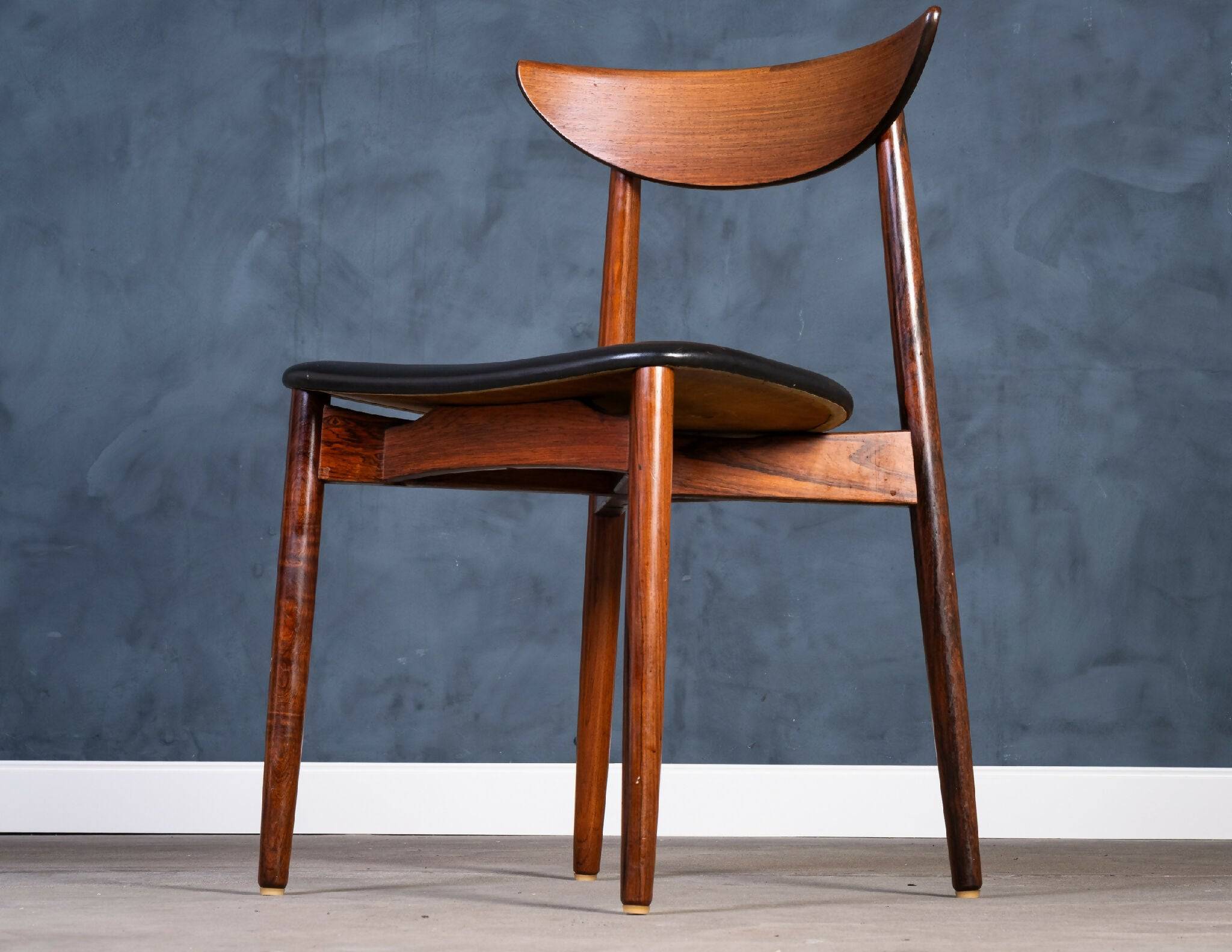 Model spisestuestole designet af Kurt Østervig for K.P. Møbler i 1960’erne. Stolene er udført i massiv palisander med smukt afstemte årer og sæder betrukket med sort polstring. Et elegant eksempel på dansk møbelkunst, hvor form, funktion og håndværk forenes i et harmonisk udtryk.