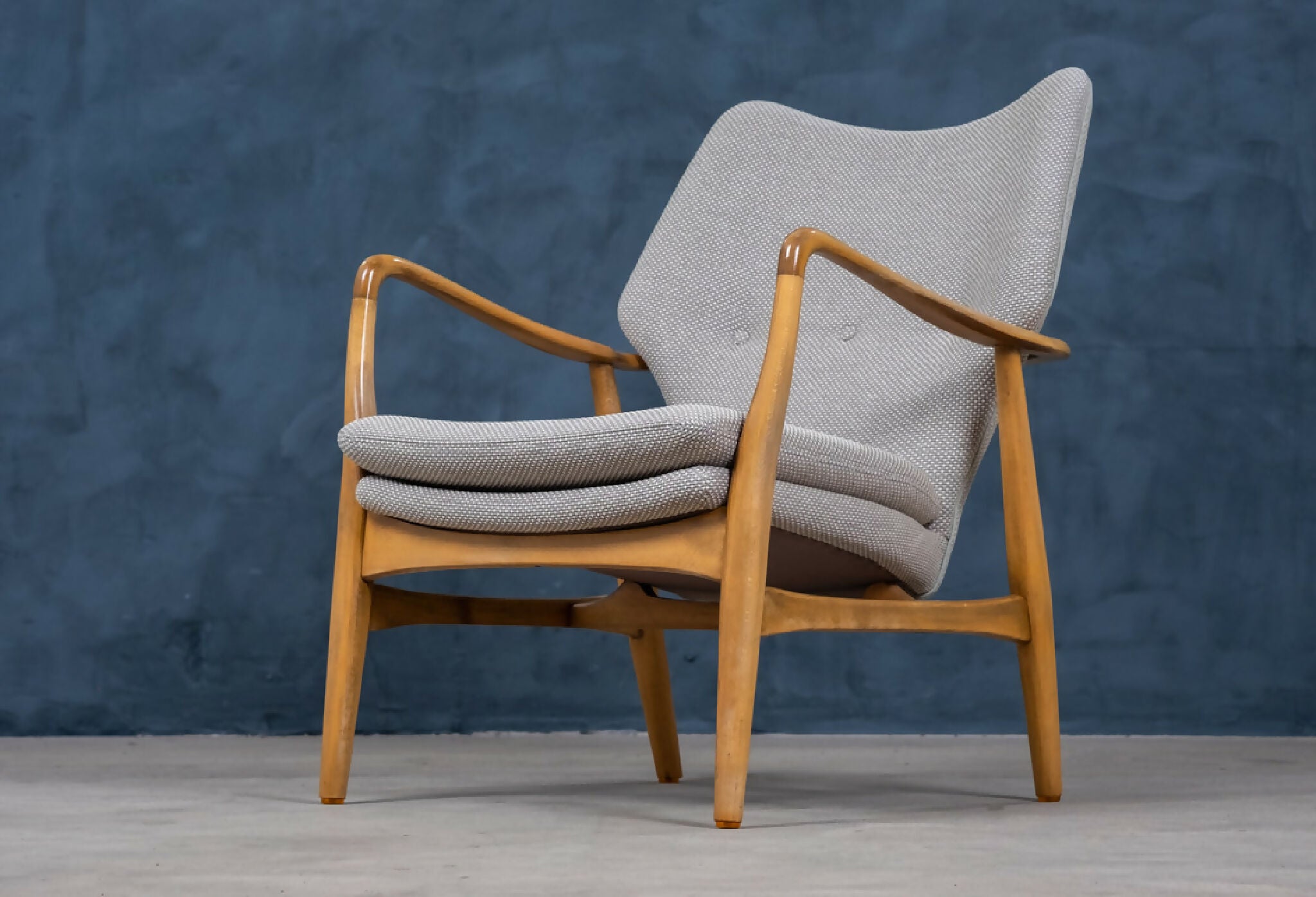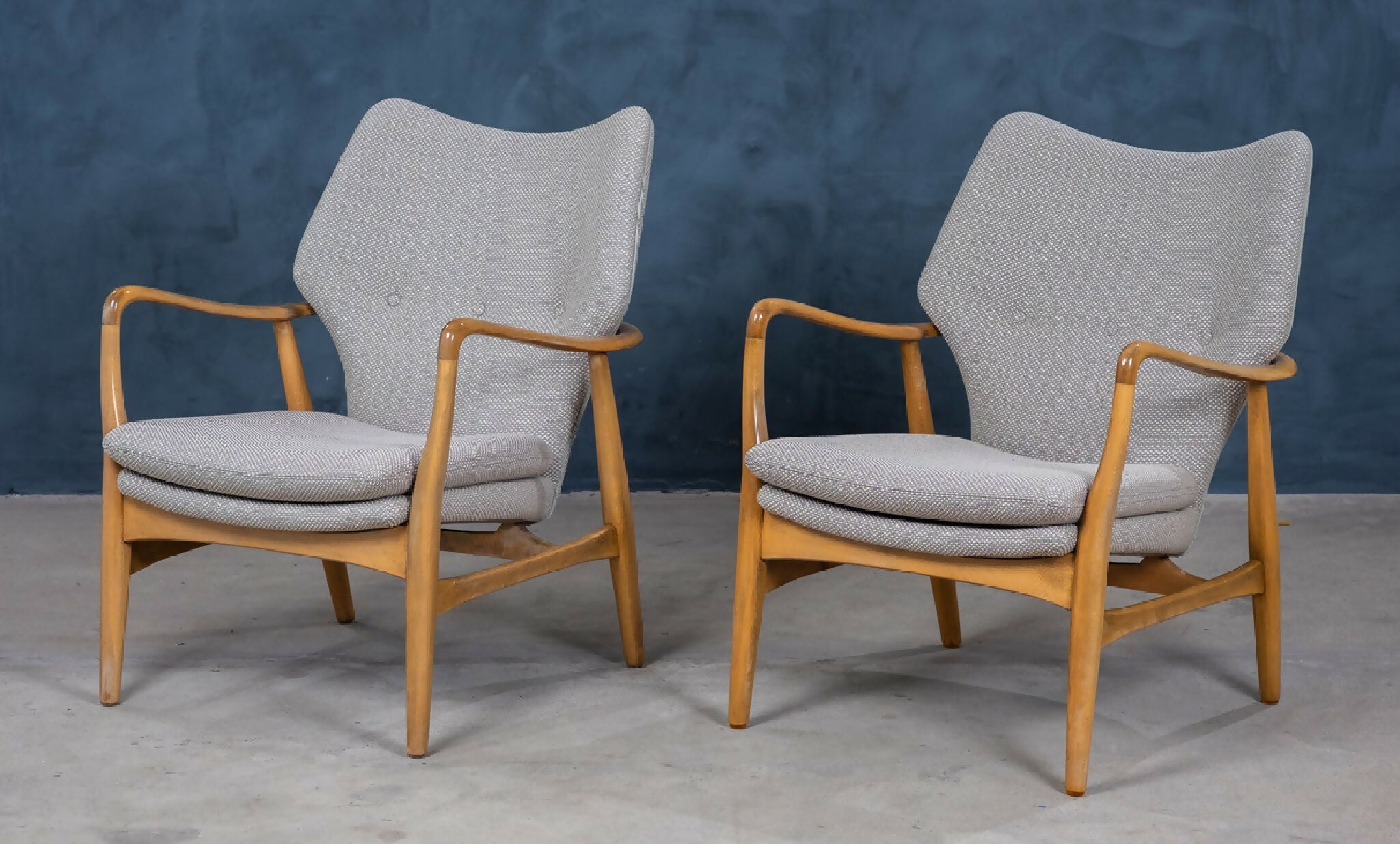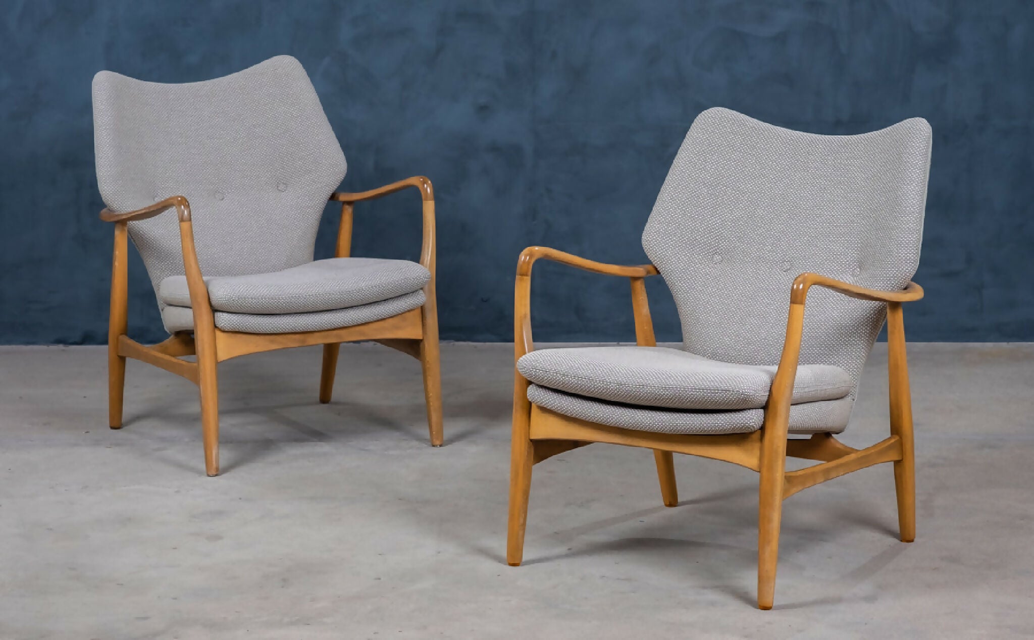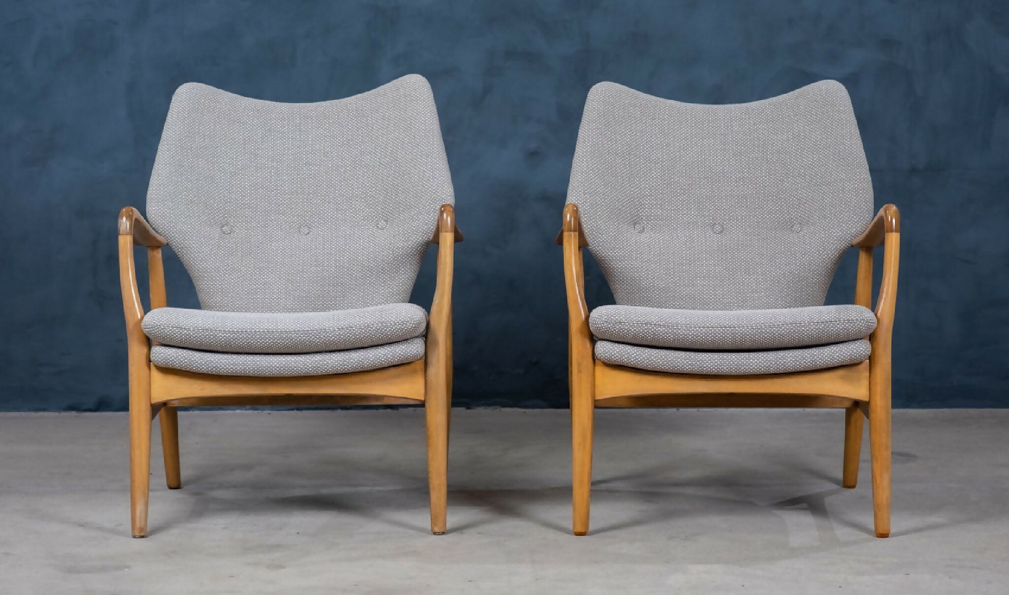 Sæt af to elegante lænestole designet af Madsen & Schubell i 1950’erne, dansk design. Stolene er udført i bejdset bøg og har det karakteristiske, svævende udtryk med både ryg og sæde løftet let fra rammen. De organiske armrests og de let tilspidsede ben skaber en harmonisk og skulpturel helhed, typisk for duoens designstil.