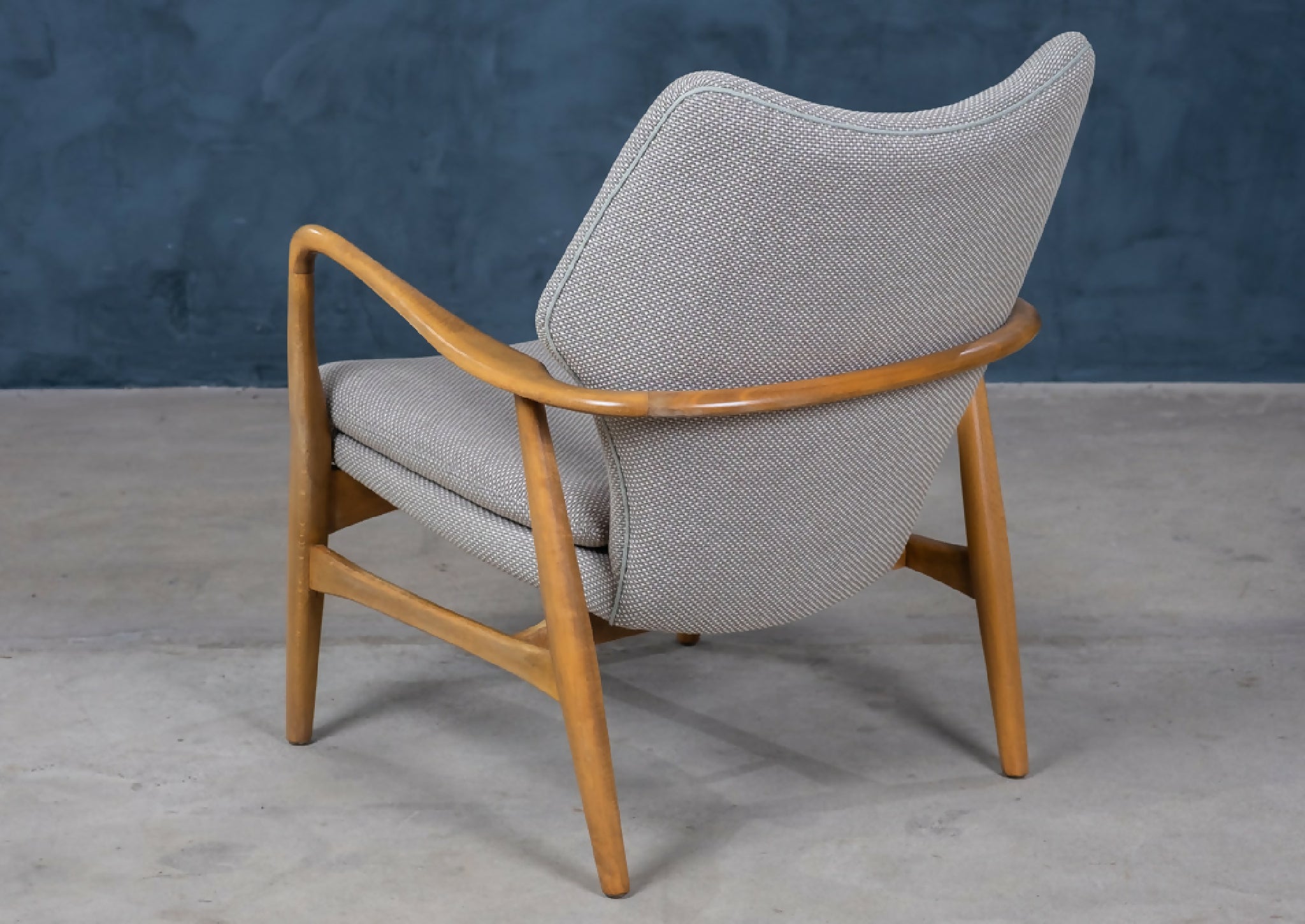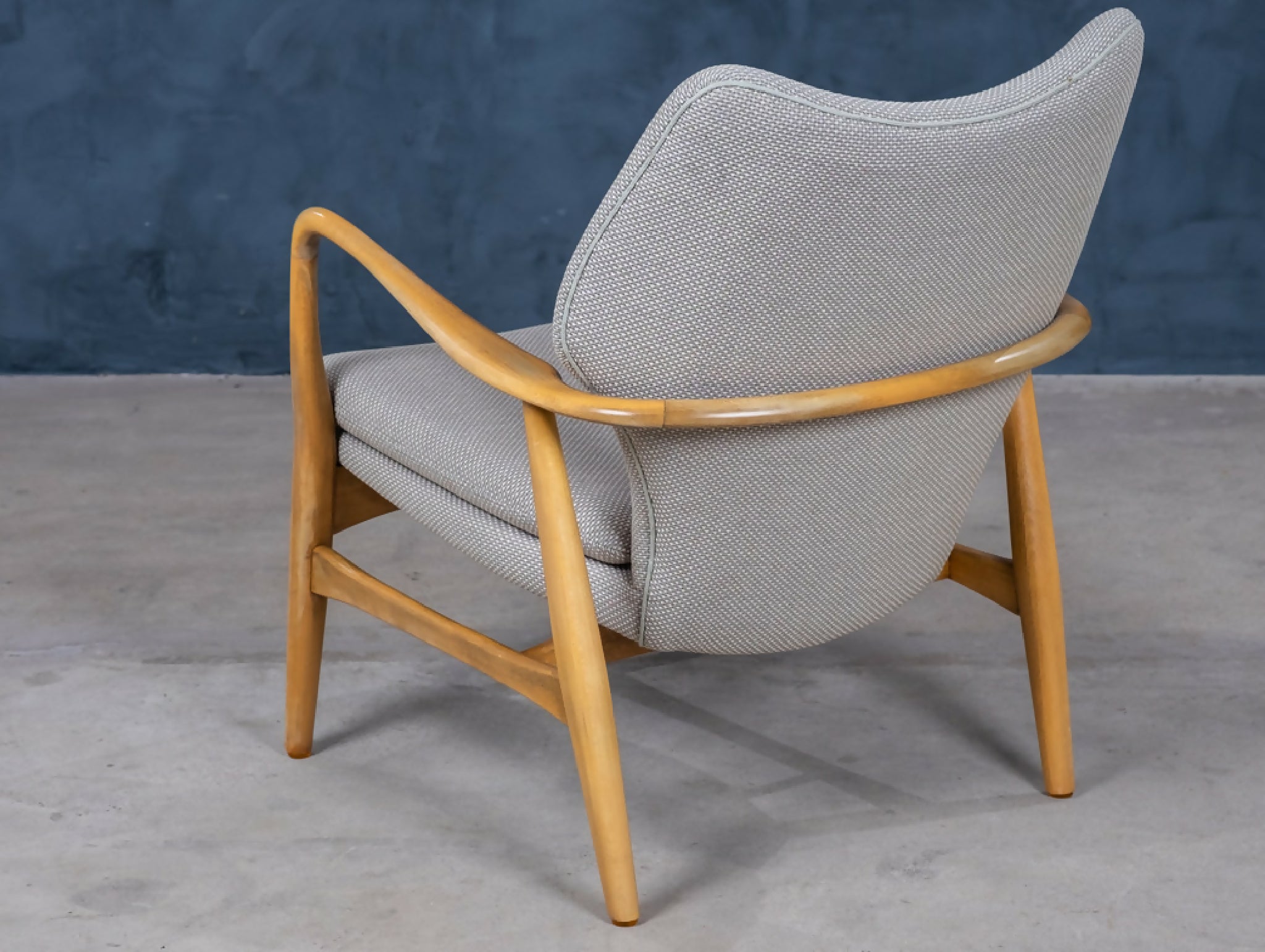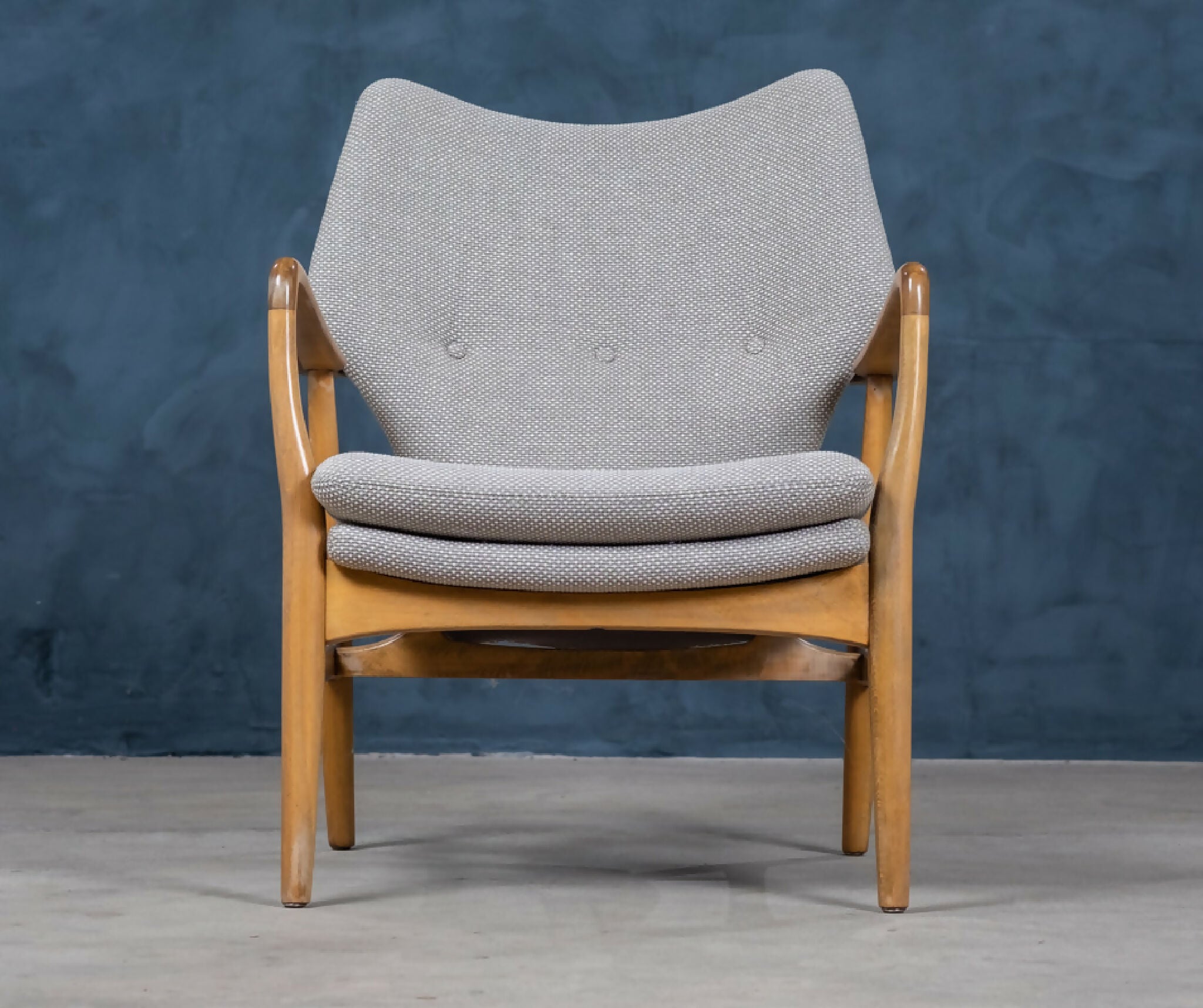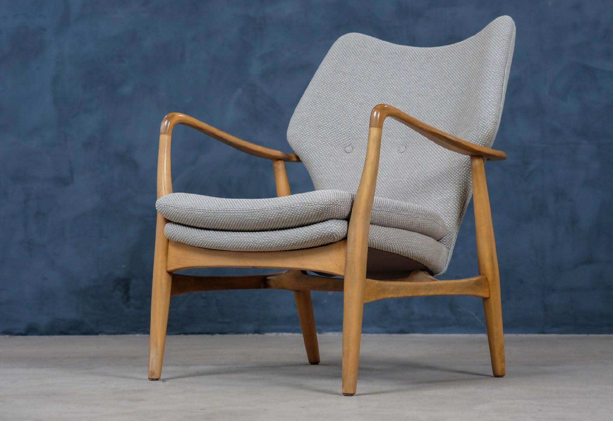 Sæt af to elegante lænestole designet af Madsen & Schubell i 1950’erne, dansk design. Stolene er udført i bejdset bøg og har det karakteristiske, svævende udtryk med både ryg og sæde løftet let fra rammen. De organiske armrests og de let tilspidsede ben skaber en harmonisk og skulpturel helhed, typisk for duoens designstil.