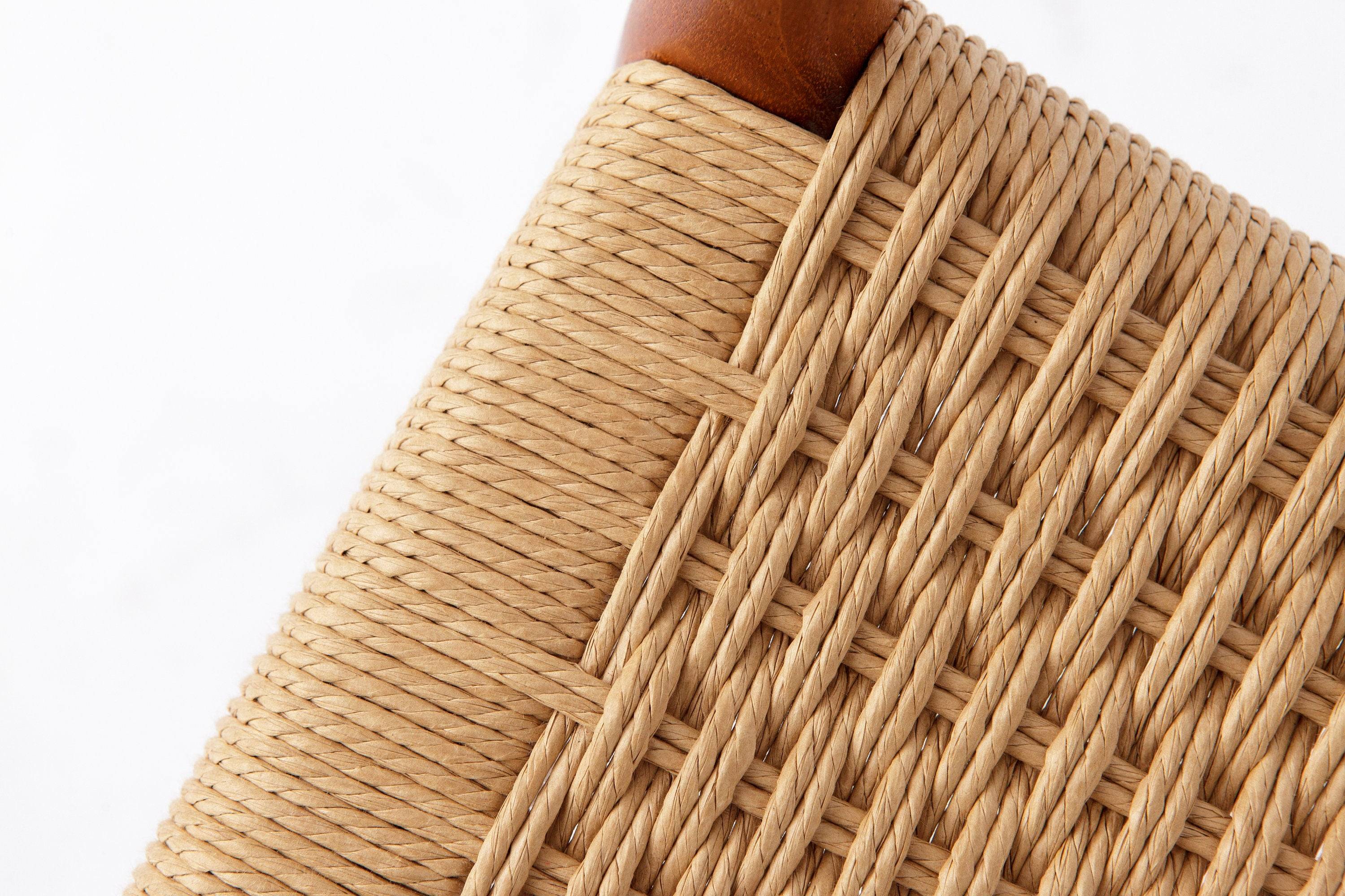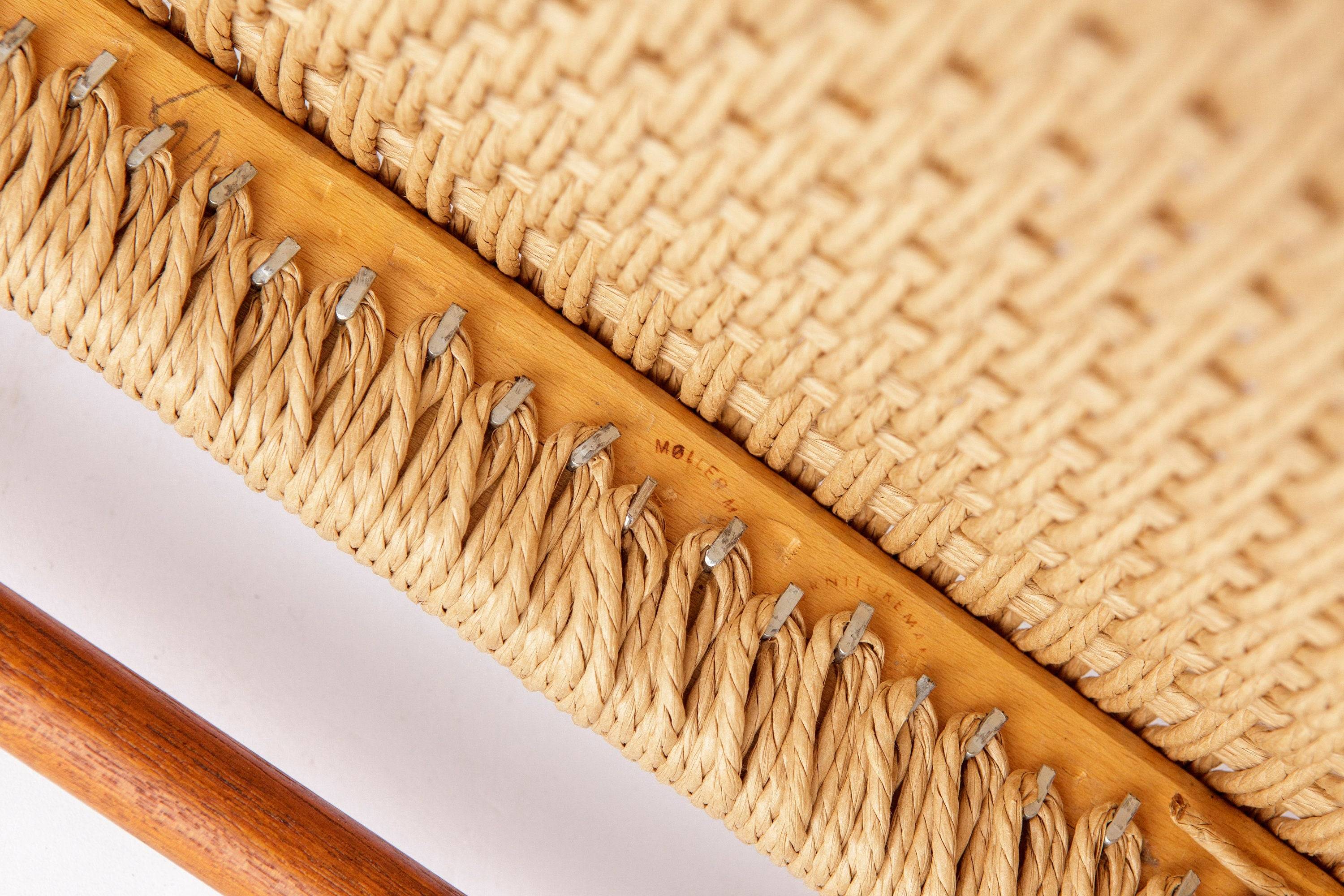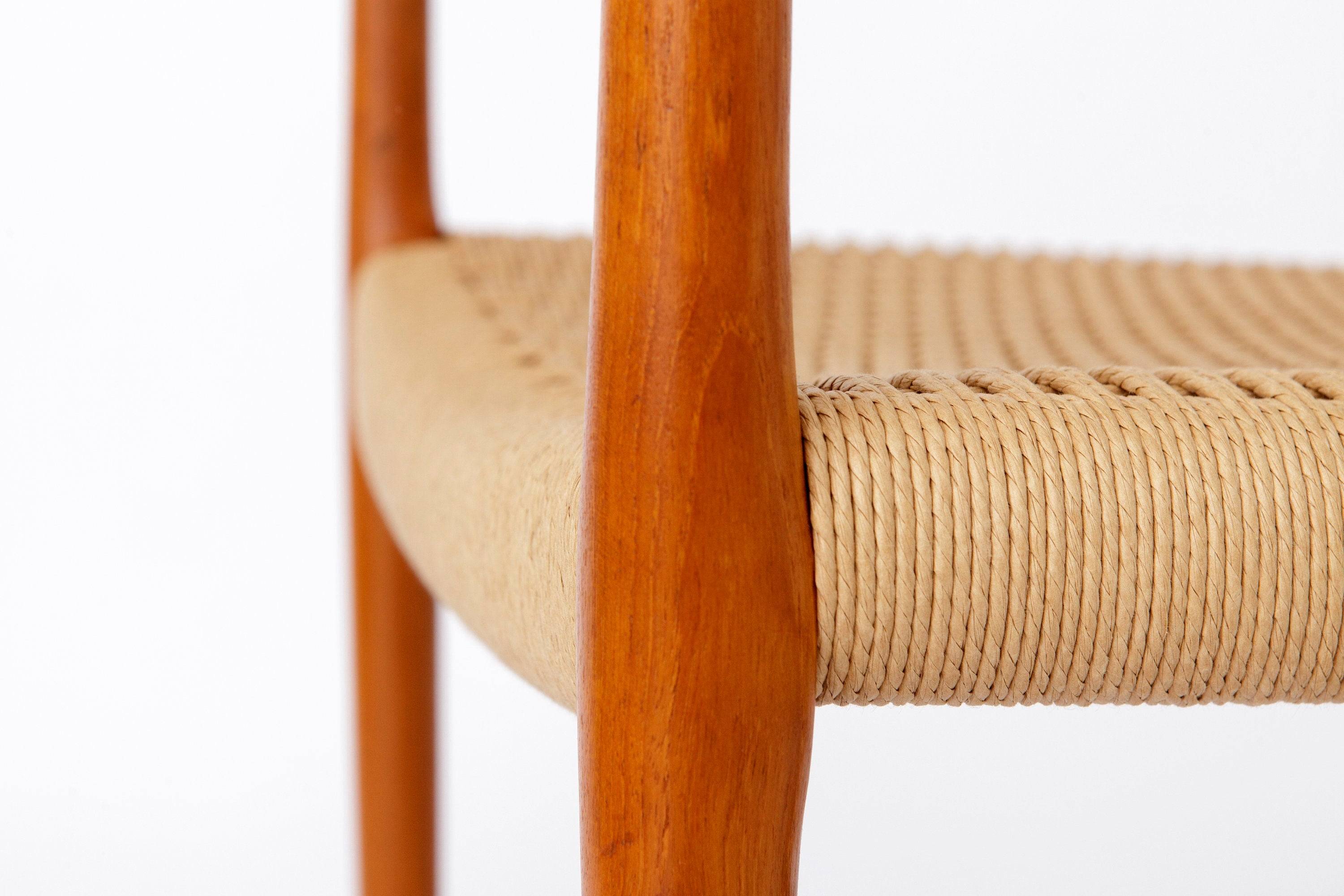 Model 56 armstol designet af Niels O. Møller i 1954 og udført i massiv teak. Rammen er nænsomt restaureret og oliebehandlet, så træets varme glød fremhæves. Sædet er nyflettet i dansk papirgarn, hvilket giver et autentisk udtryk og høj komfort. Hver stol har producentmærke under sædet.