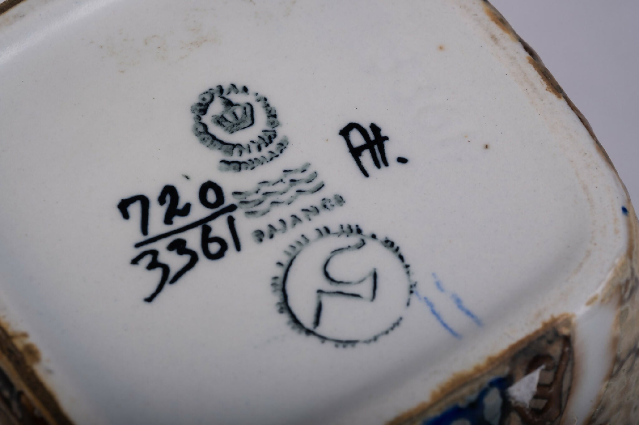 Model Baca 720/3361 vase designet af Niels Thorsson i 1969 og produceret af Aluminia/Royal Copenhagen frem til 1974. Vasen er udført i fajance med sandfarvet glasur kombineret med hvide og blå nuancer, som kendetegner Thorssons dekorative og grafiske udtryk i Baca-serien.