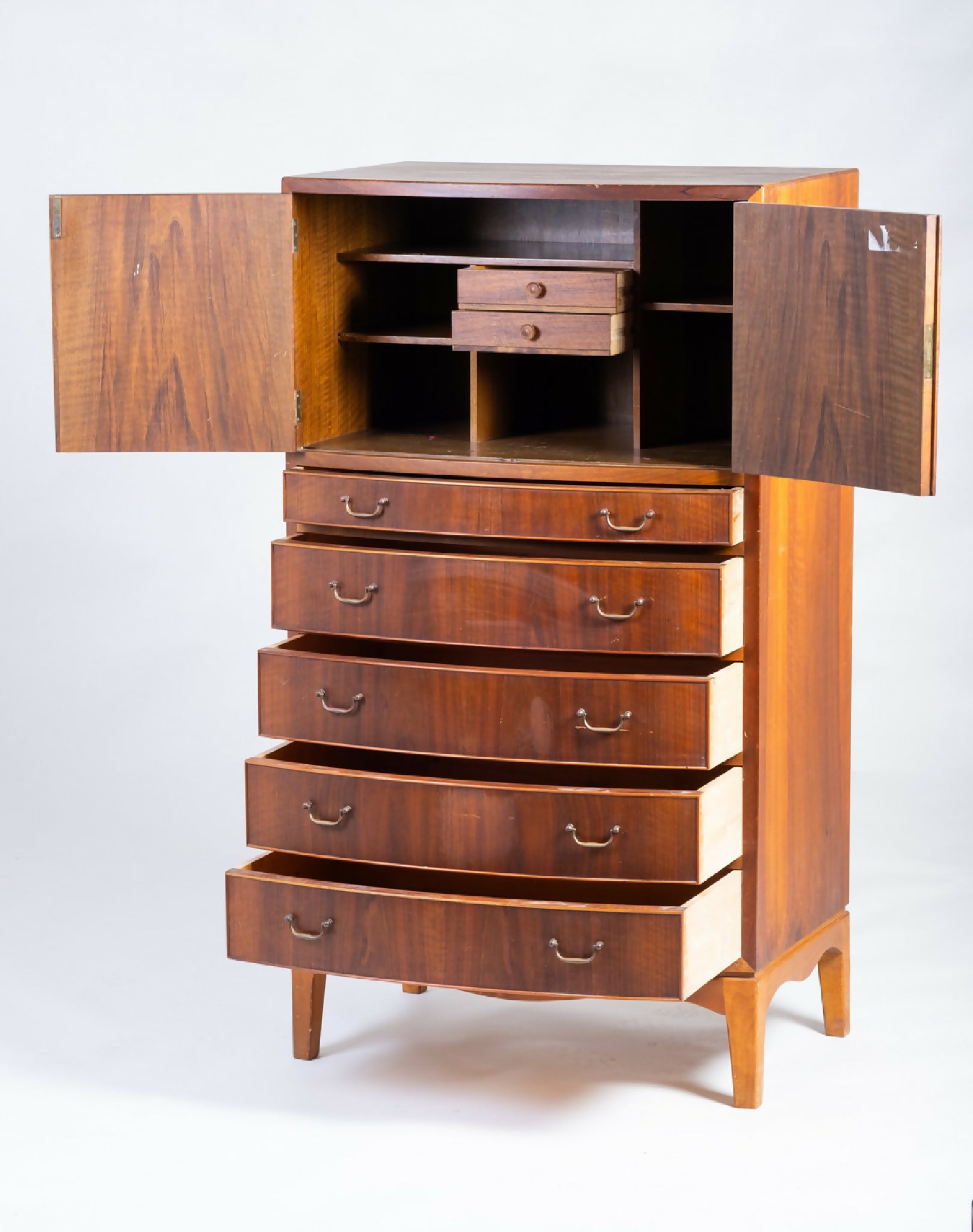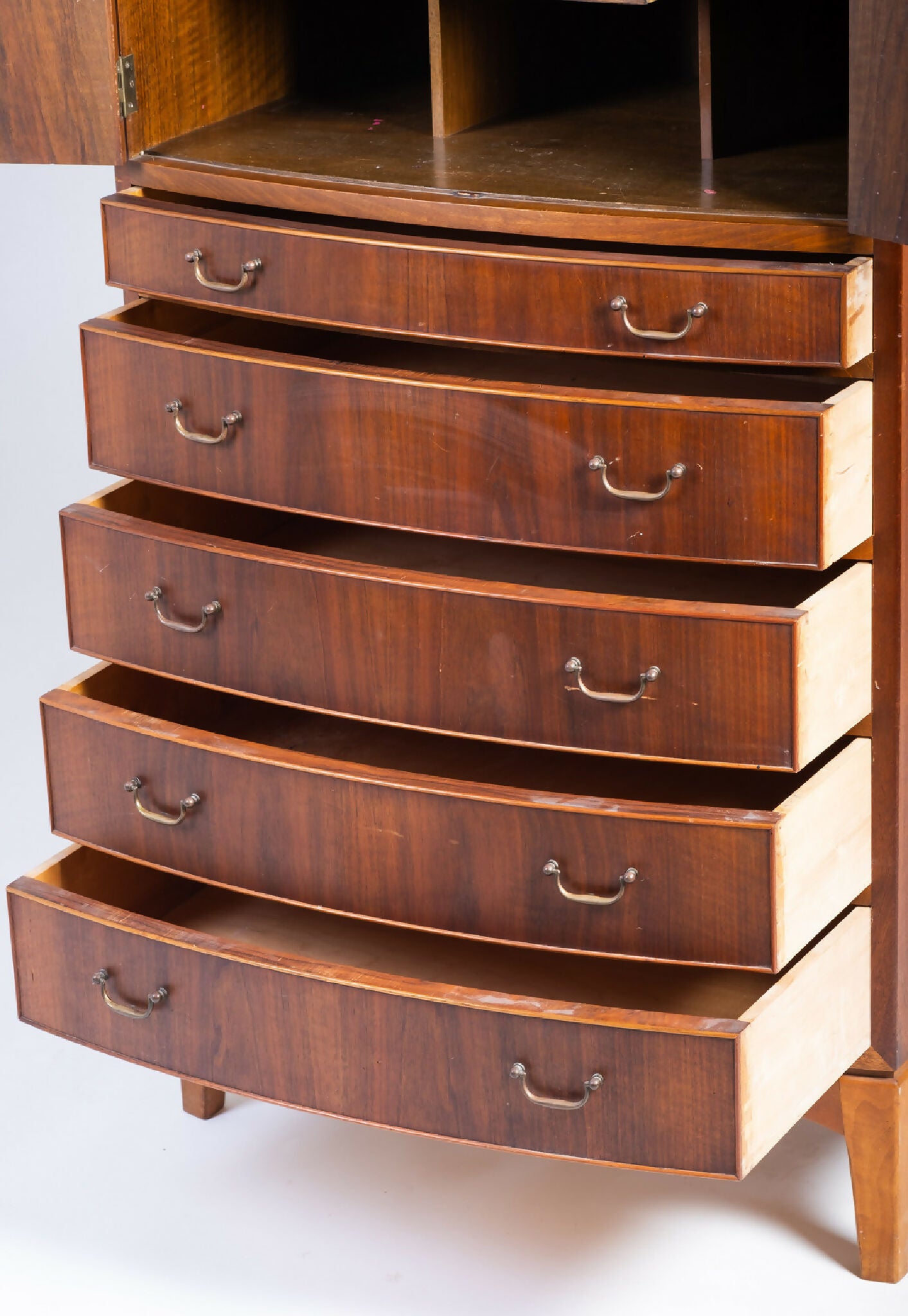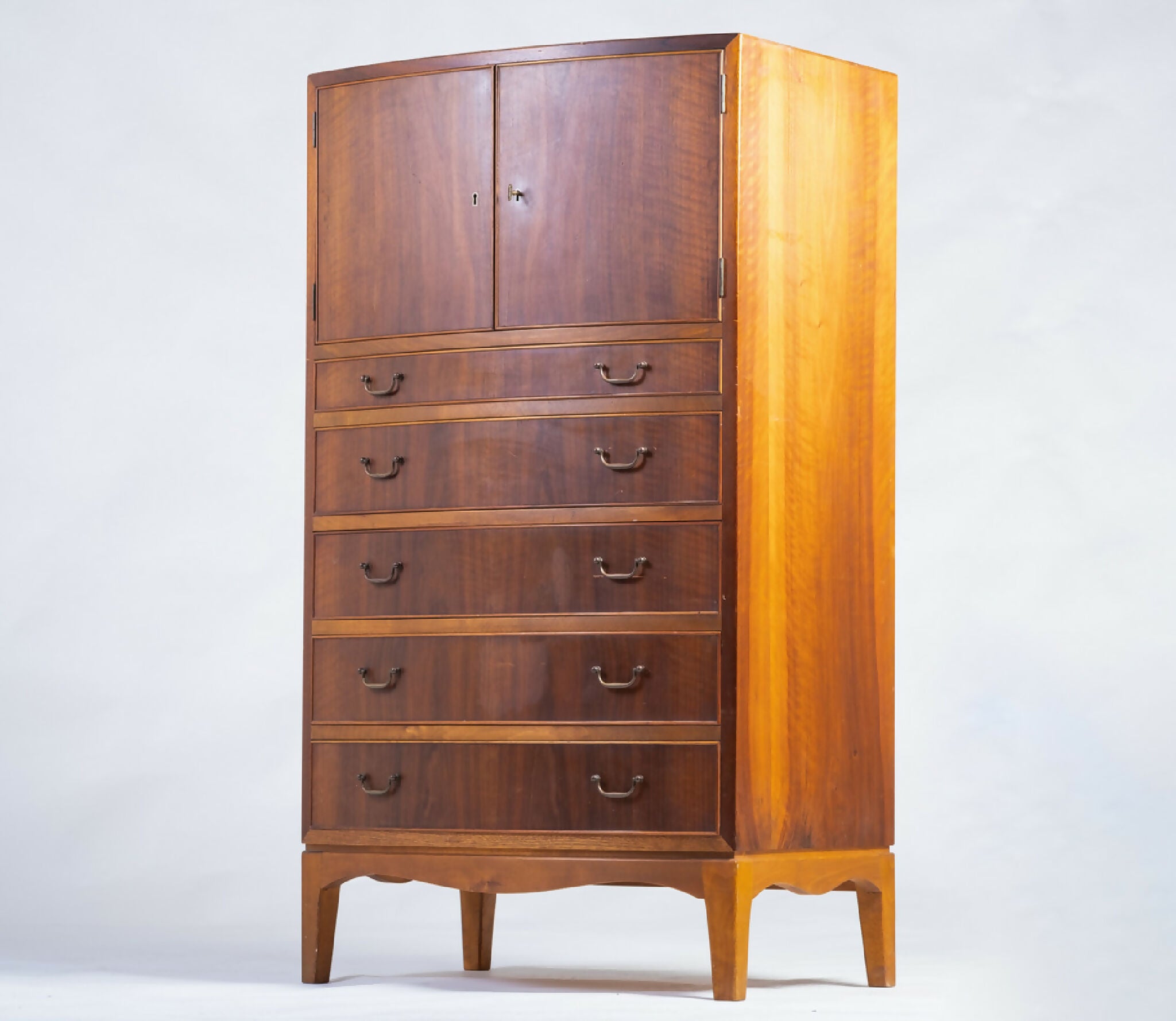 Indersiderne er udført i bøgetræ, og de originale messinggreb understreger den klassiske materialekombination. Kommoden fremstår i meget fin stand med let patina, der understreger kvaliteten i håndværket og den varme glød i træet.