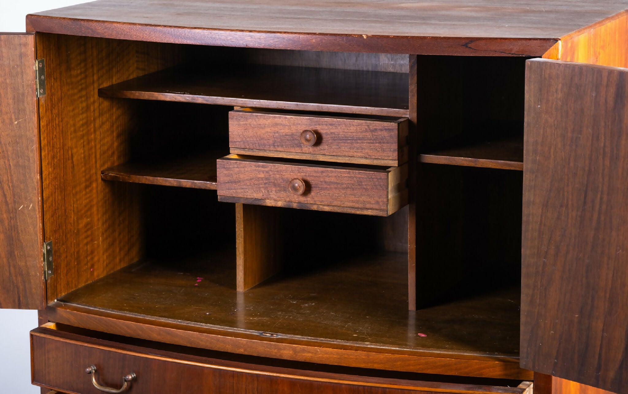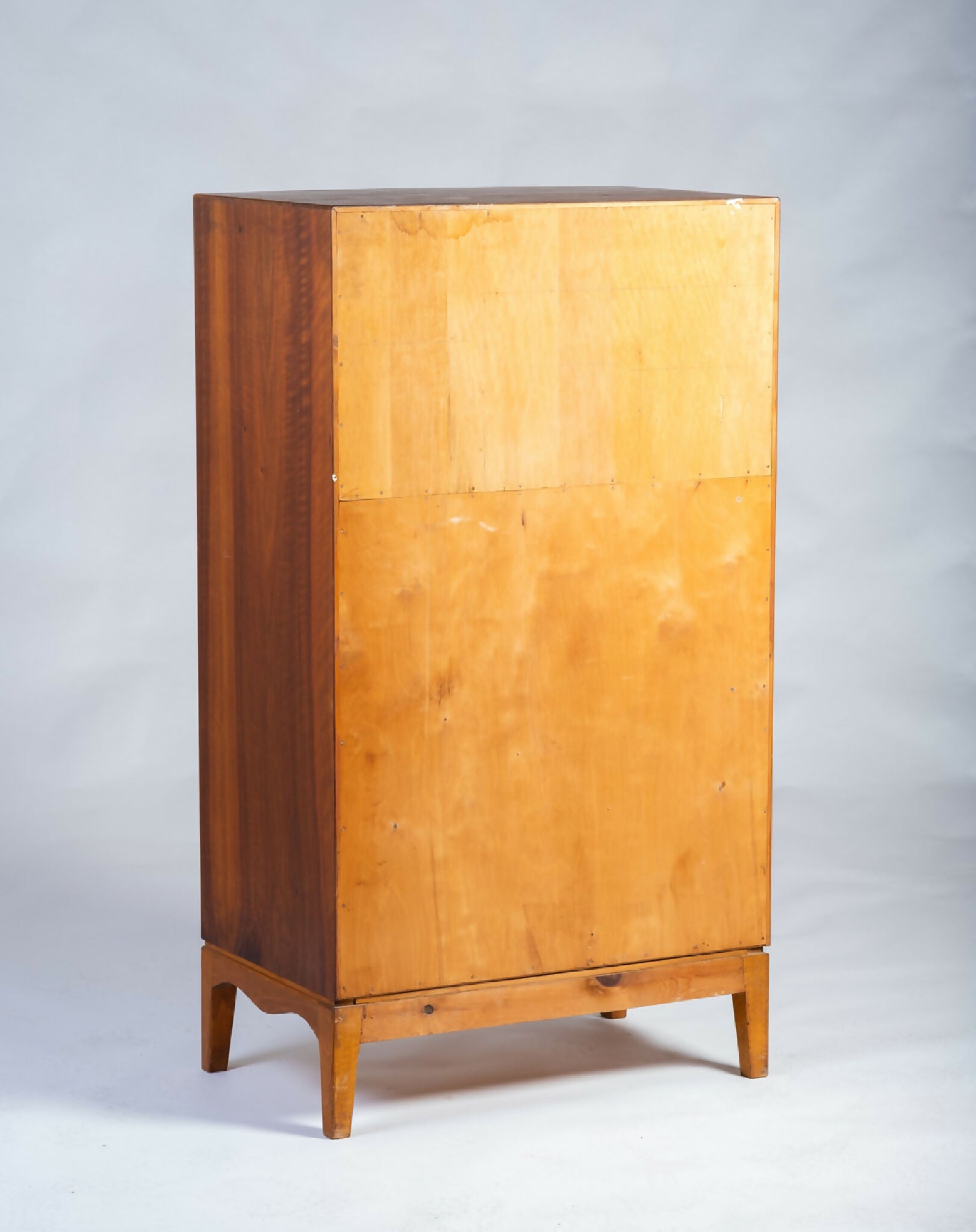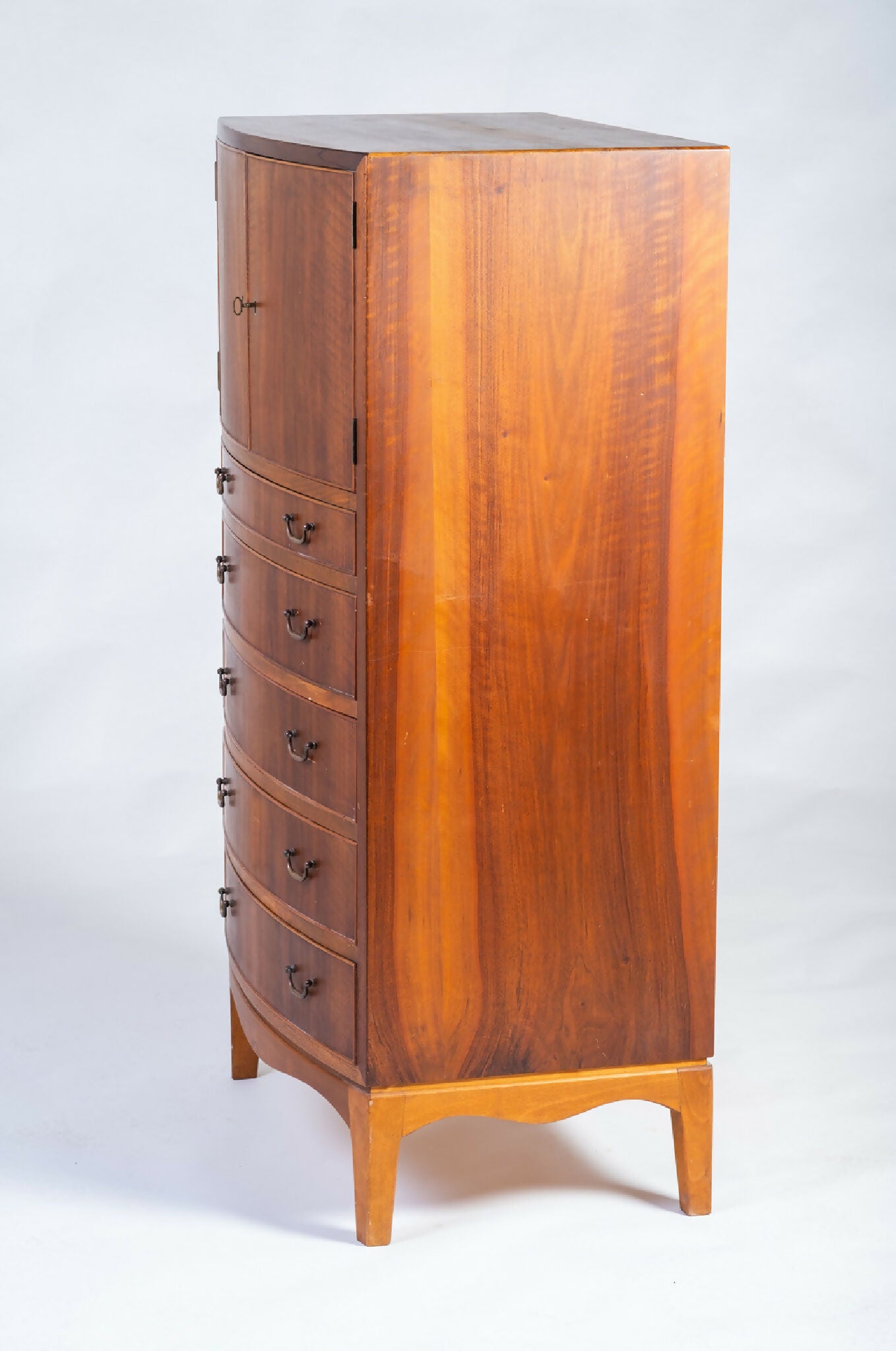 Indersiderne er udført i bøgetræ, og de originale messinggreb understreger den klassiske materialekombination. Kommoden fremstår i meget fin stand med let patina, der understreger kvaliteten i håndværket og den varme glød i træet.