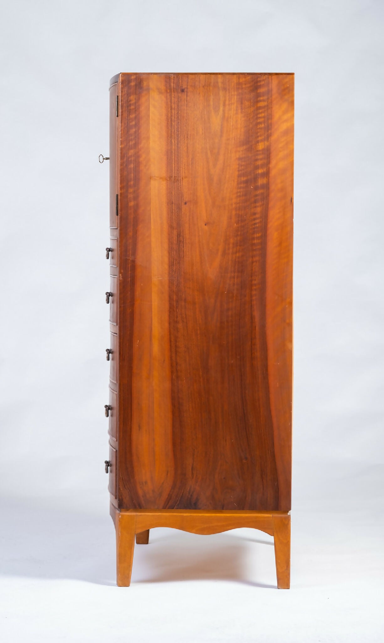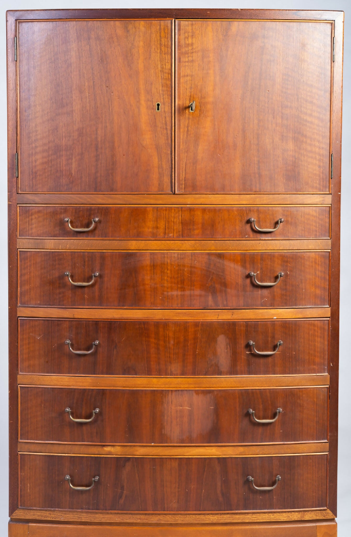 Model kommode designet af Ole Wanscher og fremstillet af møbelsnedker A.J. Iversen i 1950’erne. Et elegant og generøst møbel udført i fineret valnød med seks skuffer og to øverste låger. Skufferne er svagt buede og indrammet af afrundede kanter, der vidner om Wanschers sans for proportioner og detaljer.