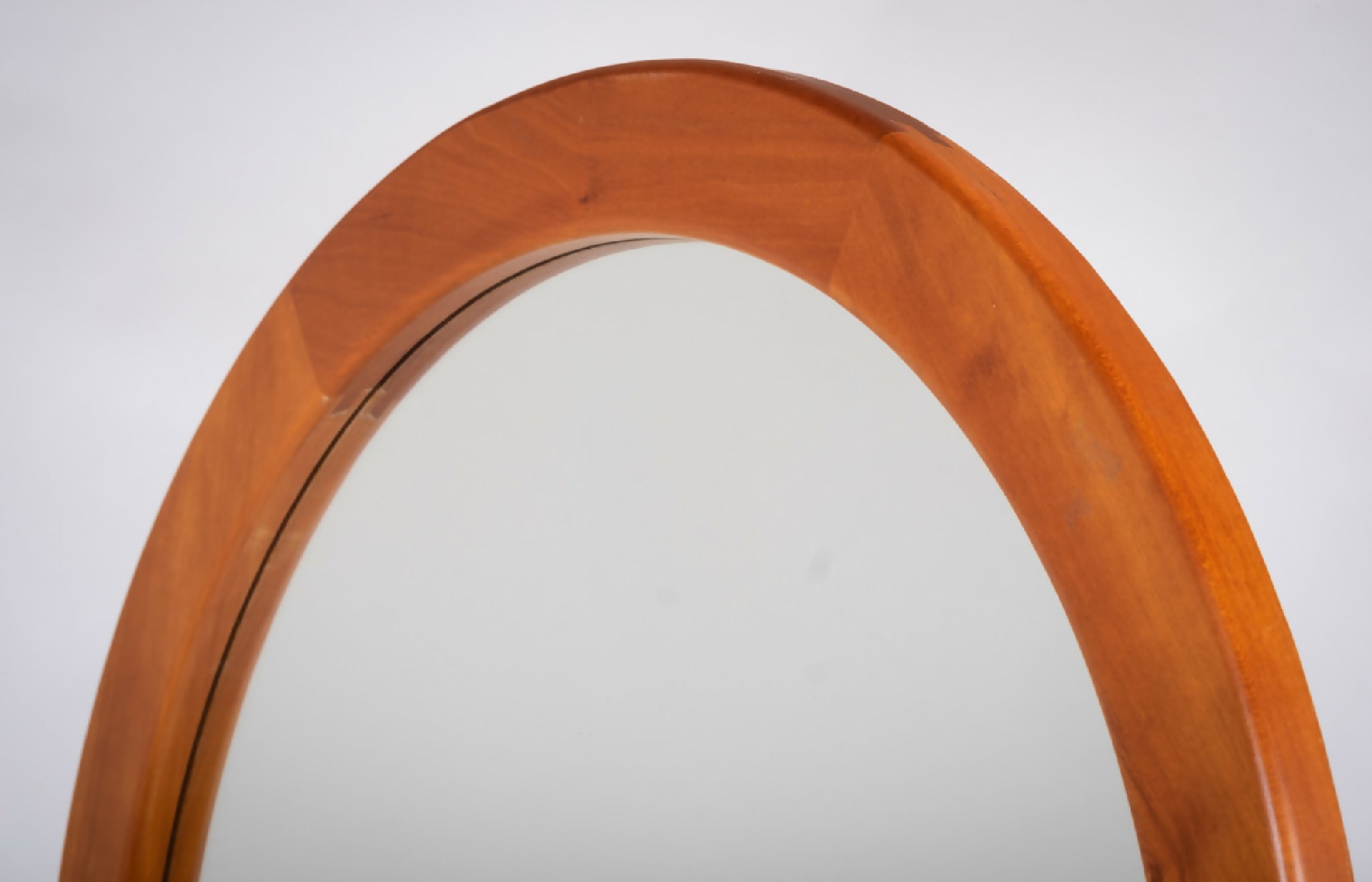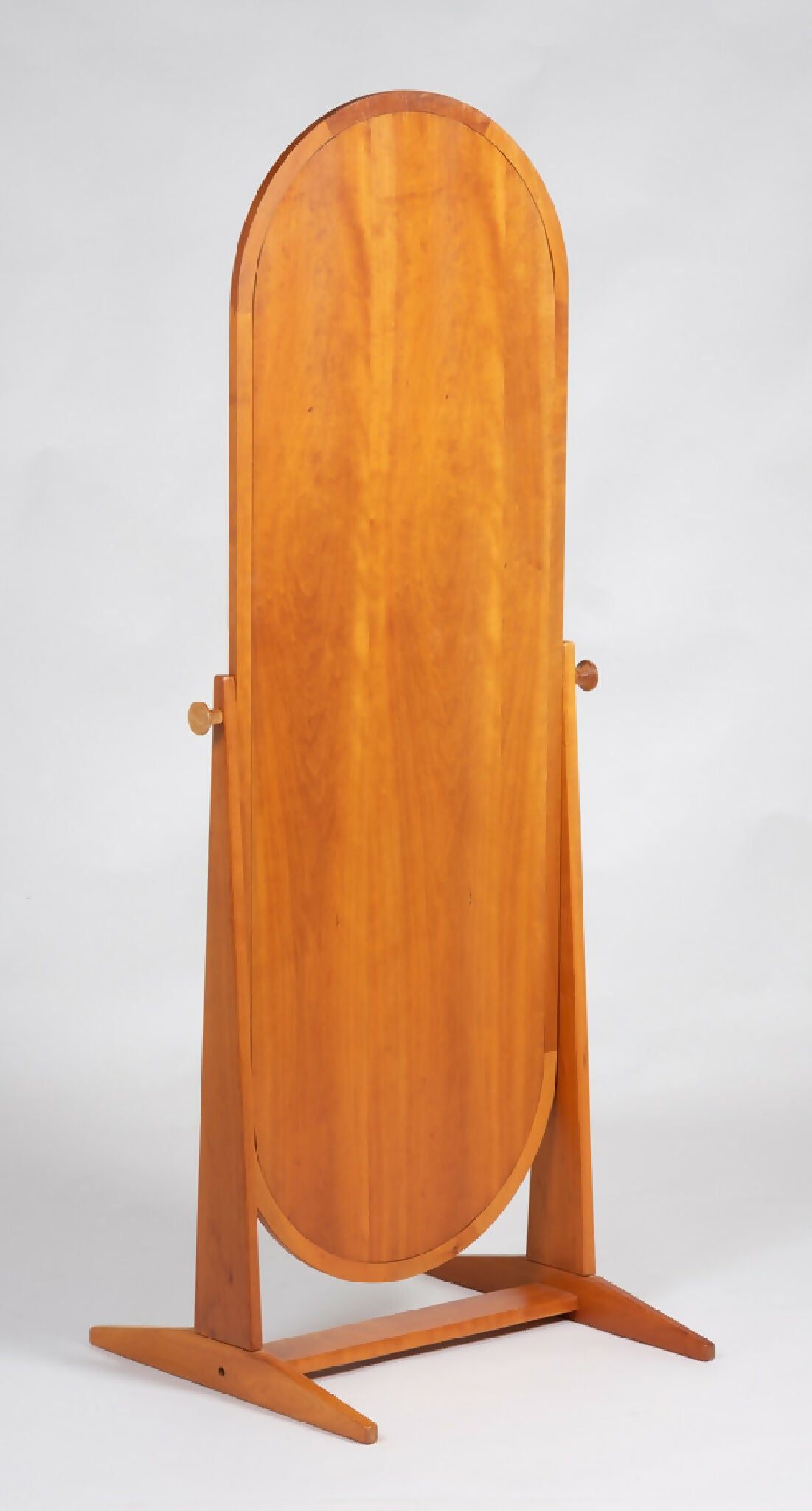 Gulvspejl i bøg designet og produceret af Pedersen & Hansen i 1970’erne. Spejlet står i en justerbar ramme, hvor drejede teakknopper fastholder spejlet i den ønskede hældning. Konstruktionen er enkel og funktionel med et varmt, nordisk udtryk, der passer ind i både moderne og klassiske interiører.