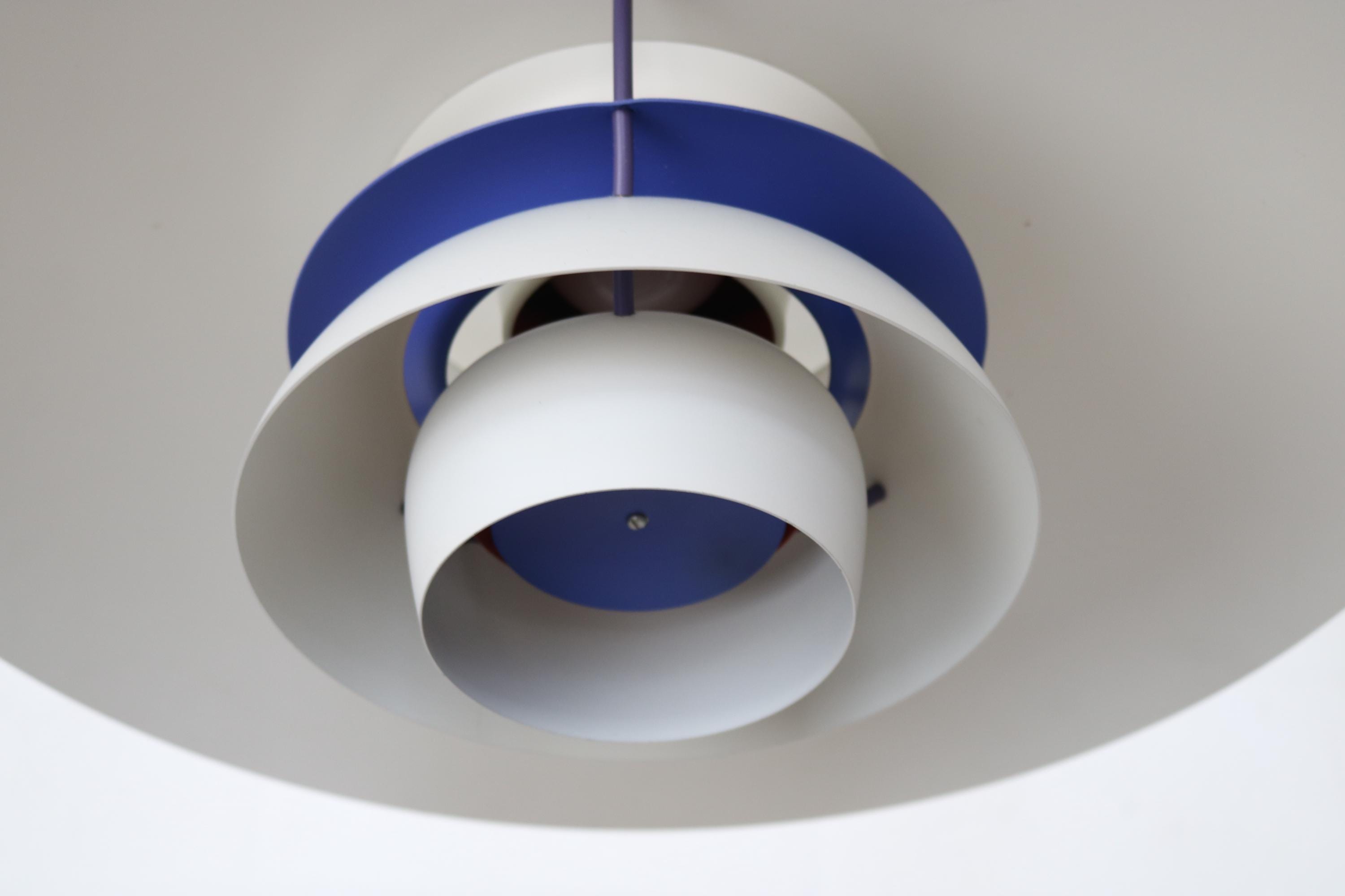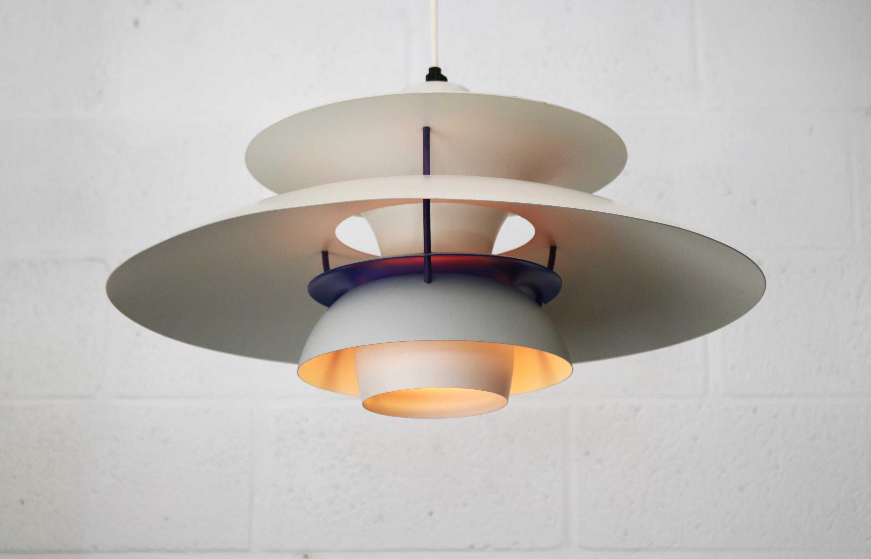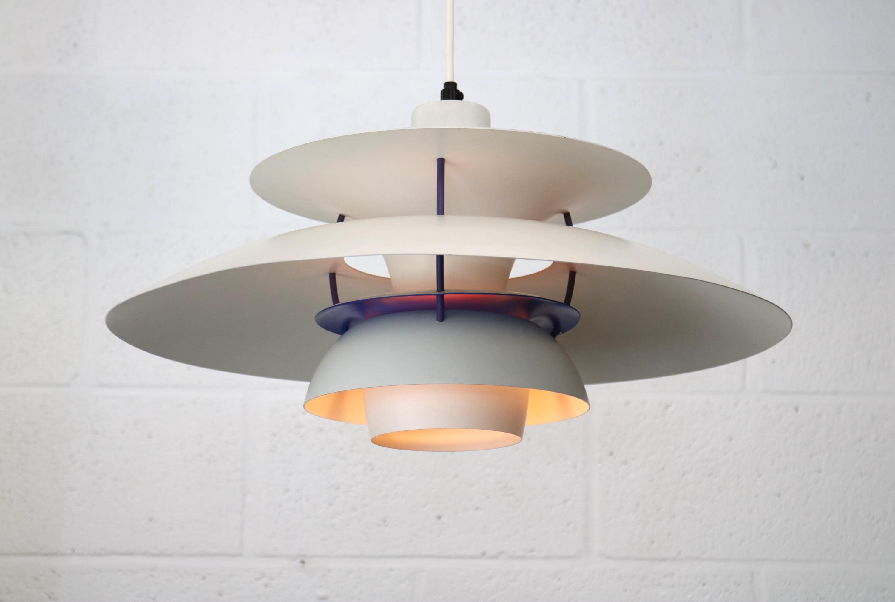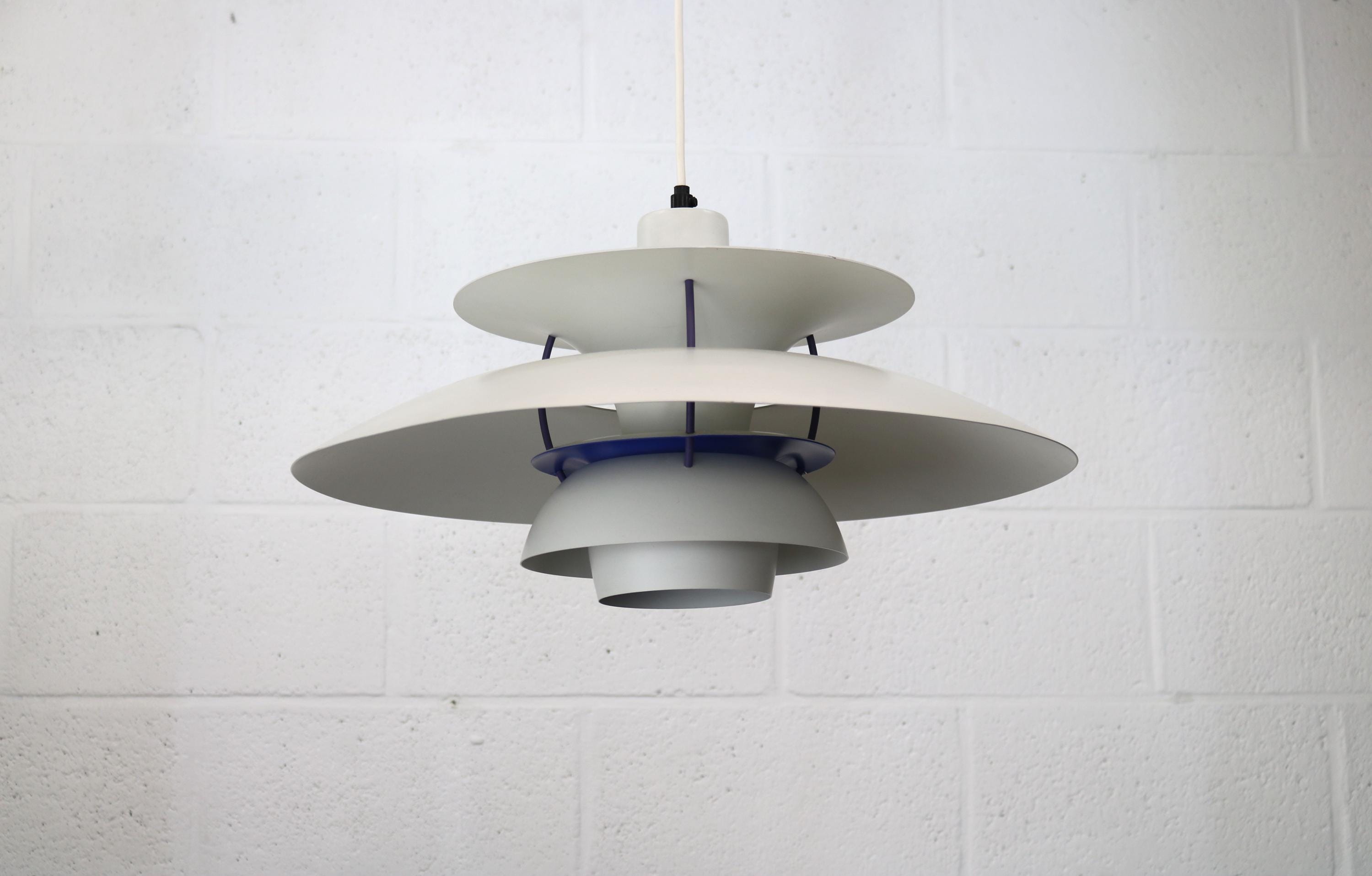 Model PH5 pendel designet af Poul Henningsen for Louis Poulsen i 1958. Denne originale udgave fra 1970’erne er udført i hvid og blå lakering, hvor skærmenes lagdelte konstruktion skaber et blændfrit og jævnt fordelt lys. Lampen er kendetegnet ved Henningsens arbejde med refleksion og lysstyring og regnes som et ikon inden for dansk belysningsdesign.