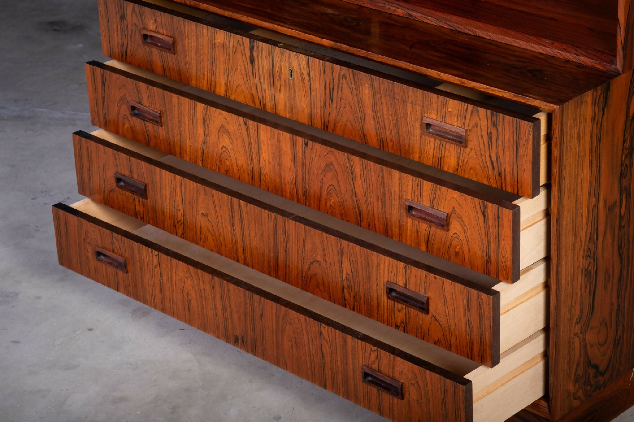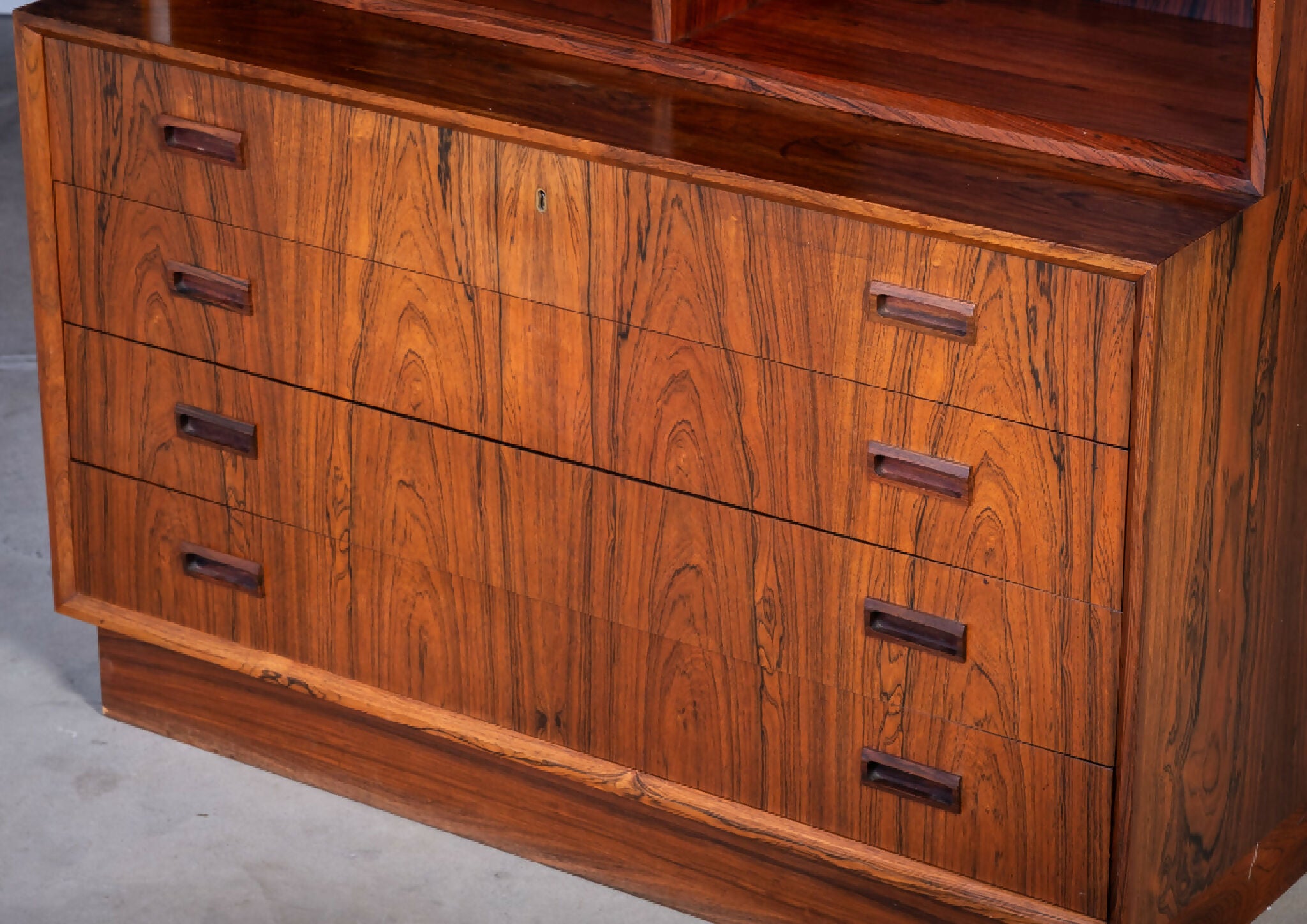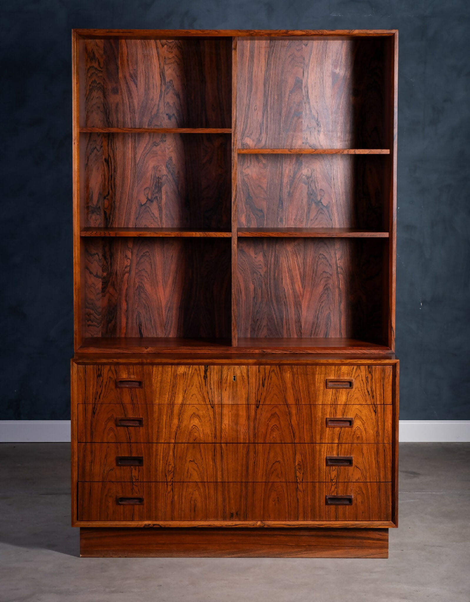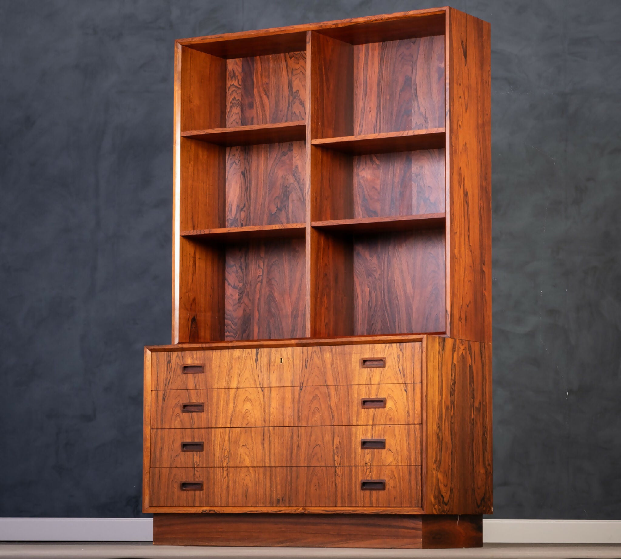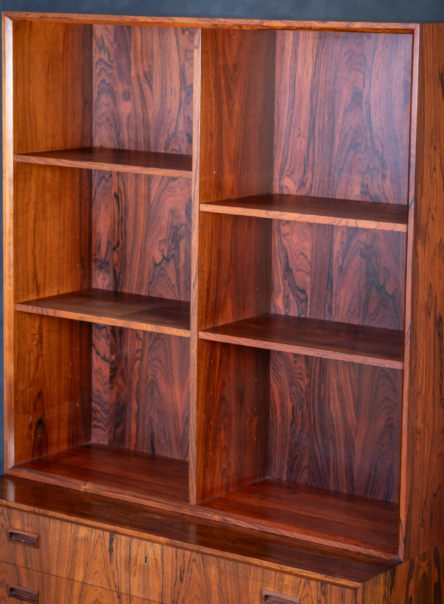 Elegant og funktionel reol designet af Poul Hundevad i 1960’erne, udført i smukt palisander. Reolen rummer fire rummelige skuffer nederst og justerbare hylder øverst – ideel til både opbevaring og udstilling af bøger eller dekorative genstande.