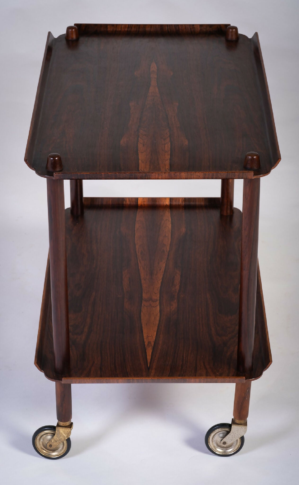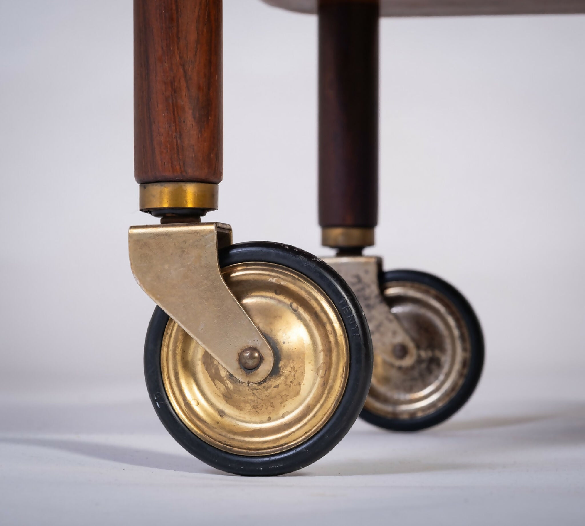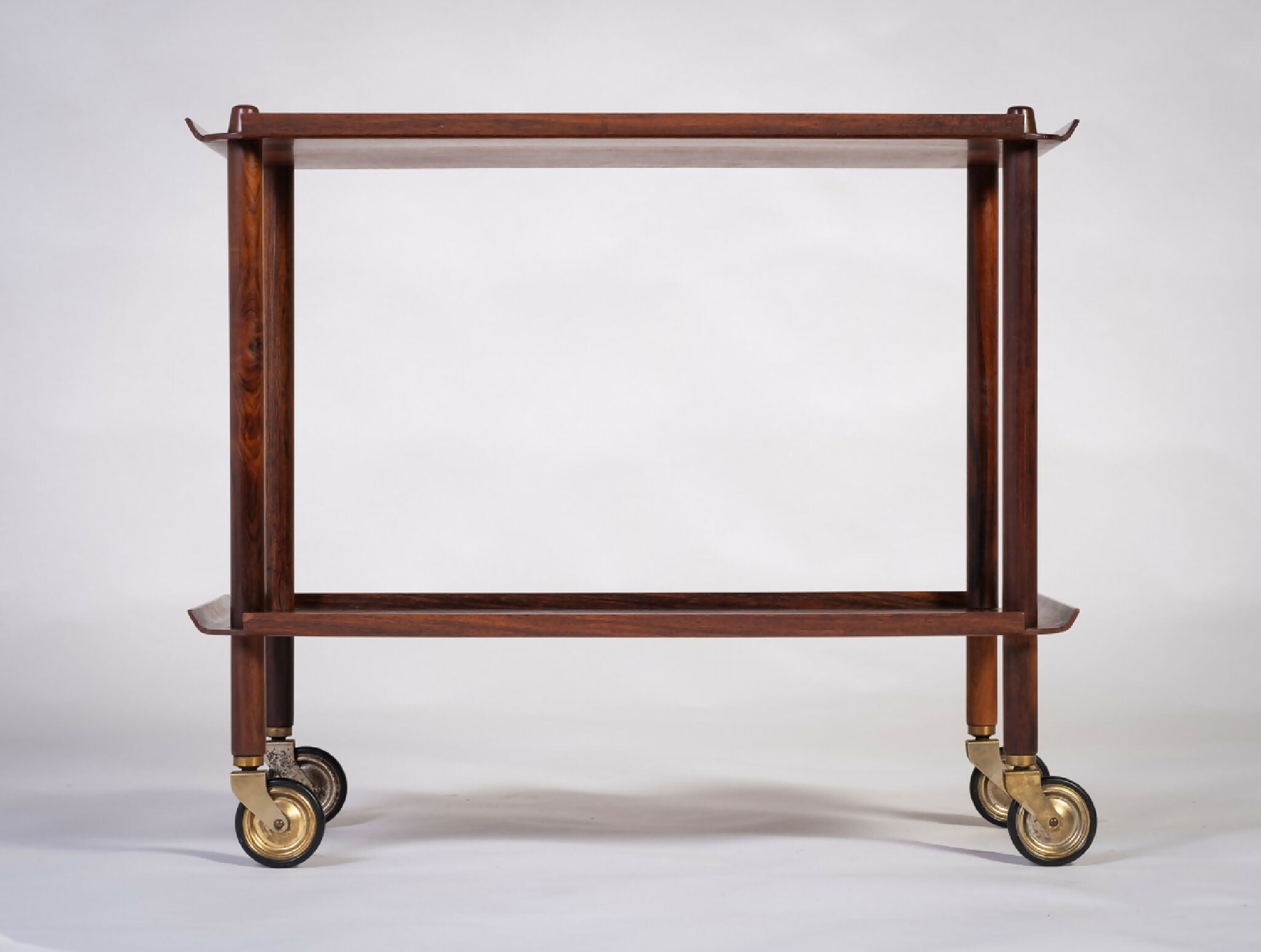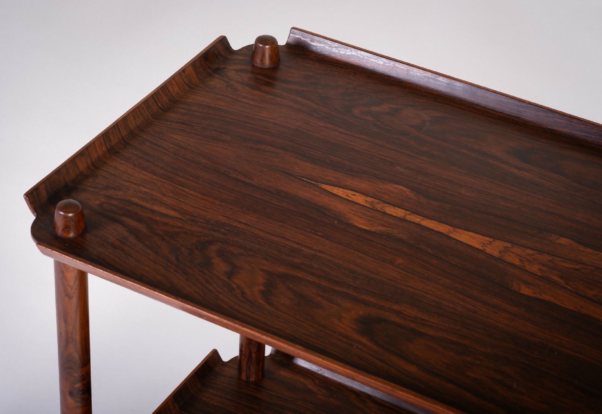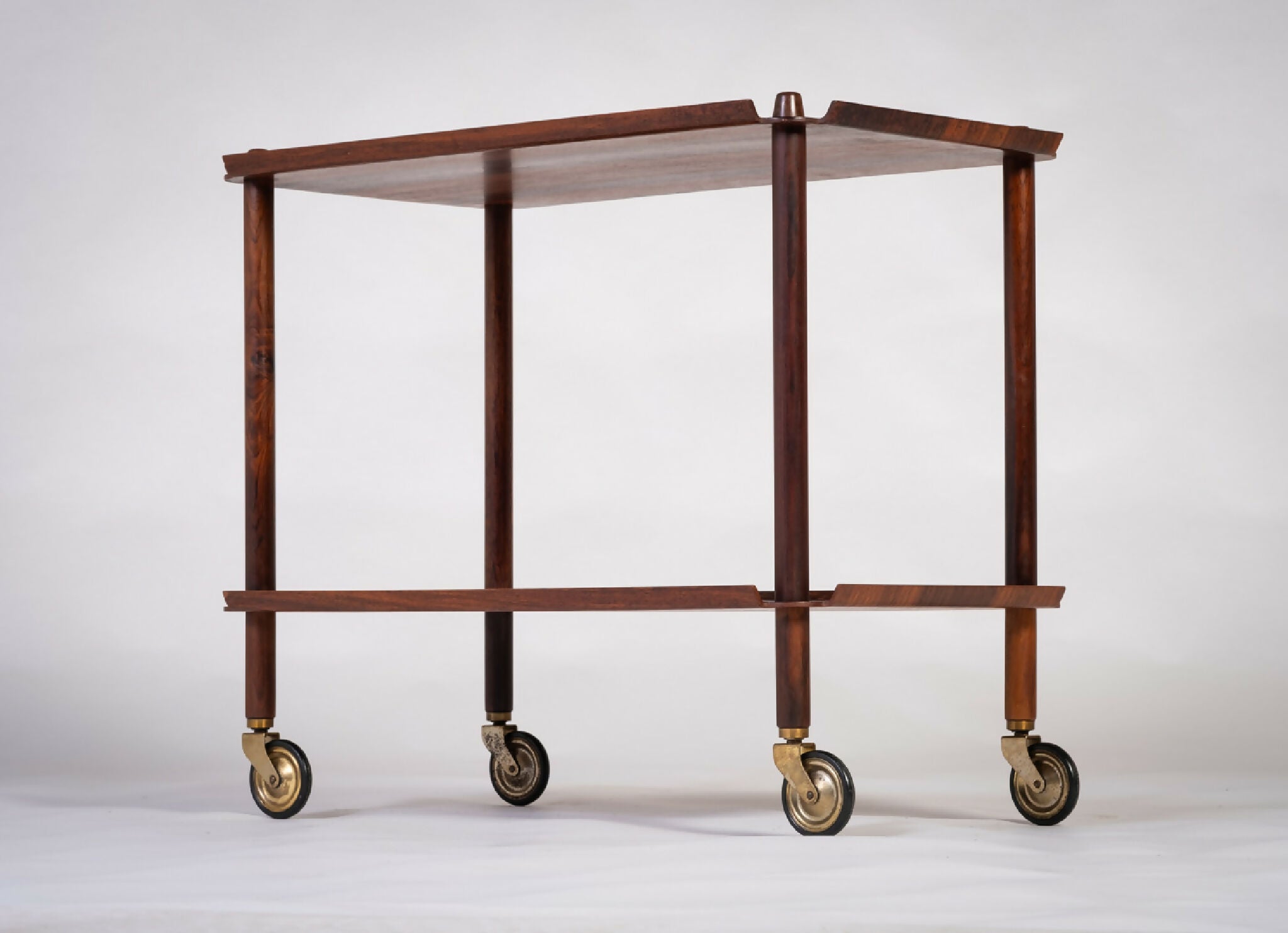 Model serveringsbord designet af Poul Hundevad og fremstillet af Vamdrup Møbelfabrik i 1960’erne. Bordet er udført i smukt palisander med udtagelig bakke og hjul, der kører let og stabilt. Træets markante åretegninger giver et levende og eksklusivt udtryk, og det præcise håndværk vidner om dansk møbelproduktion fra designets guldalder.