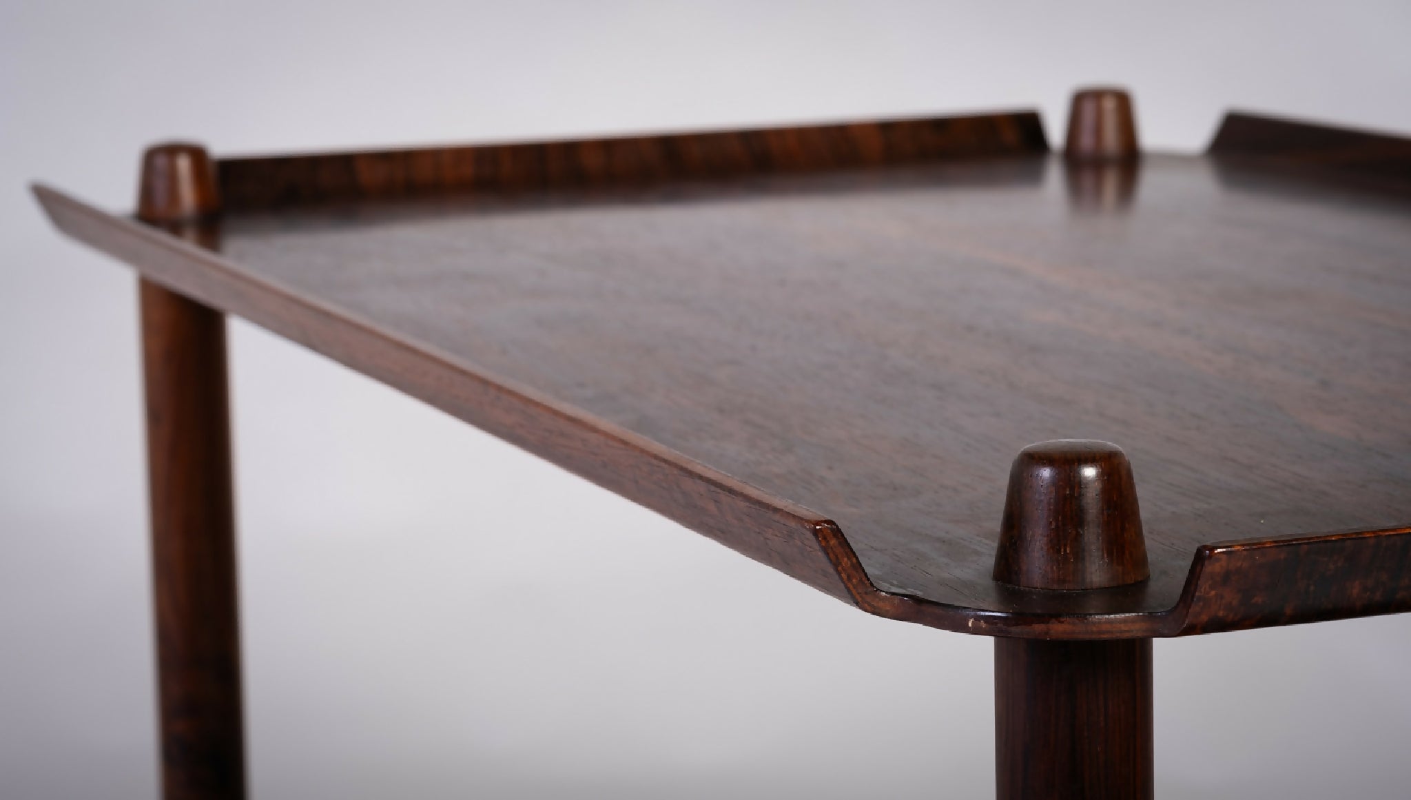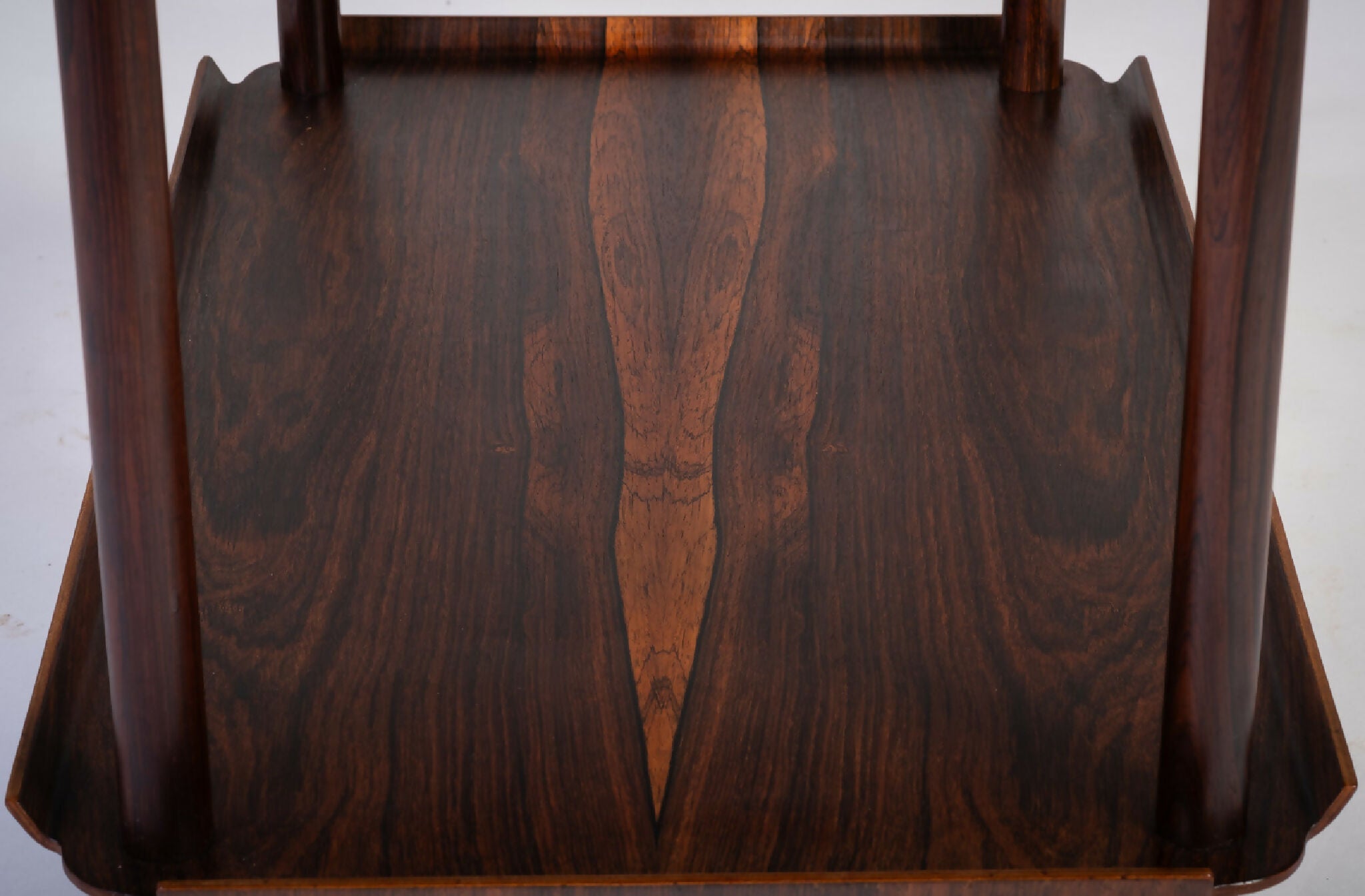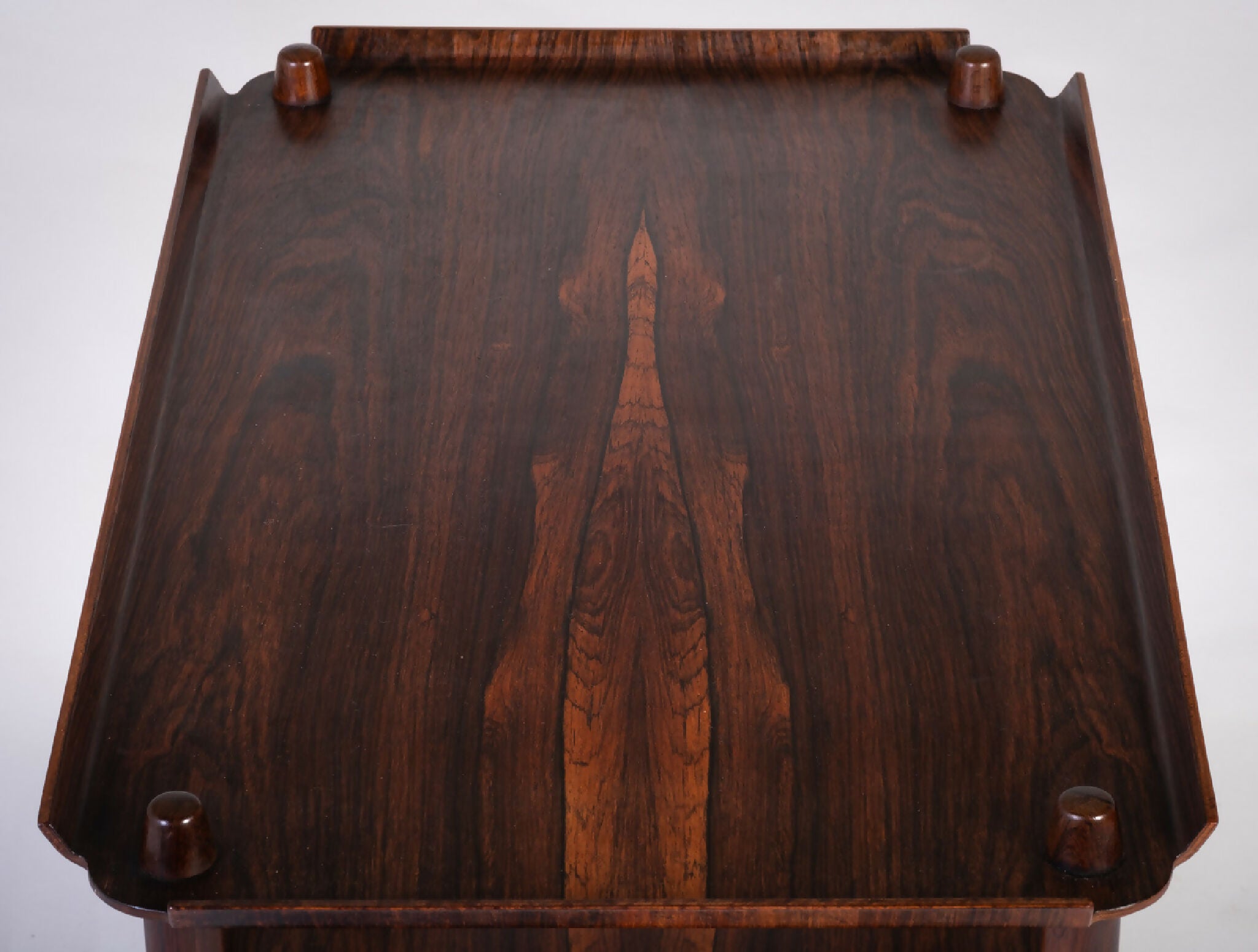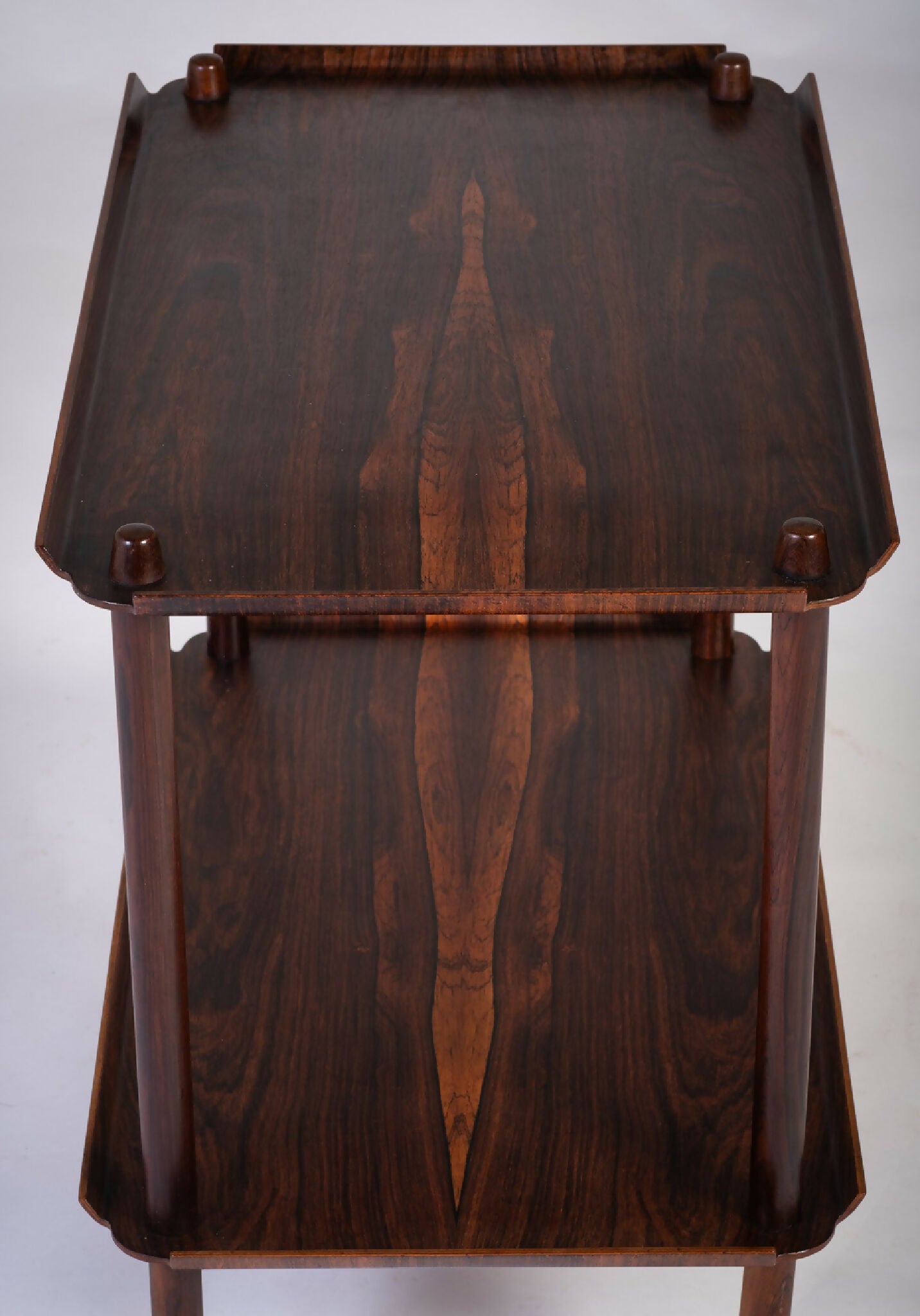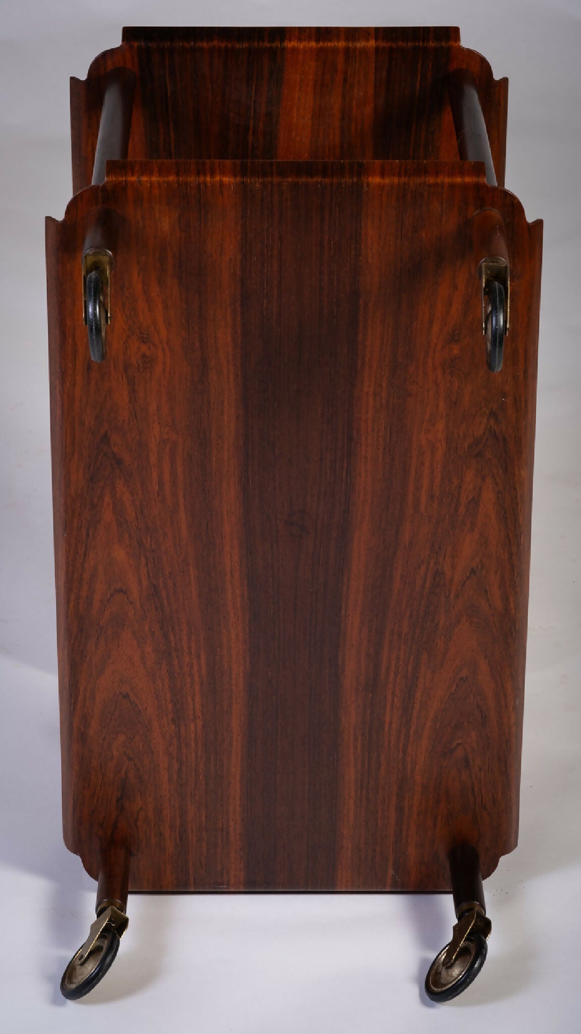 Model serveringsbord designet af Poul Hundevad og fremstillet af Vamdrup Møbelfabrik i 1960’erne. Bordet er udført i smukt palisander med udtagelig bakke og hjul, der kører let og stabilt. Træets markante åretegninger giver et levende og eksklusivt udtryk, og det præcise håndværk vidner om dansk møbelproduktion fra designets guldalder.