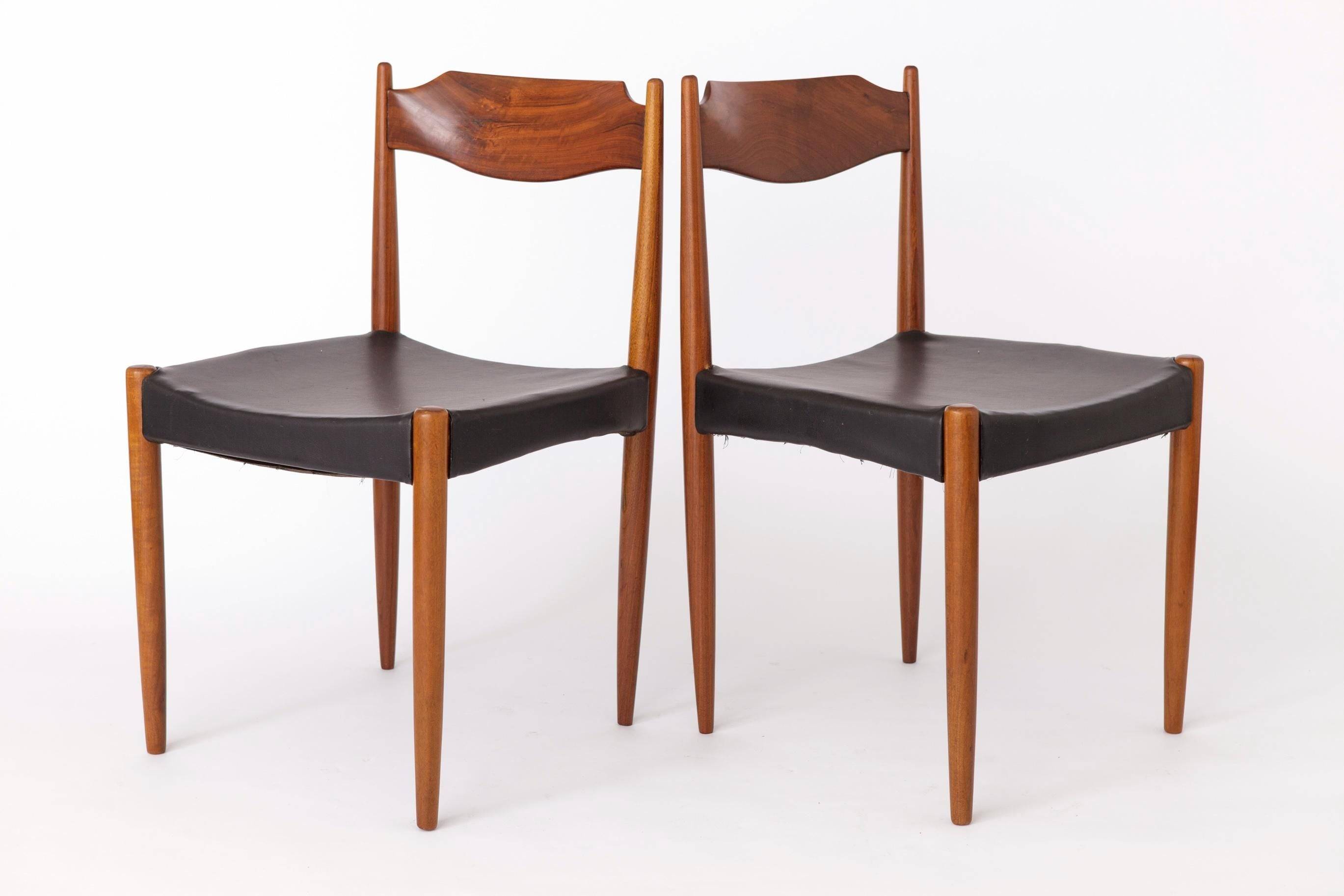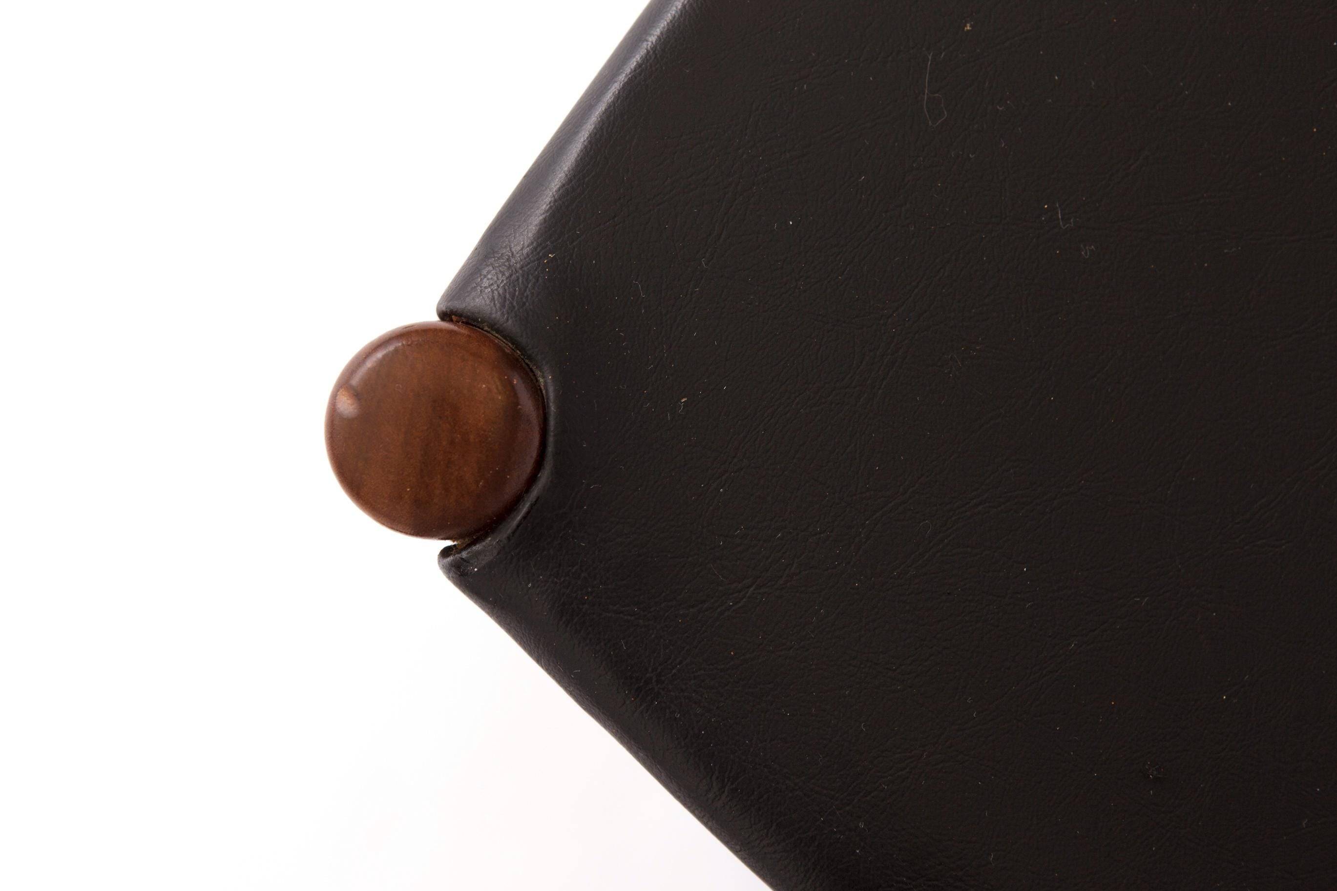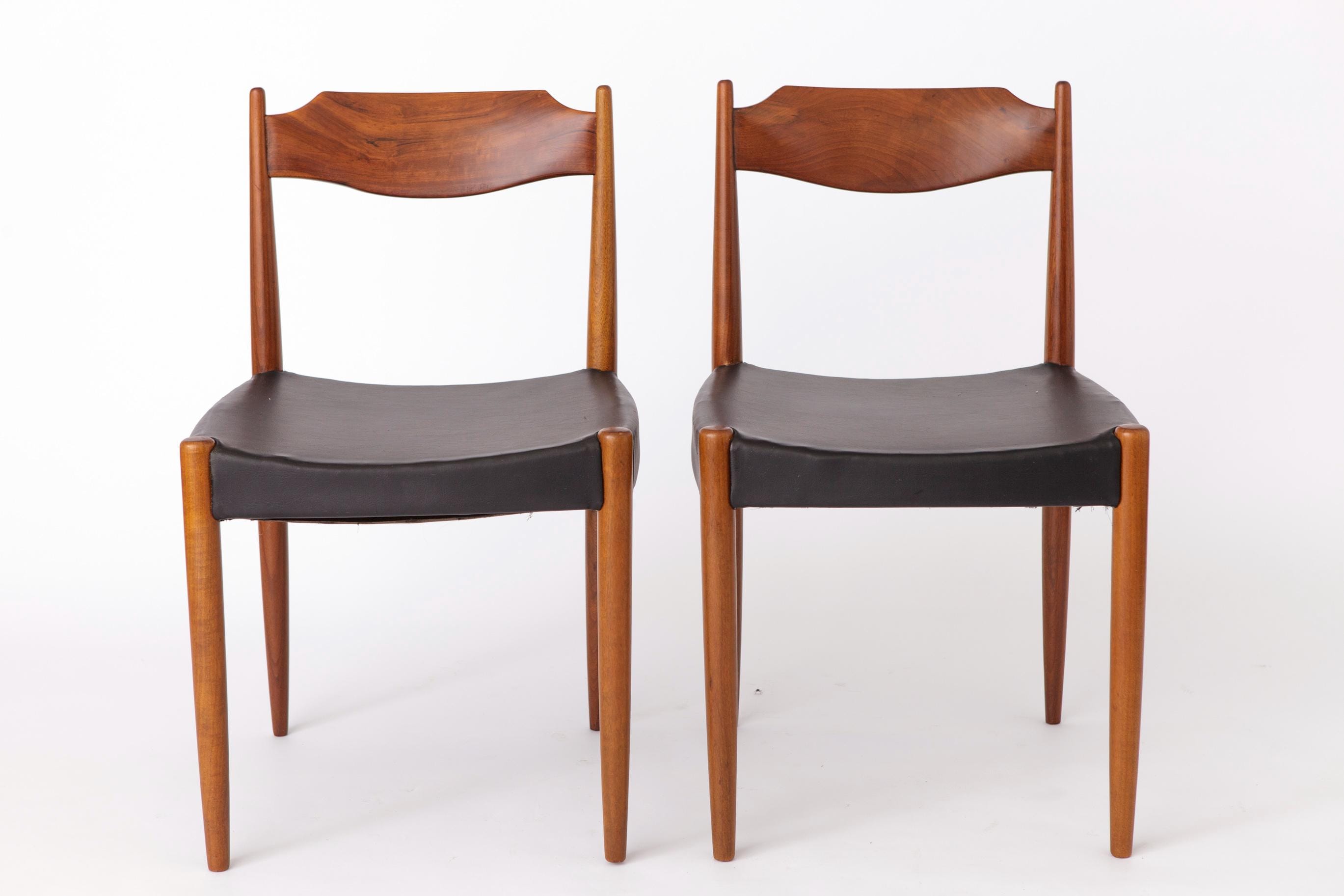 Elegant sæt af to spisebordsstole fra 1960’erne, udført i massivt teaktræ. Stolene er blevet nænsomt renoveret og olieret, så træets smukke glød og struktur fremstår flot bevaret. Sæderne har deres originale betræk i sort skai, som giver et eksklusivt og klassisk udtryk.