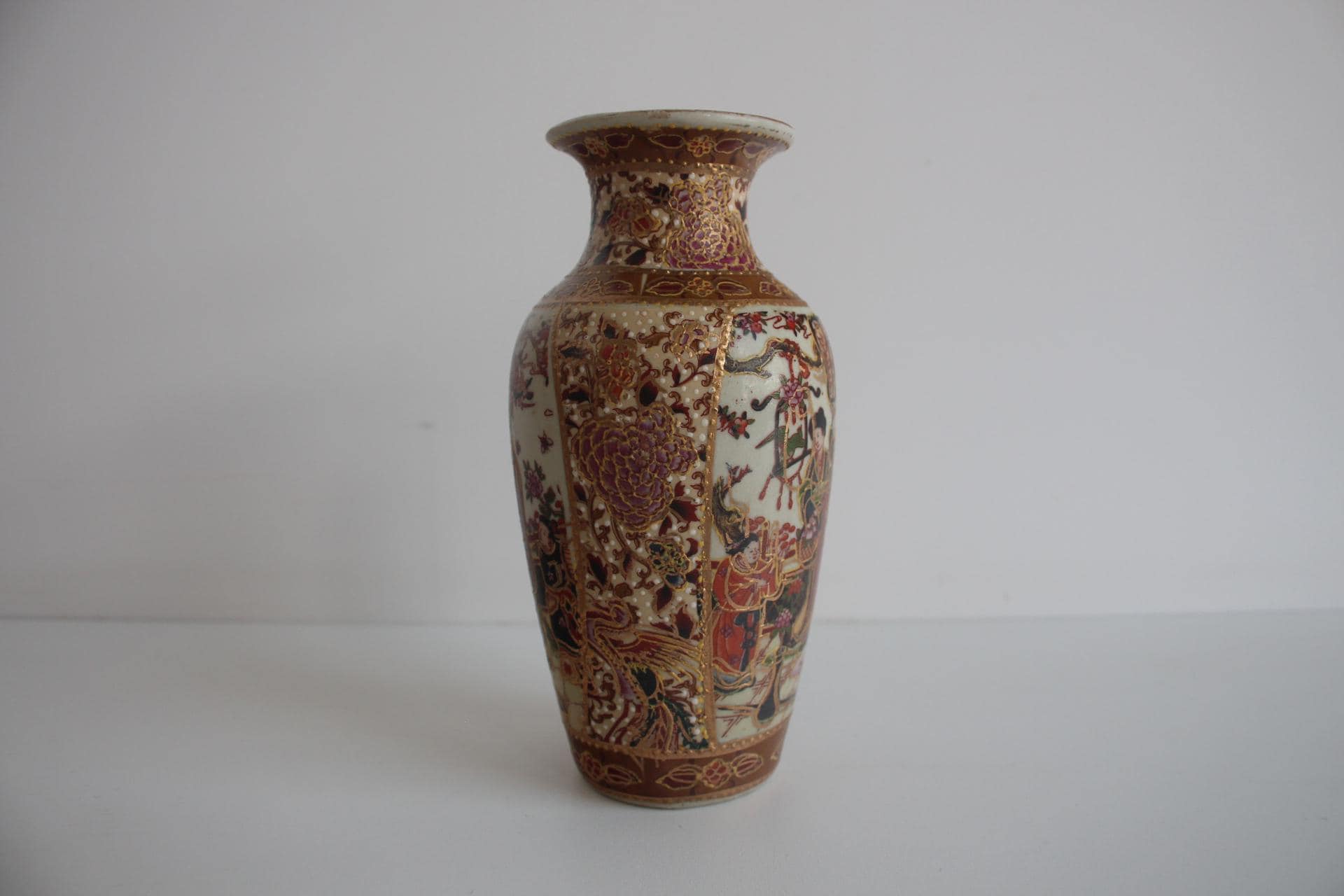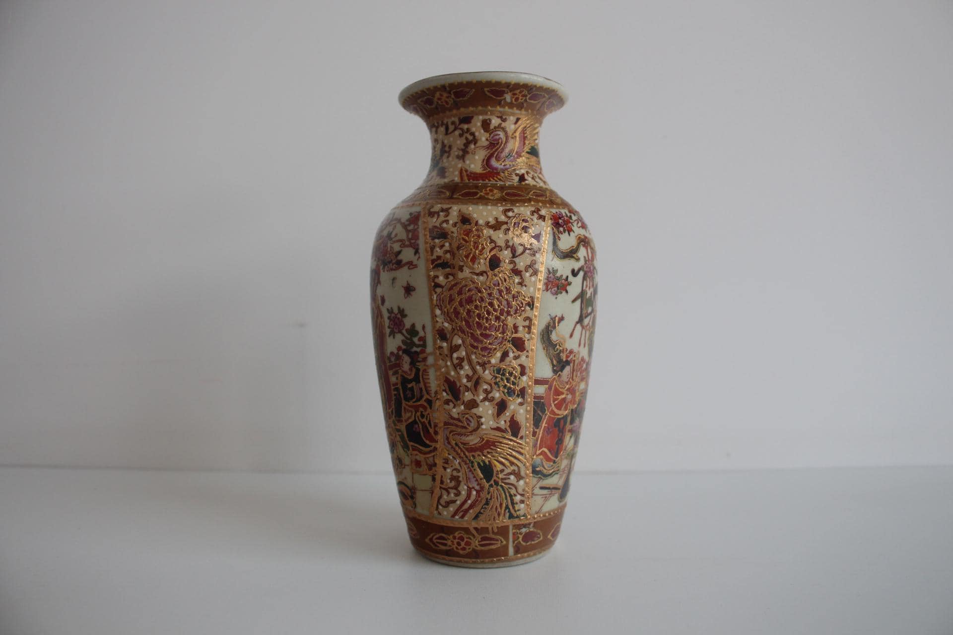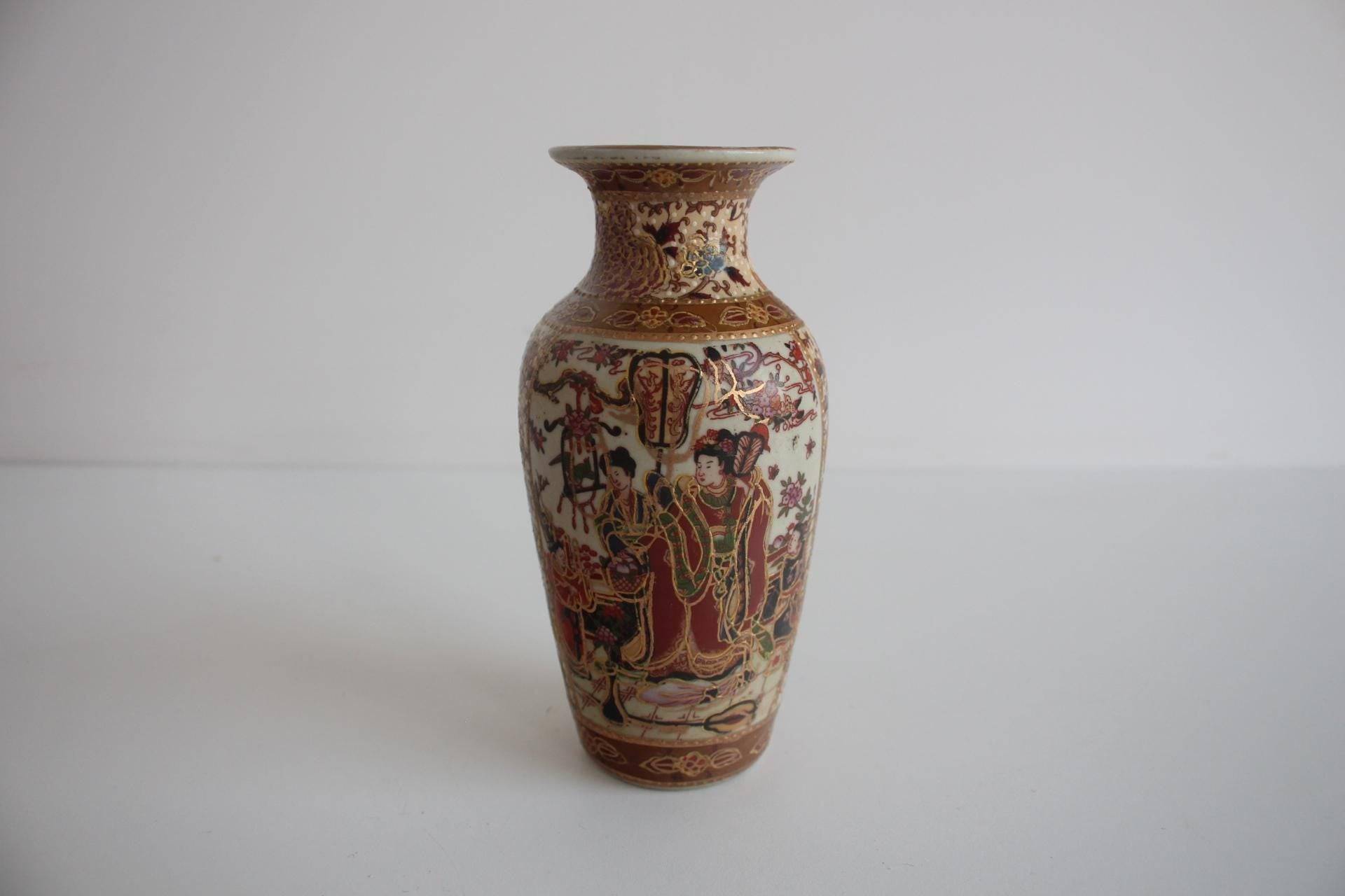 Porcelæns vase fra 1970’erne udført i klassisk Satsuma-stil. Vasen er hånddekoreret med malede scener, hvor figurer i kimonoer indgår i et detaljeret motiv, rigt udsmykket med guld og fine linjer – karakteristisk for Satsuma-keramikken.