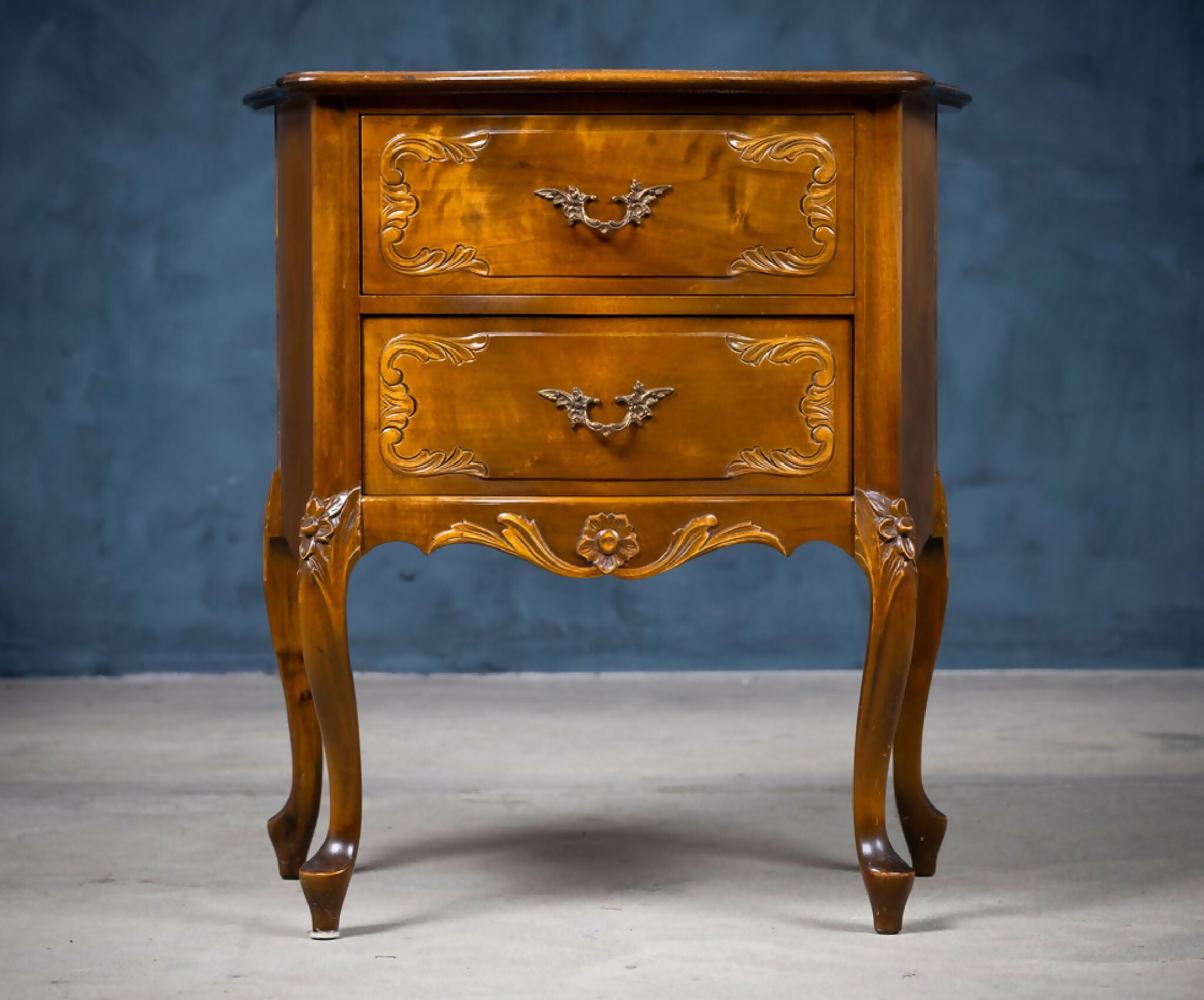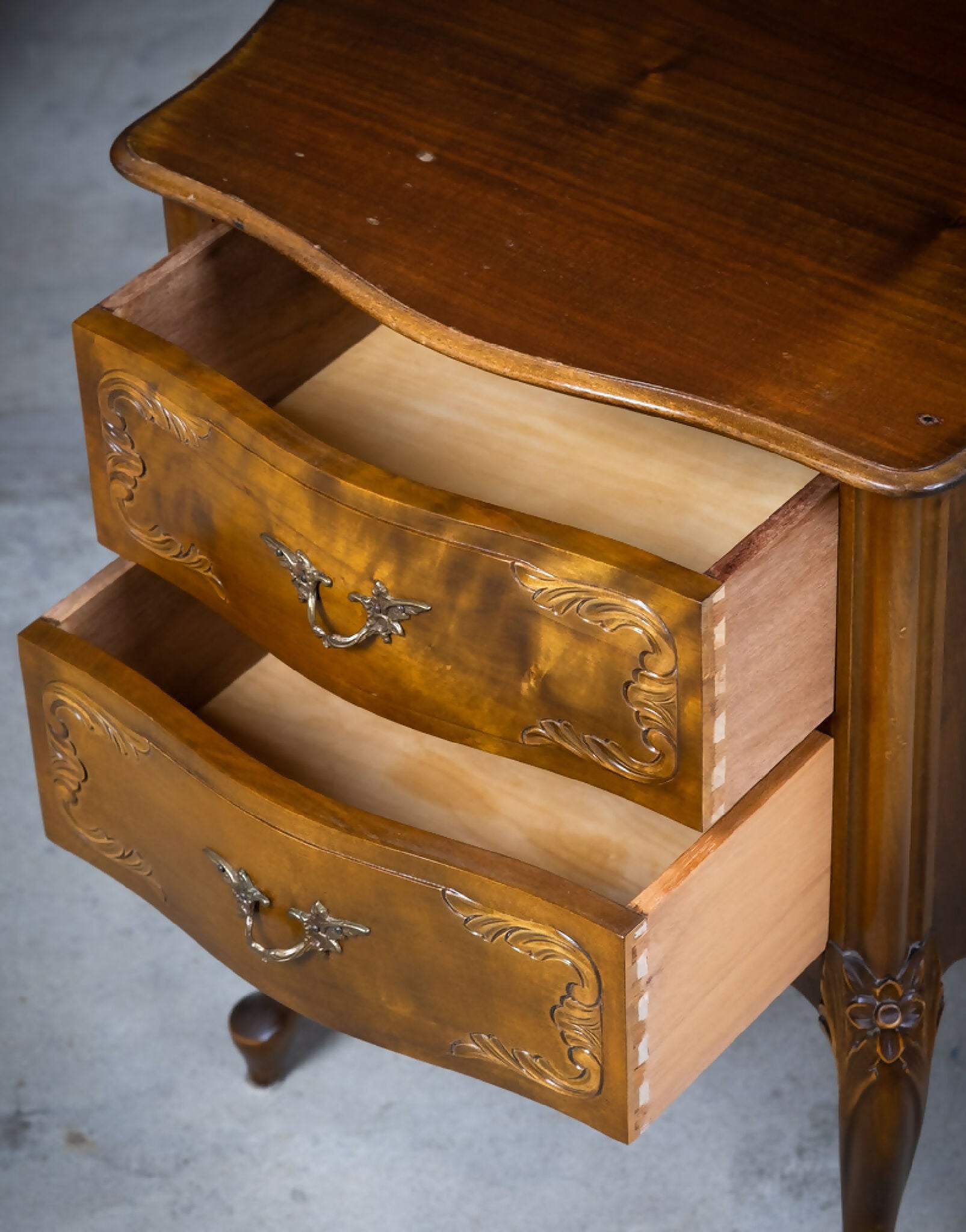 Par sengeborde udført i bøg og skabt i starten af 1900-tallet i klassisk fransk Louis XV-stil. Bordene har to skuffer hver og er udformet med udskårne sideposter, buet sarg og slanke cabrioleben dekoreret med bladmotiv. Formsproget er let og elegant og tilfører rummet et sofistikeret udtryk.