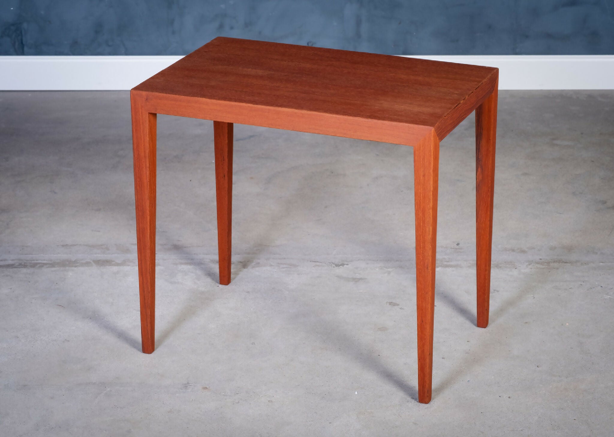 Model indskudsborde designet af Severin Hansen Jr. for Haslev Møbelsnedkeri i 1950’erne. Bordene er udført i massiv teak med de karakteristiske, skråt samlede hjørner og slanke, koniske ben, som vidner om Hansens sans for præcision og proportioner. Det minimalistiske design fremstår let og elegant og kan nemt tilpasses forskellige rum og funktioner.
